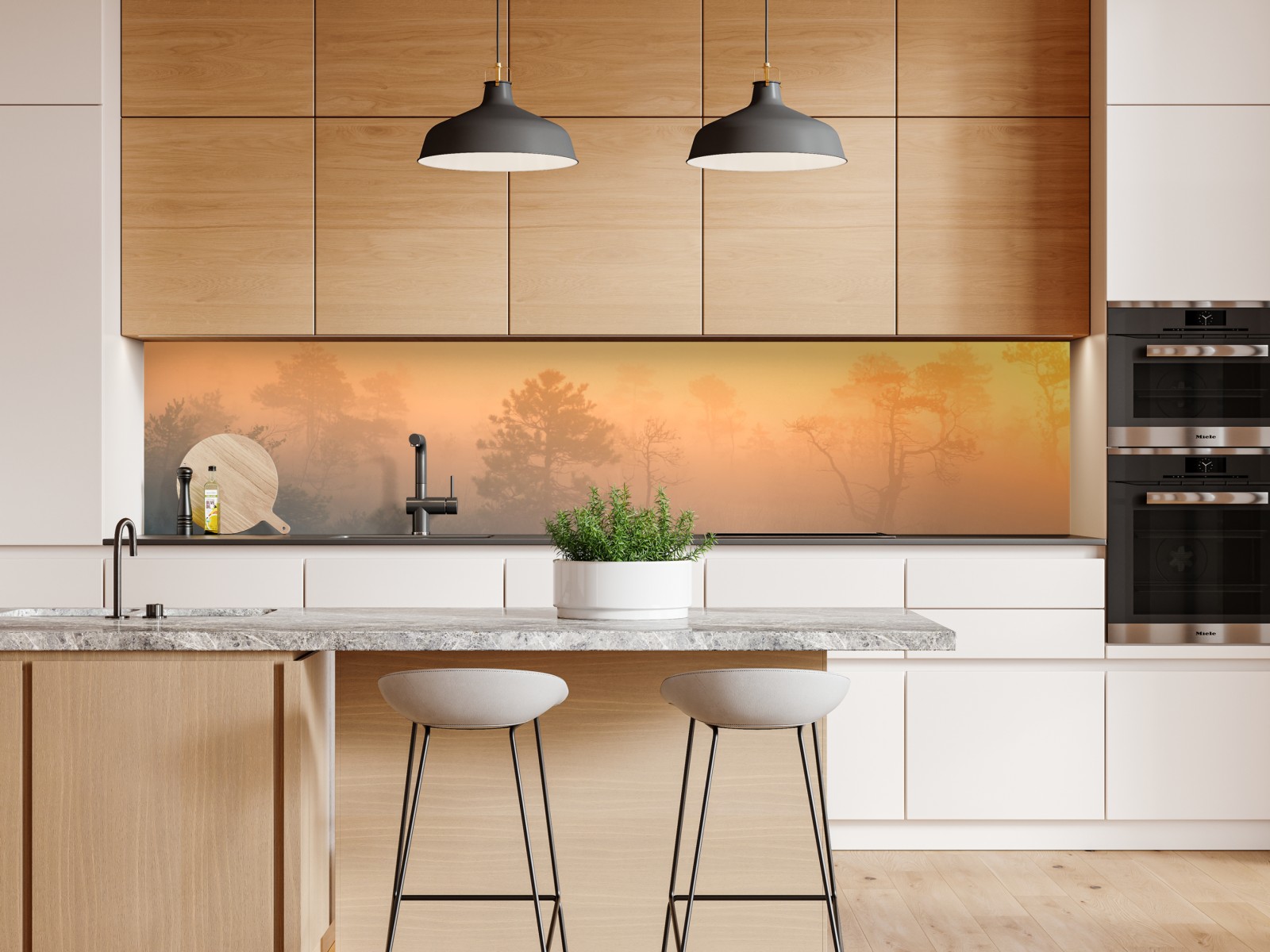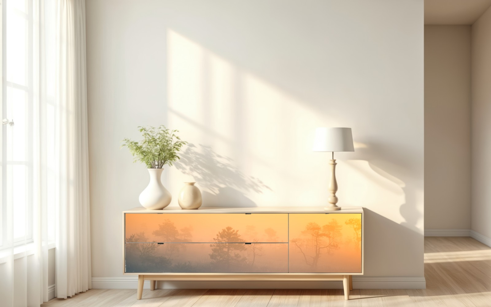 Ein träumerischer nebelverhangener Moormorgen im goldenen Licht, ideal für ruhige, naturnahe Wohnräume.