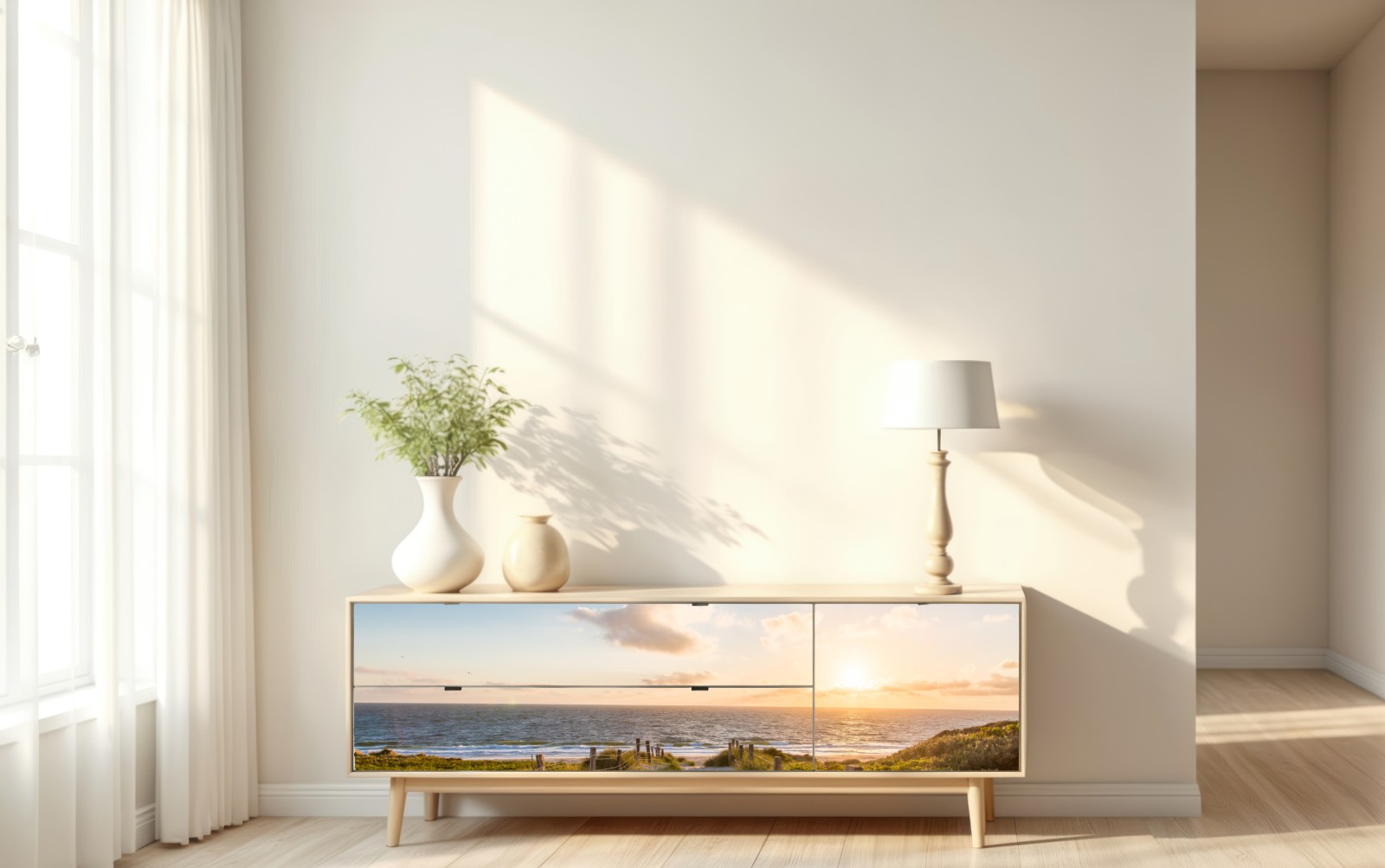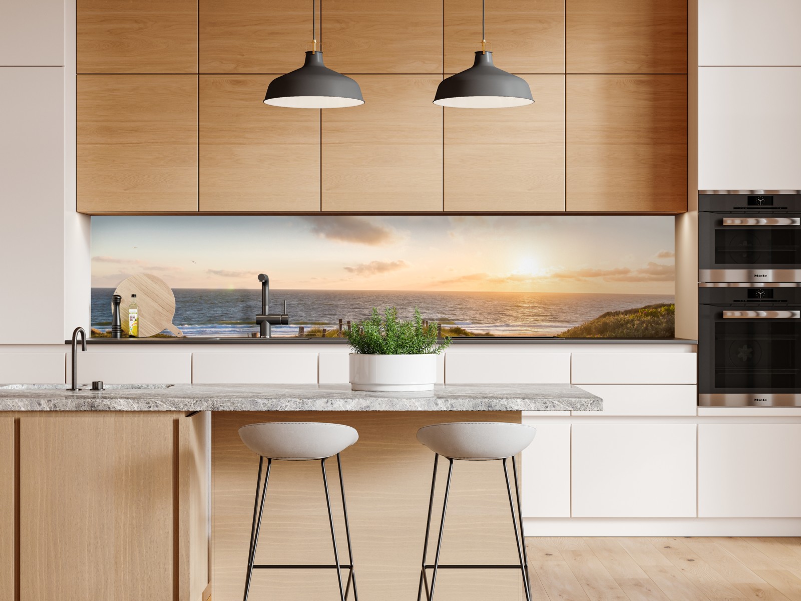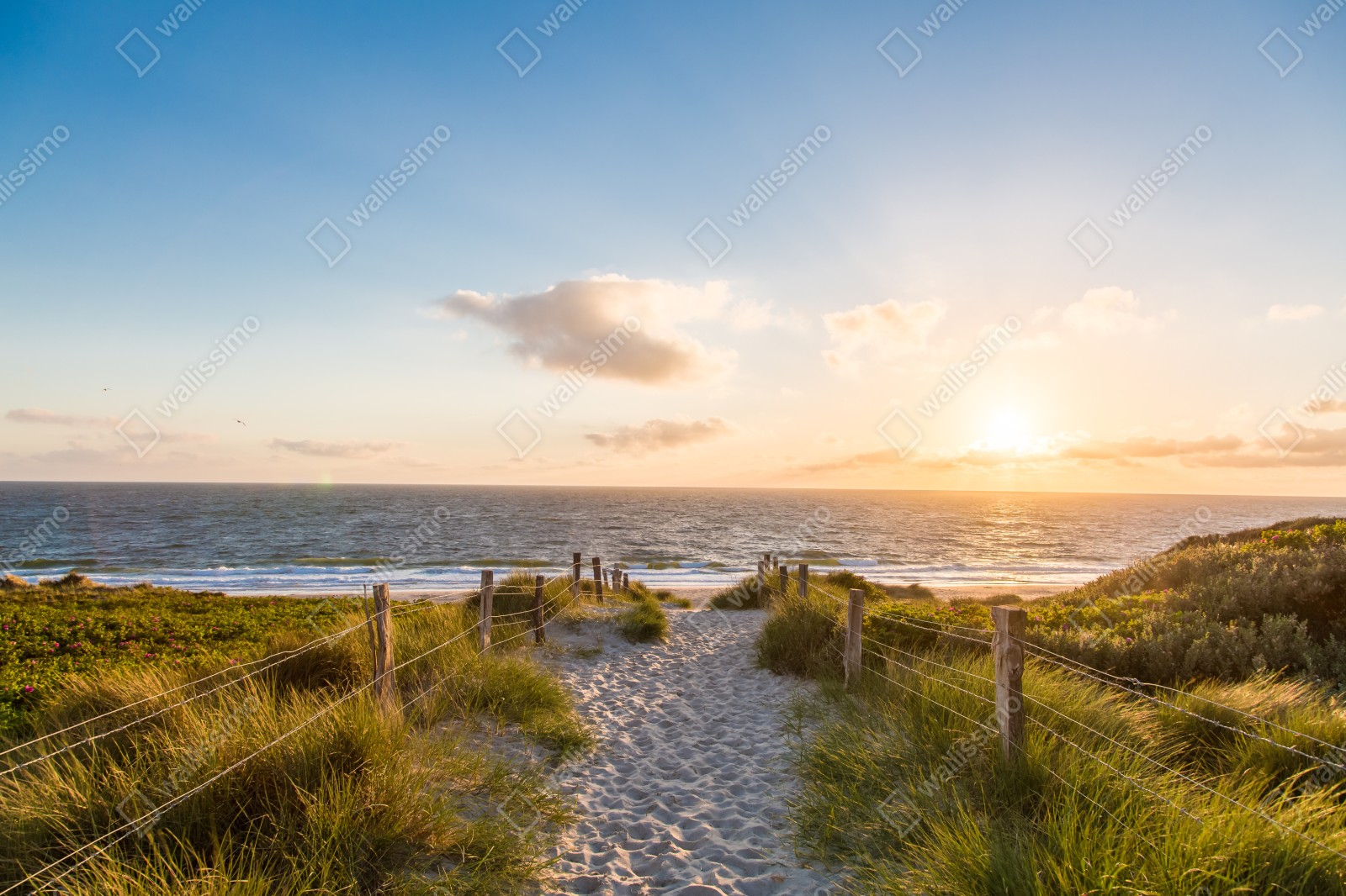 Ein ruhiger, sonnenbeschienener Strandweg zum Meer mit warmen Goldtönen des Sonnenuntergangs, perfekt für eine entspannte maritime Atmosphäre.
