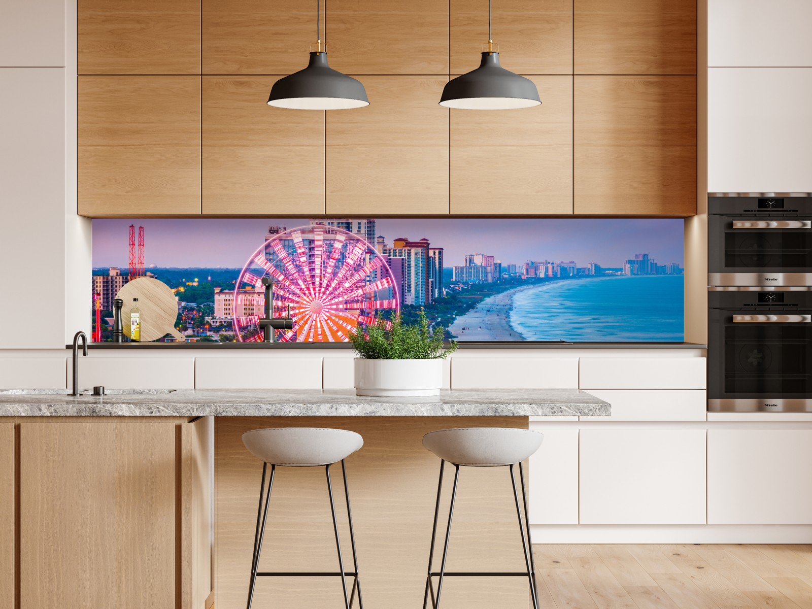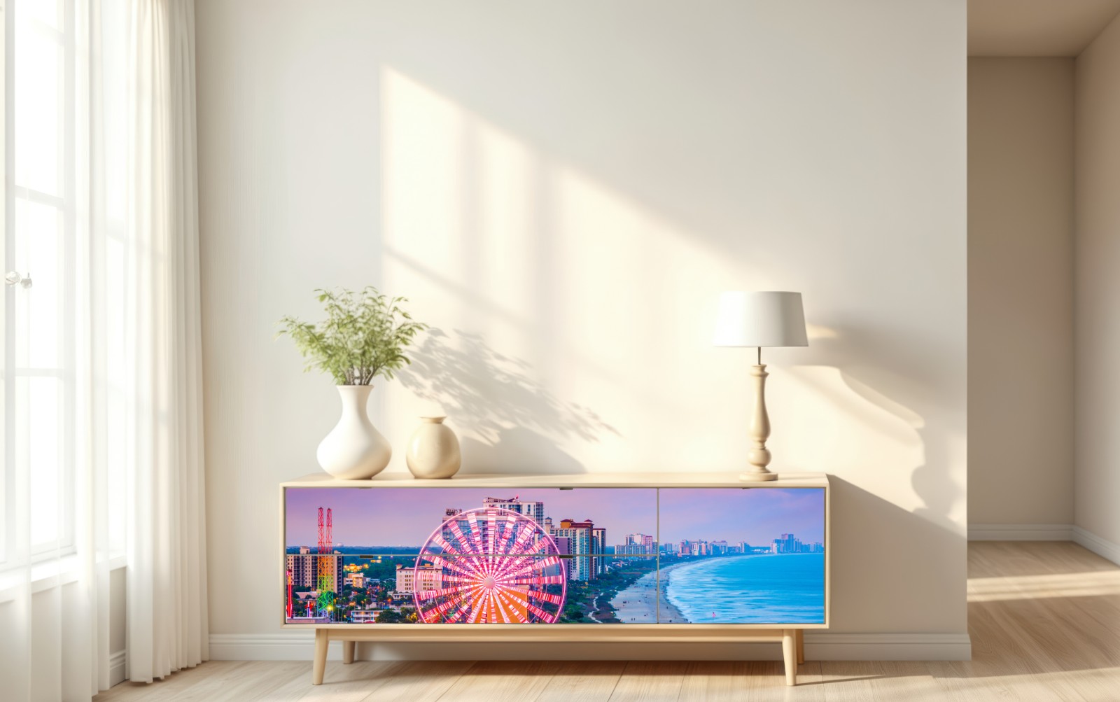 Lebhafte küstenstadt bei dämmerung mit leuchtendem riesenrad, strand und ruhigem meer, perfekte wanddekoration für moderne räume.