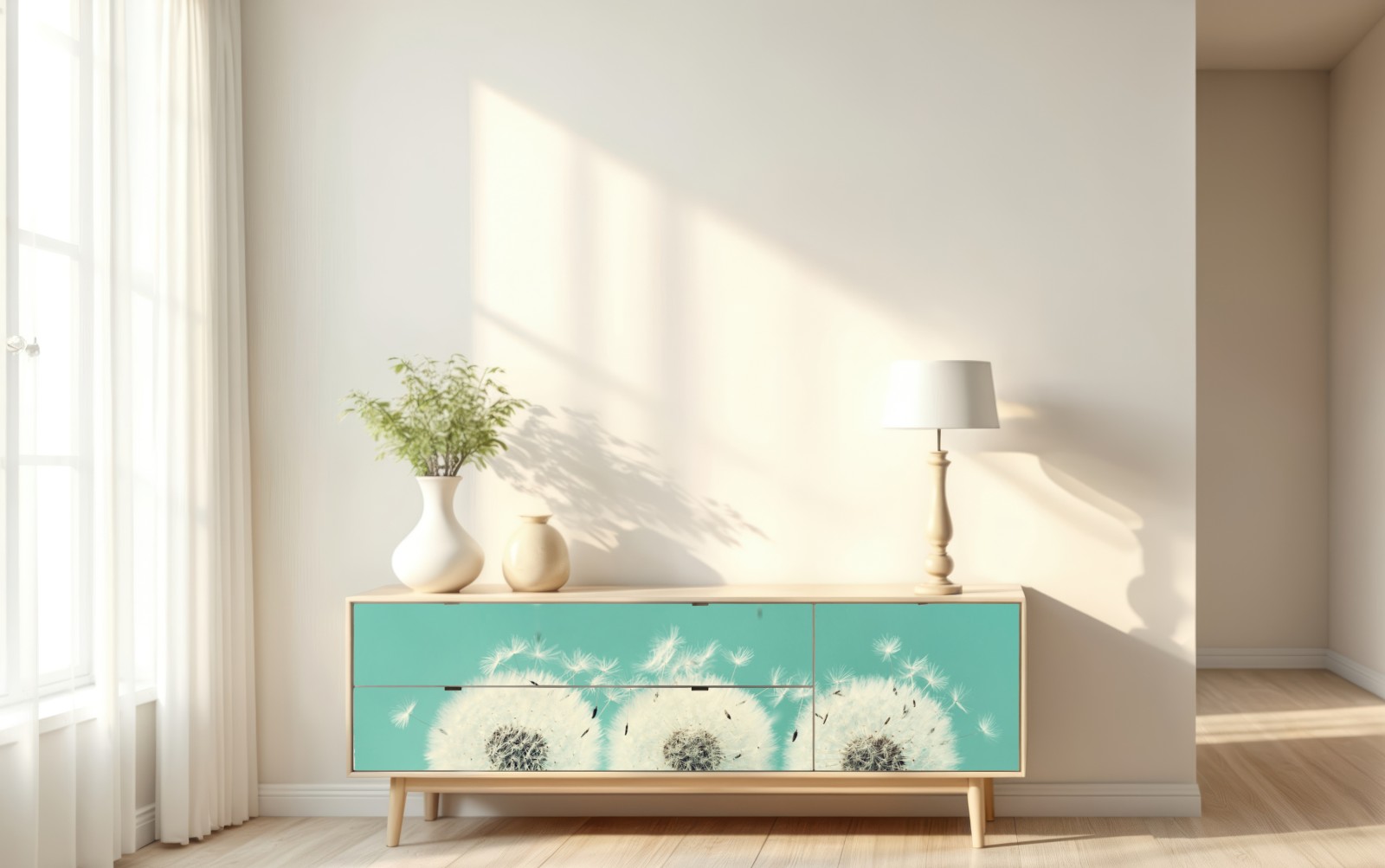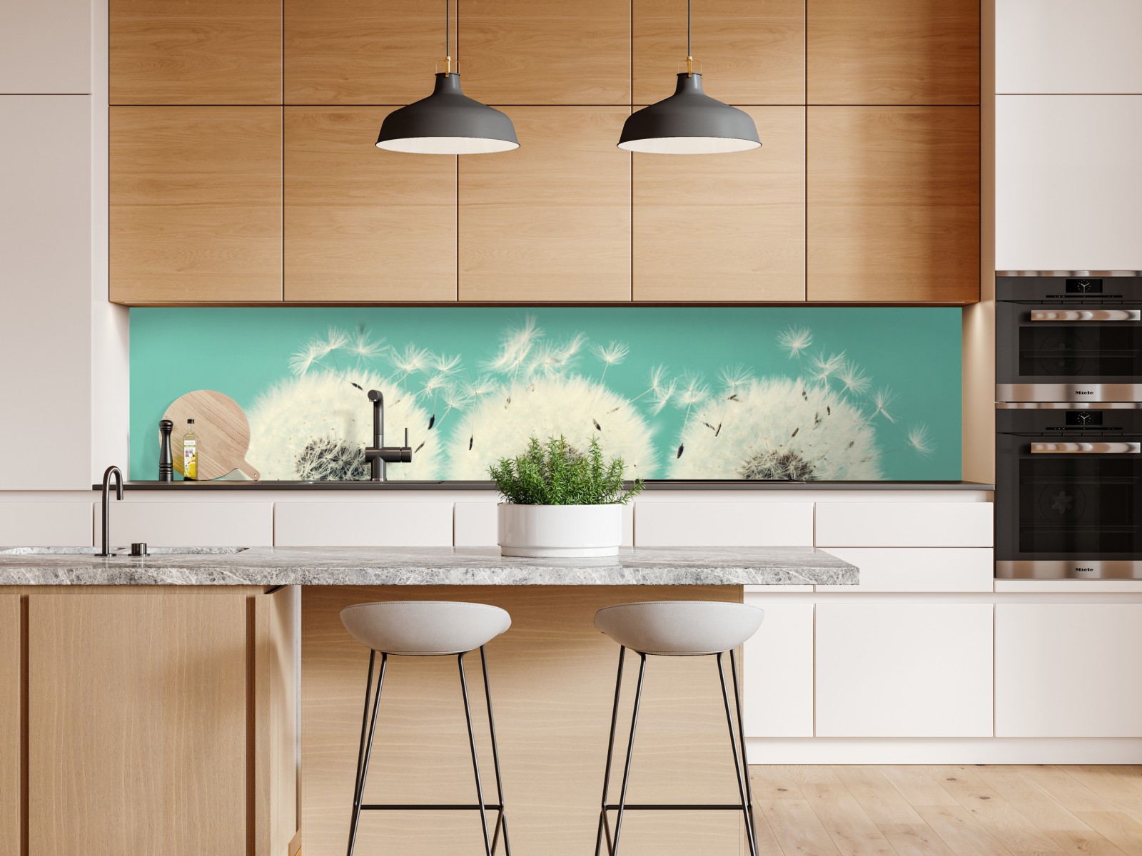 Zarte Pusteblumen schweben vor einem beruhigenden türkisfarbenen Hintergrund und verleihen jedem Raum eine leichte, luftige Atmosphäre.