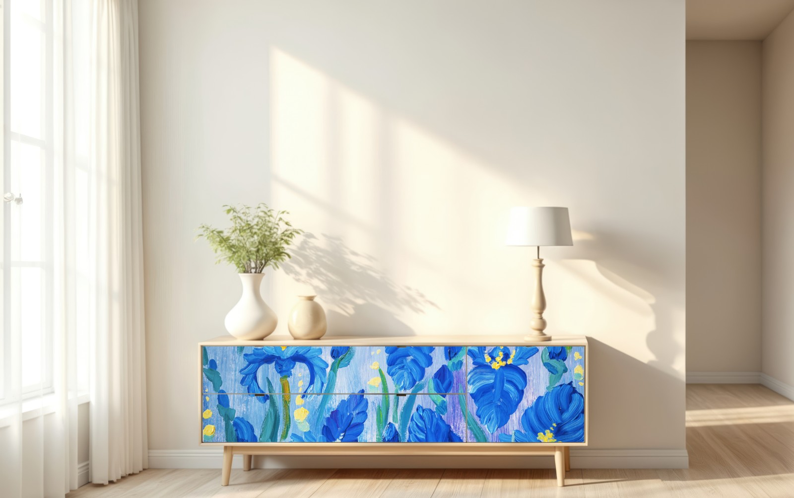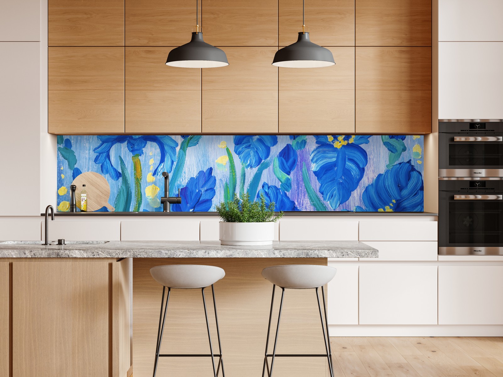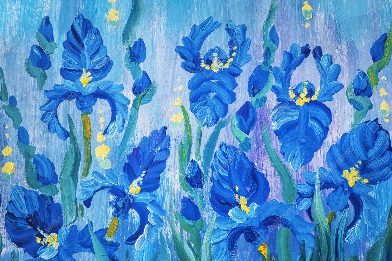 Ein eindrucksvolles Ölgemälde mit kräftigen blauen Irisblüten, das jedem Raum lebendige Farbe und botanische Eleganz verleiht.