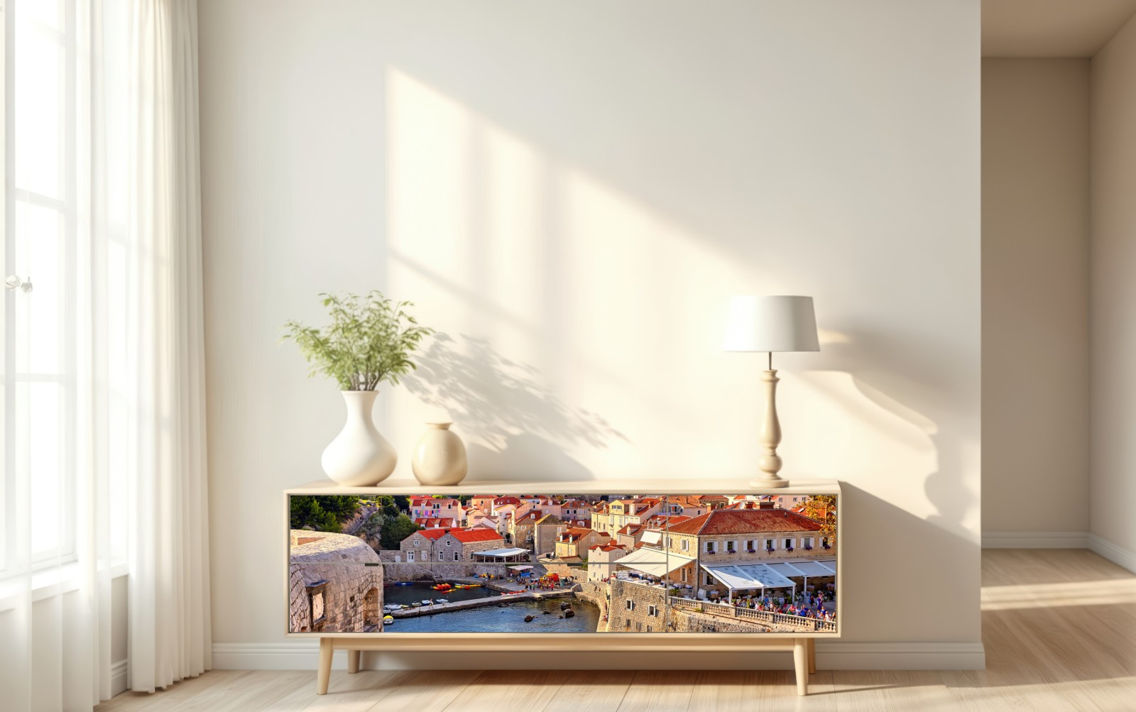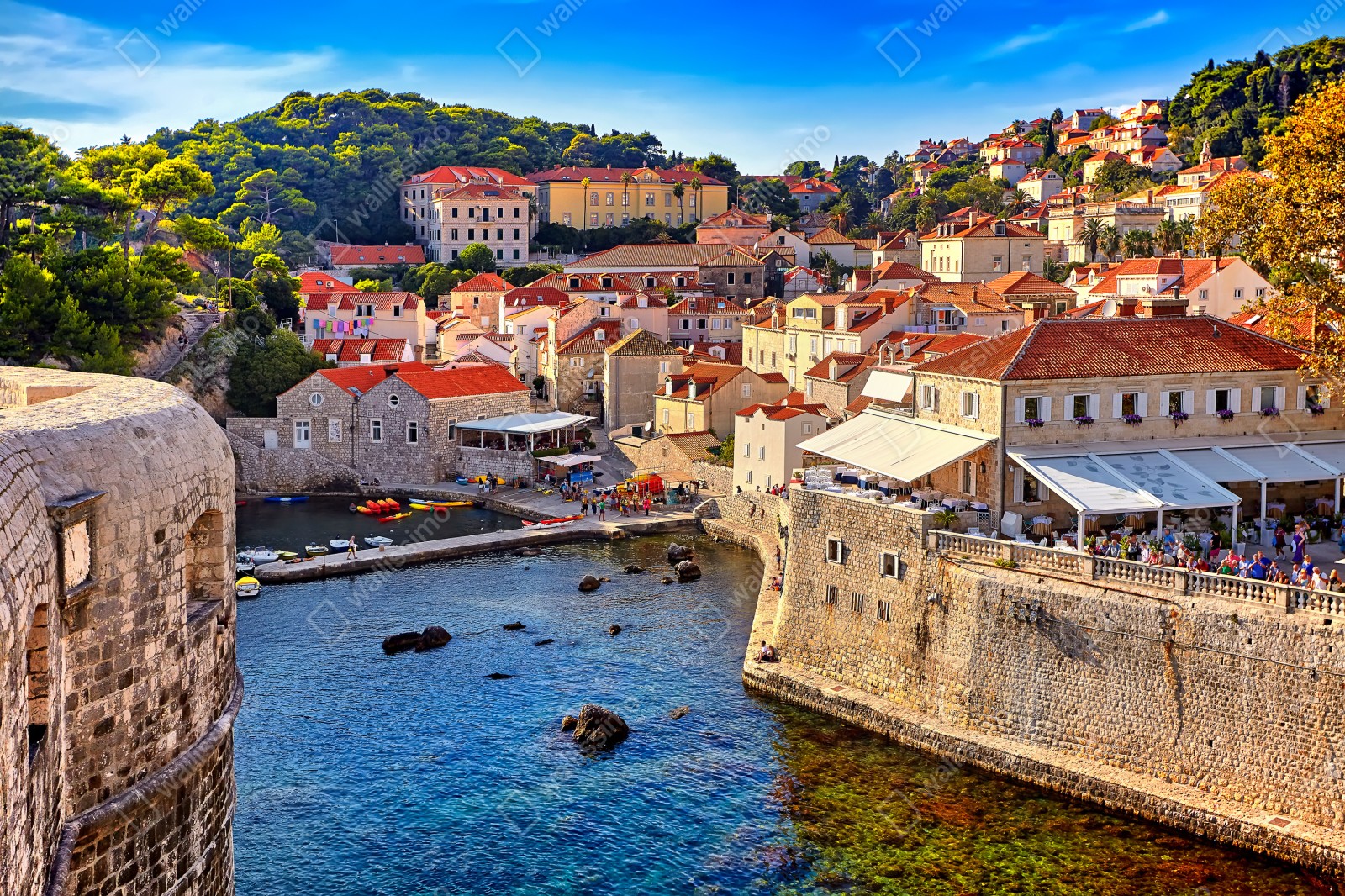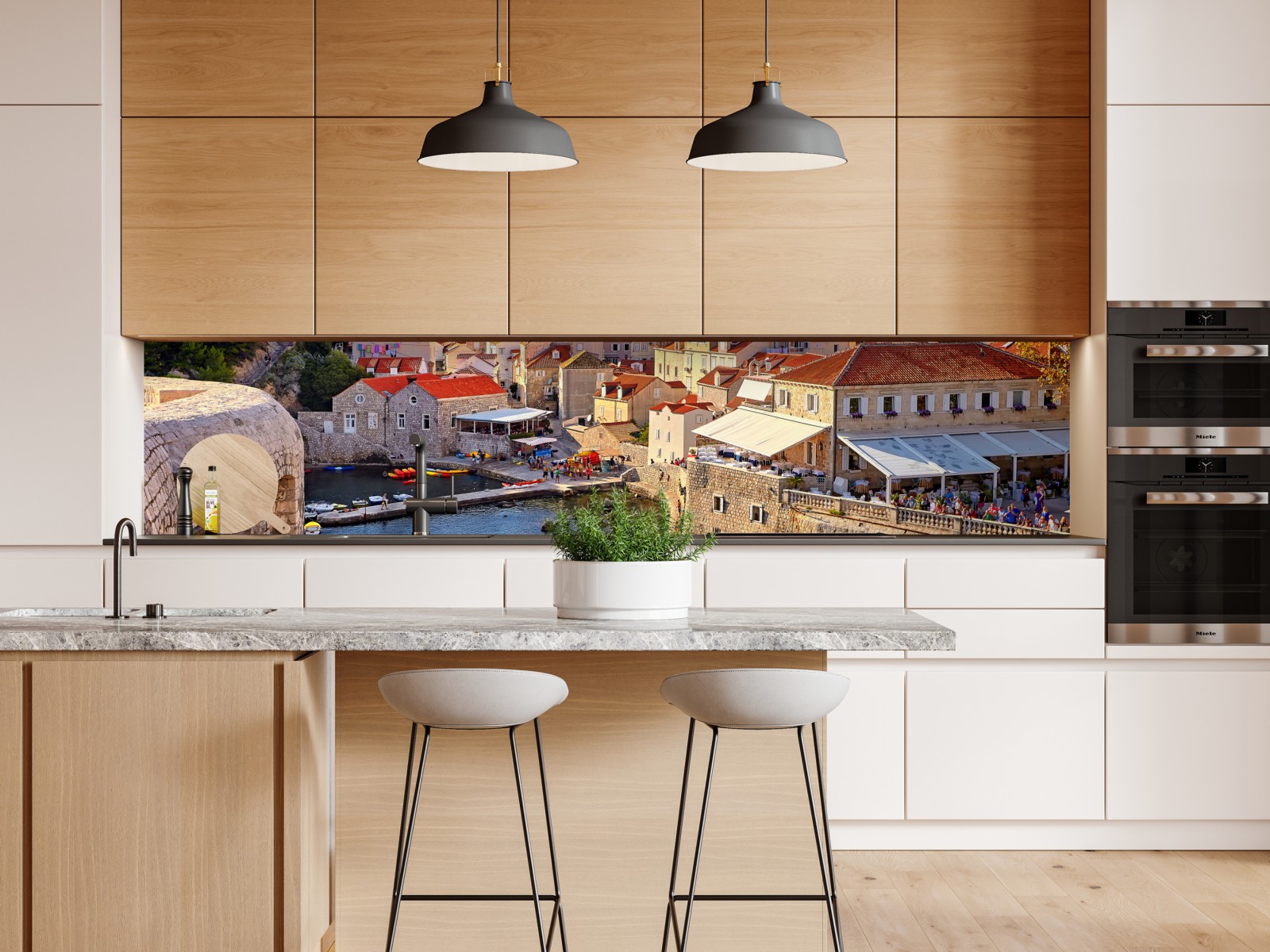Lebendiger Blick auf Dubrovniks historische Mauern und ziegelrote Dächer über dem klaren Adriatischen Meer, der jeden Raum erhellt.