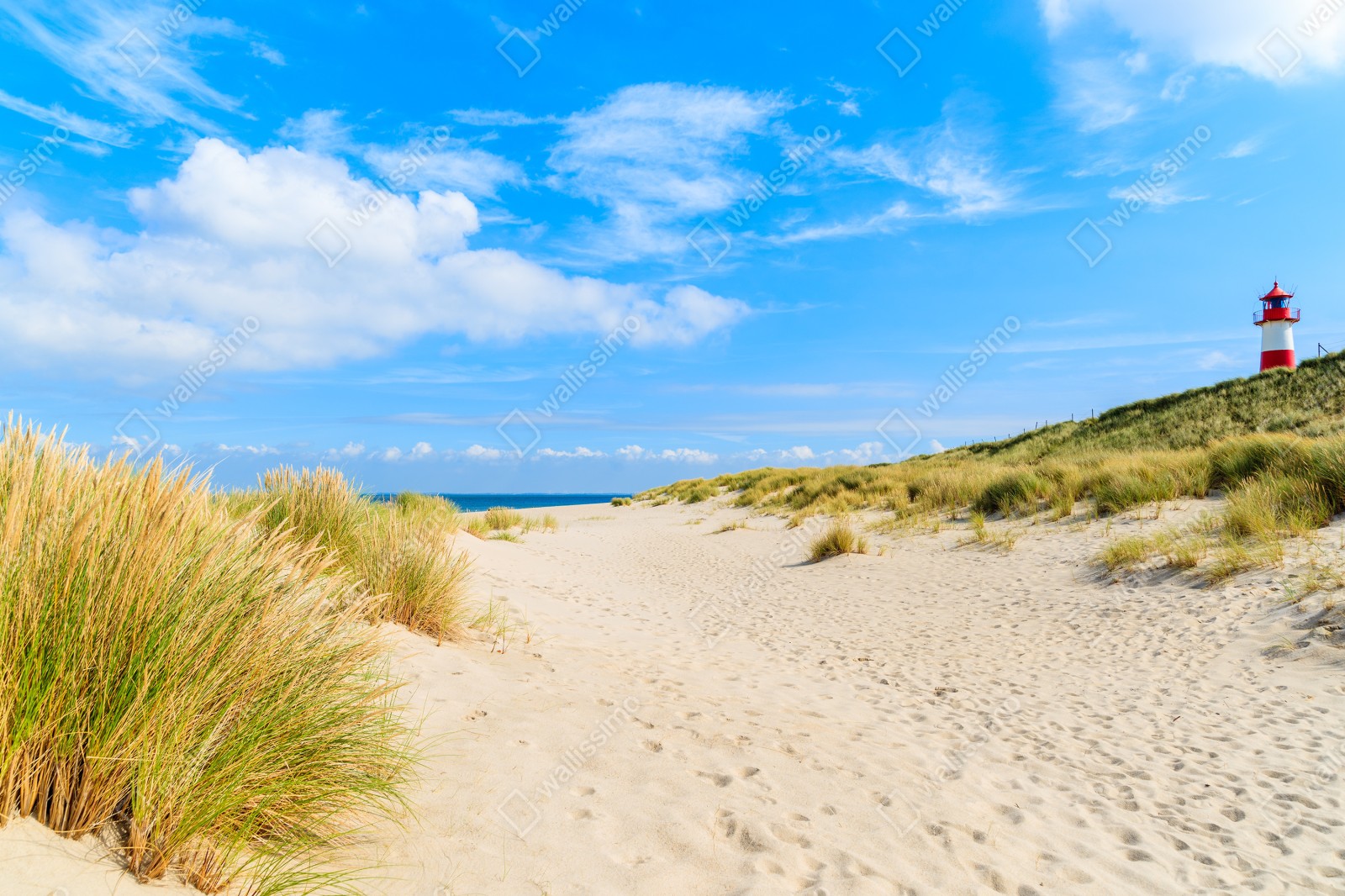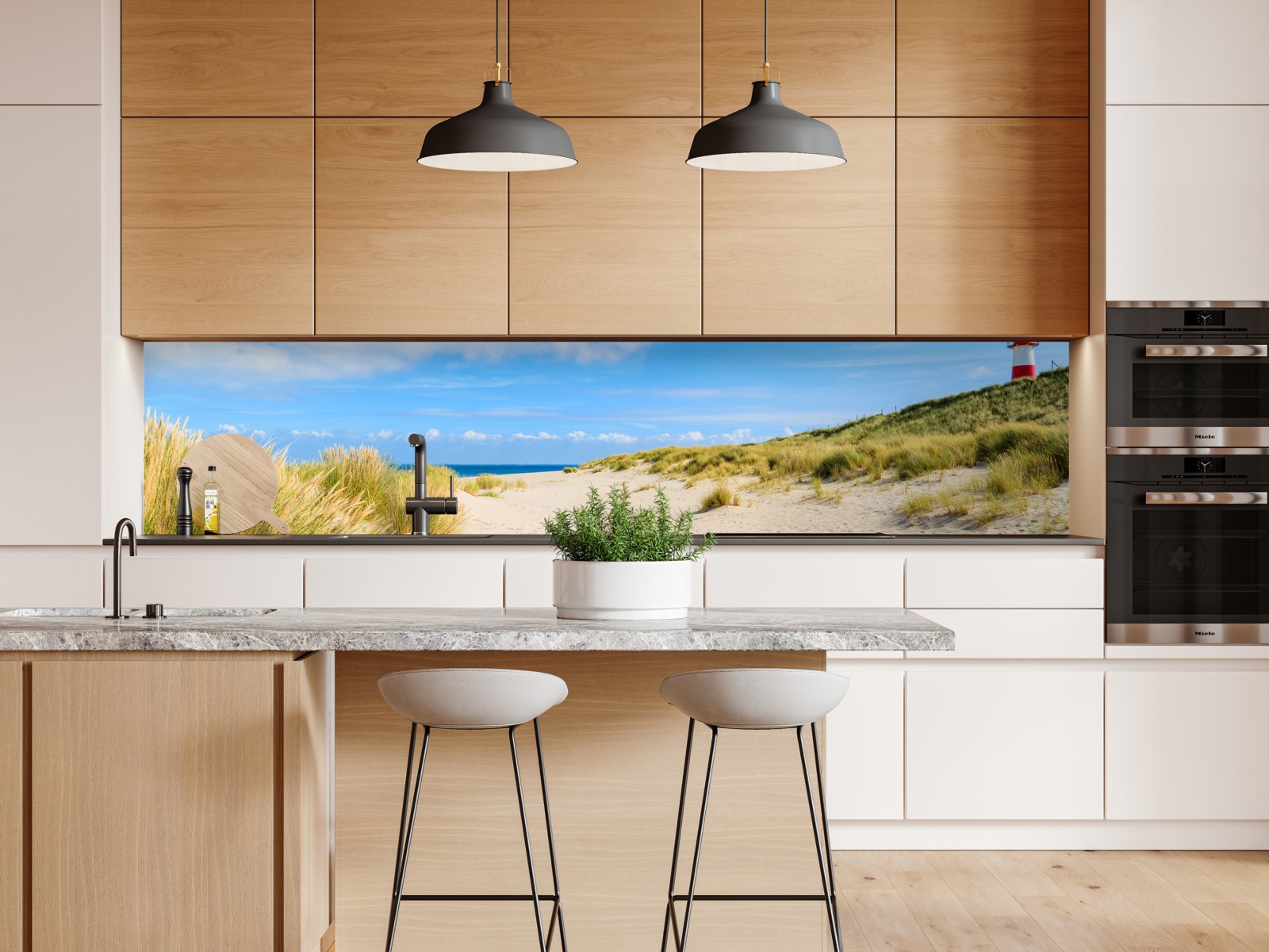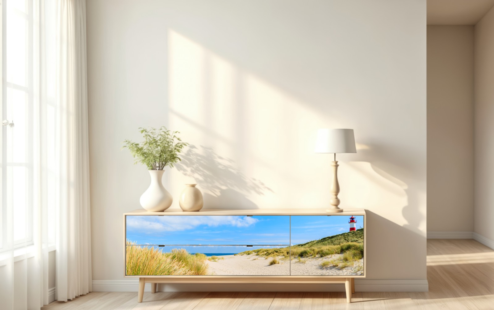 Eine beruhigende Küstenszene mit Sanddünen, Strandgras und einem entfernten Leuchtturm unter strahlend blauem Himmel, perfekt um maritimes Flair ins Zuhause zu bringen.