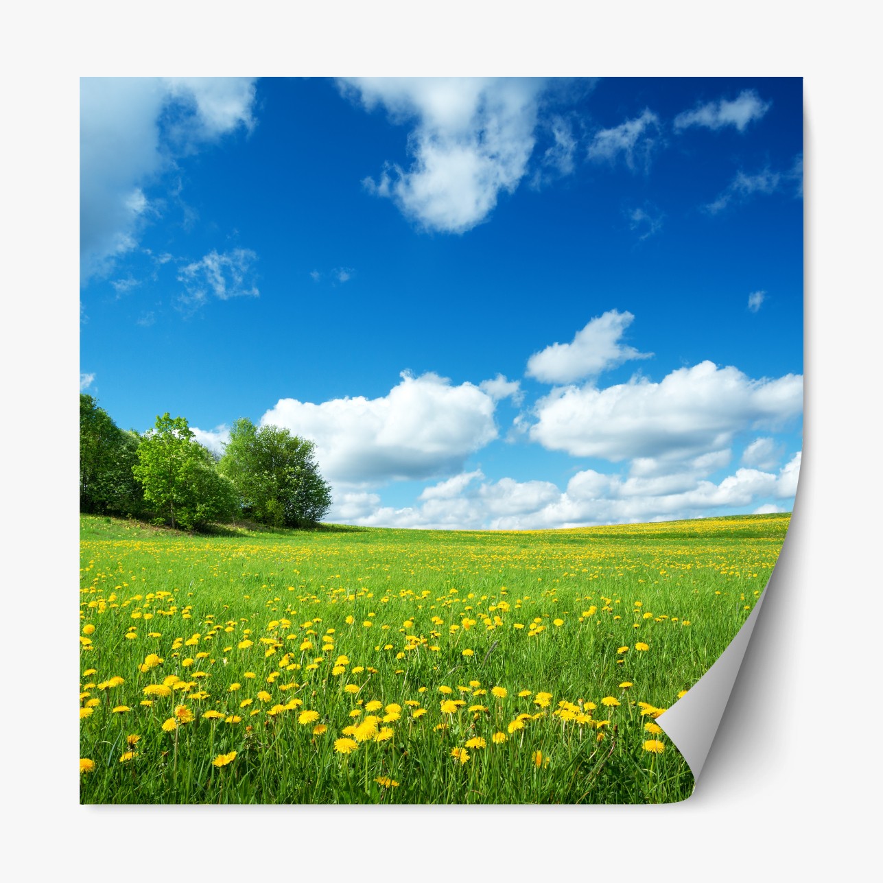 Repositionierbarer Aufkleber Sonnige wiese mit löwenzahn und blauem himmel