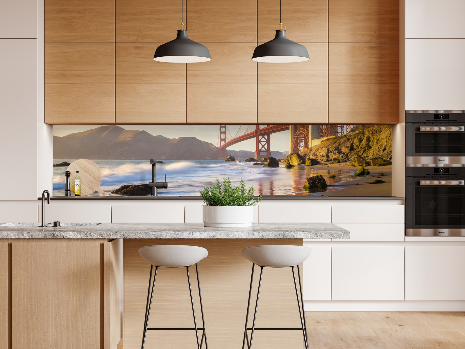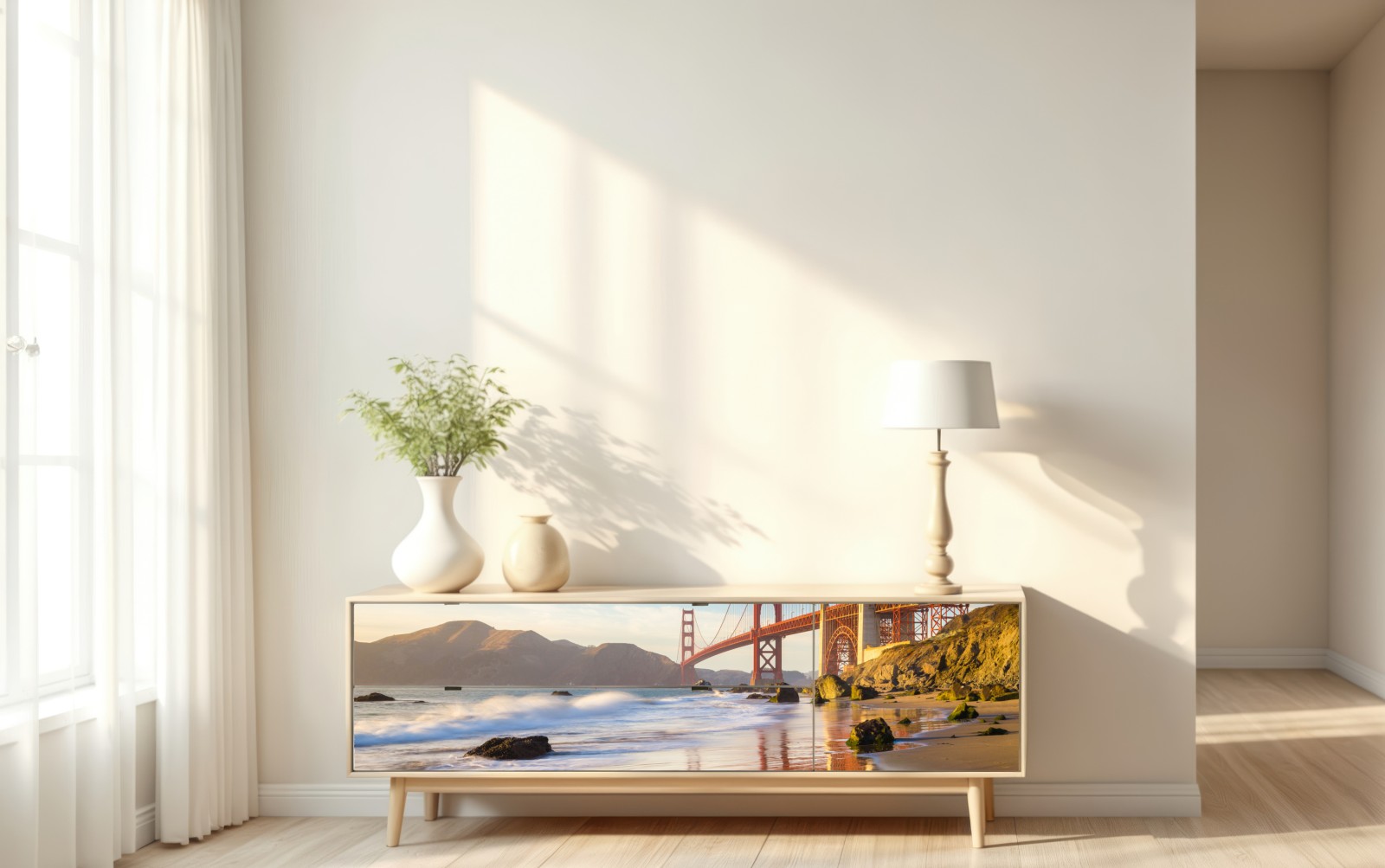 Bringen Sie maritime Gelassenheit in Ihr Zuhause mit dem lebendigen Anblick der Golden Gate Bridge, die sich bei Sonnenuntergang im Wasser spiegelt.