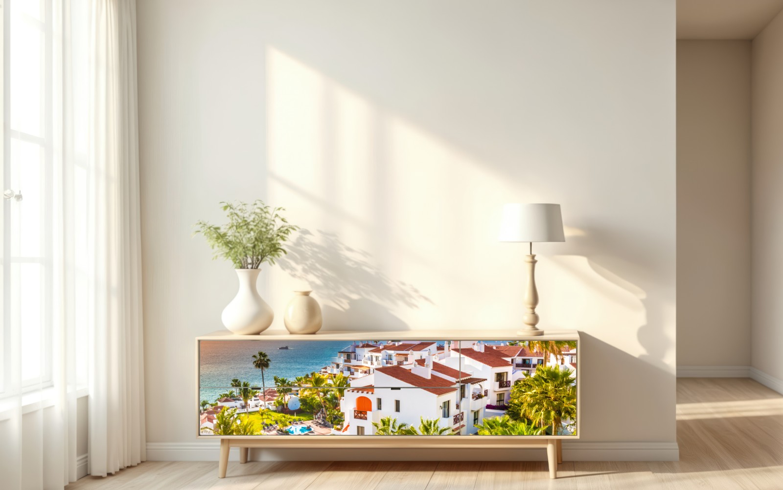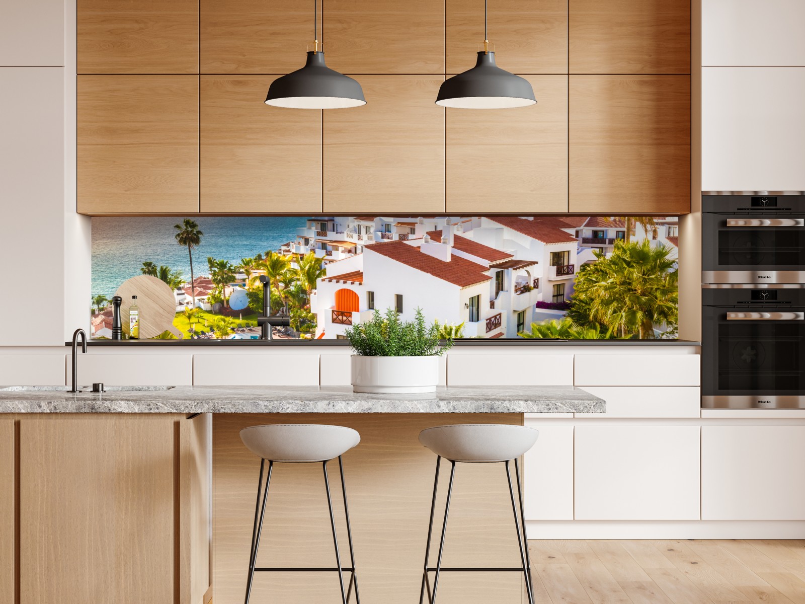 Lebendiger Küstensonnenuntergang über weißen Villen und Palmen in Puerto de Santiago, Teneriffa, der eine entspannte Inselatmosphäre einfängt.