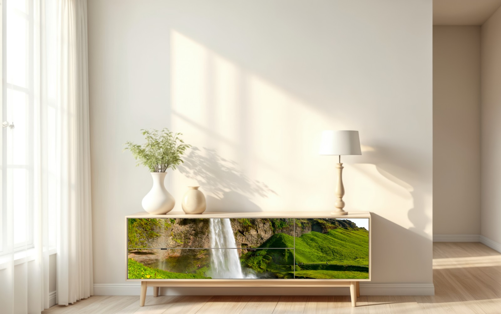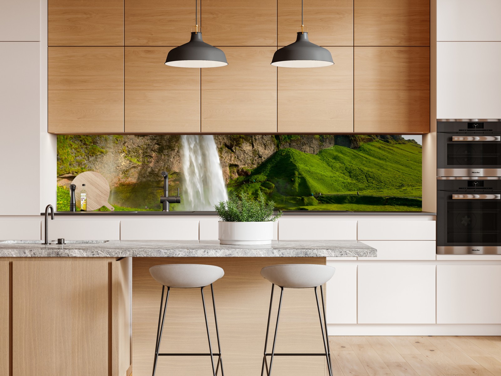 Bringen Sie die dramatische Schönheit von Seljalandsfoss in Island mit diesem lebendigen Landschaftsbild in Ihr Zuhause. Üppige grüne Klippen und stürzendes Wasser schaffen einen beruhigenden Blickfang.