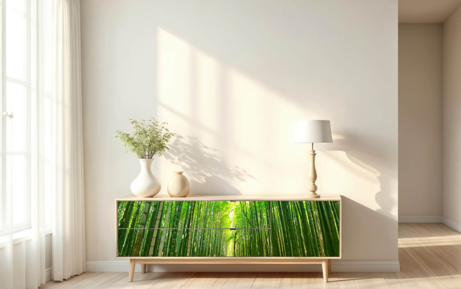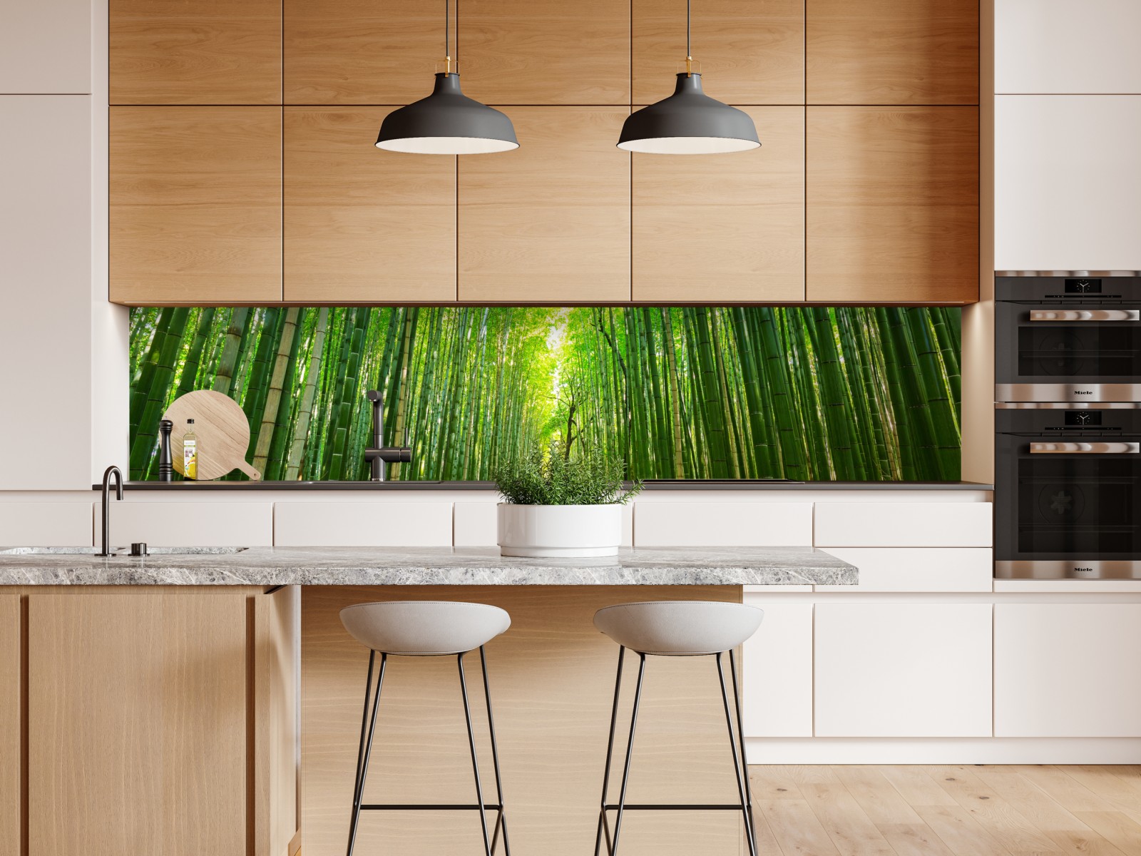 Bringen Sie die beruhigende Atmosphäre des Bambuswaldes von Arashiyama in Ihre Räume mit diesem lebendigen, grünen Motiv voller vertikaler Linien und Natur.
