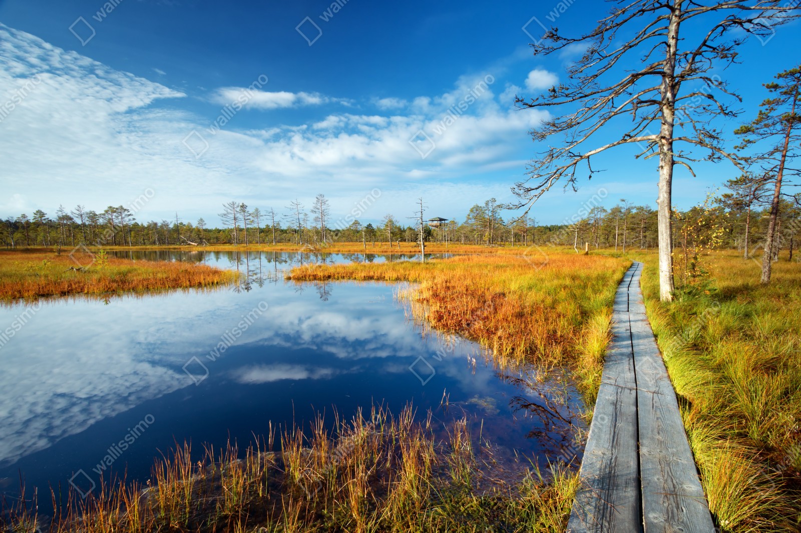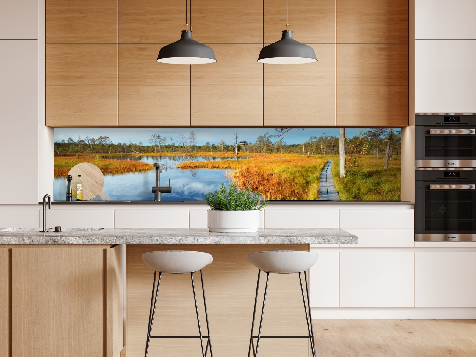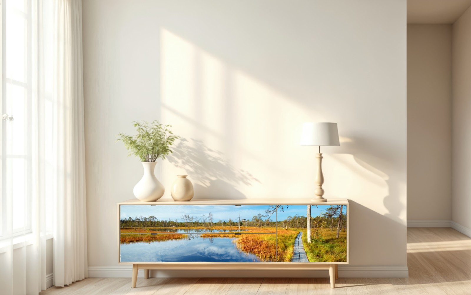 Ein ruhiges landschaftsbild mit einem hölzernen Steg über einem spiegelnden Moor und klarem blauem Himmel, ideal um Natur und Ruhe ins Zuhause zu bringen.