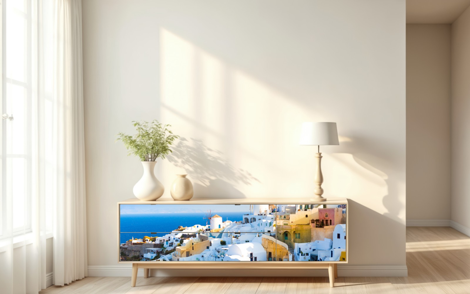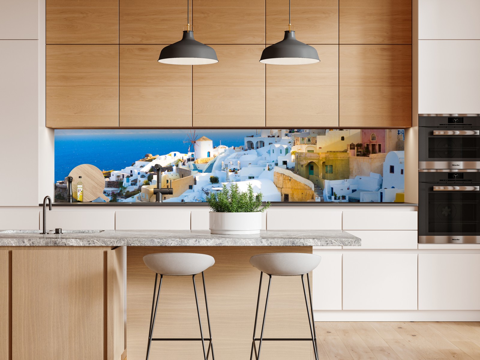 Heller mediterraner Blick auf Santorinis weißgetünchte Häuser und Windmühlen mit Blick auf das tiefblaue Meer, perfekt um maritimen Charme in jeden Raum zu bringen.