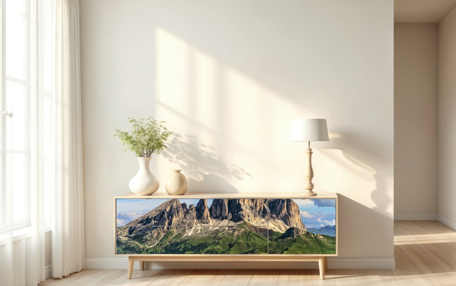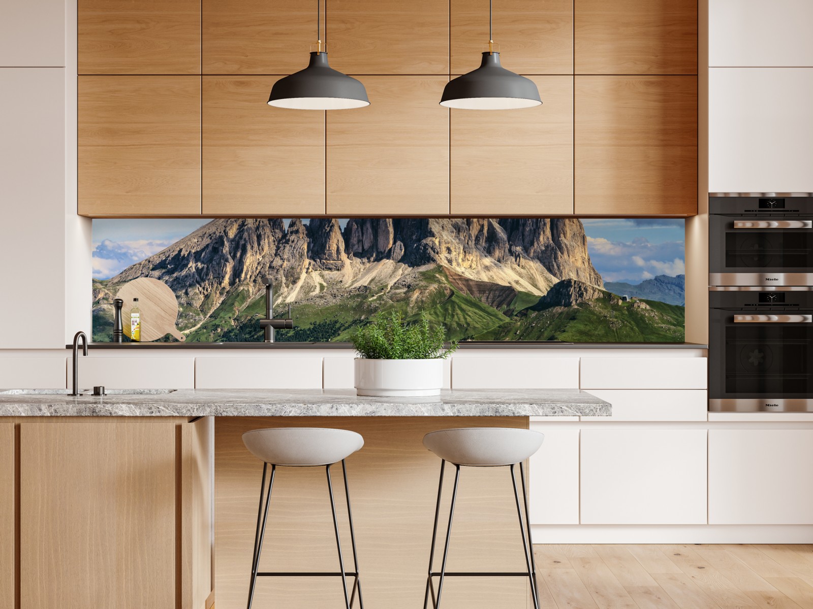 Ein atemberaubendes Bergpanorama mit markanten Felsgipfeln und üppigem grünen Vordergrund, das Ruhe und Inspiration in jeden Raum bringt.