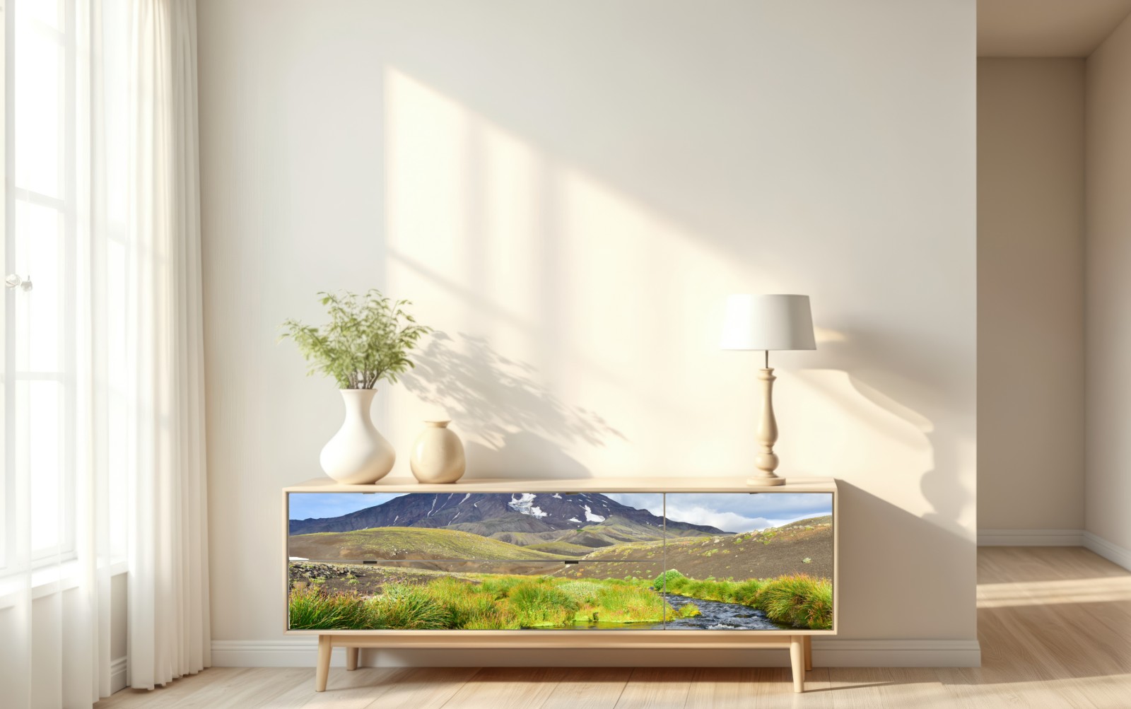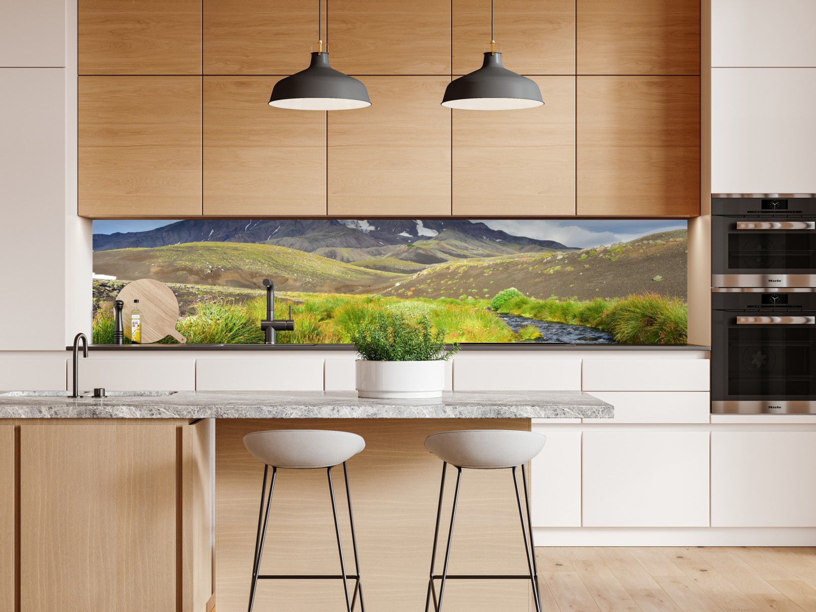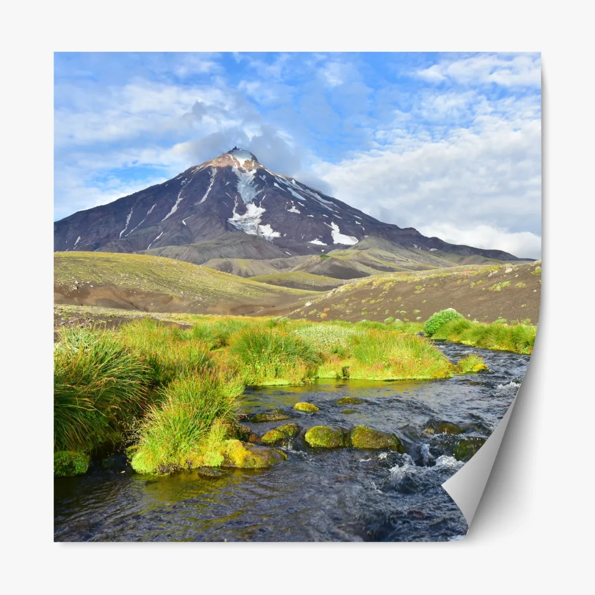 Majestätischer Blick auf den Vulkan Koryaksky mit fließendem Fluss und grüner Tundra, ideal um natürliche Ruhe ins Zuhause zu bringen.