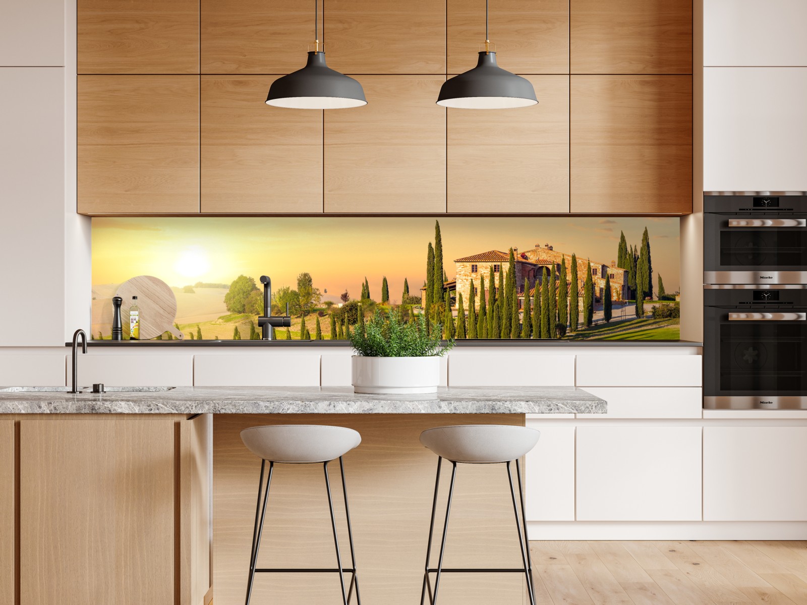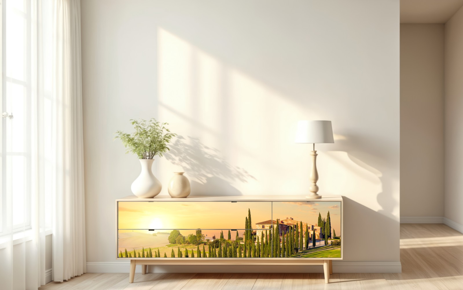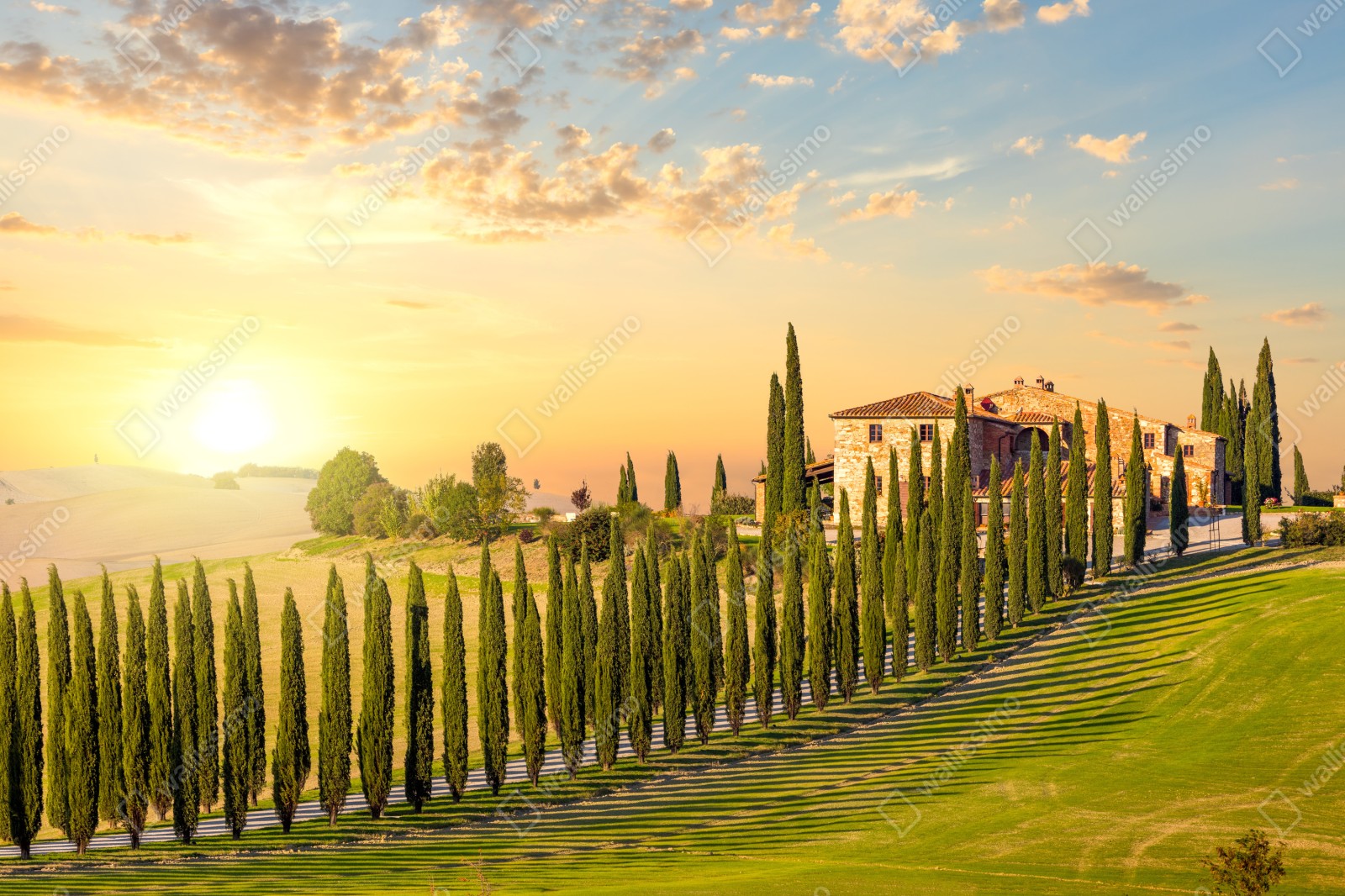 Warmer Sonnenuntergang in der Toskana über einer zypressenbesetzten Straße, der mediterranes Flair in jedes Zuhause bringt.