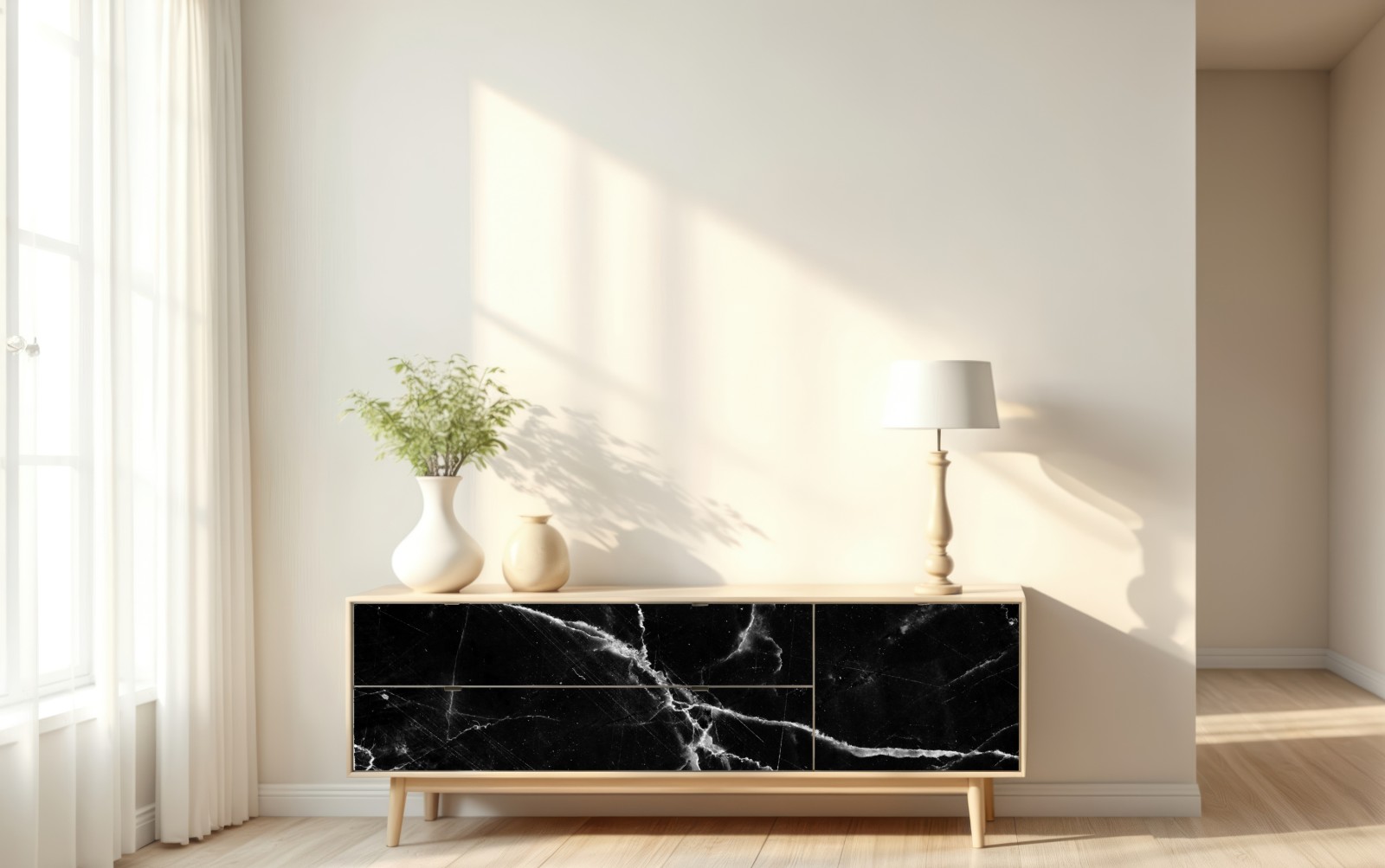 Markante schwarze Marmortextur mit auffälligen weißen Adern verleiht Räumen moderne und luxuriöse Eleganz.