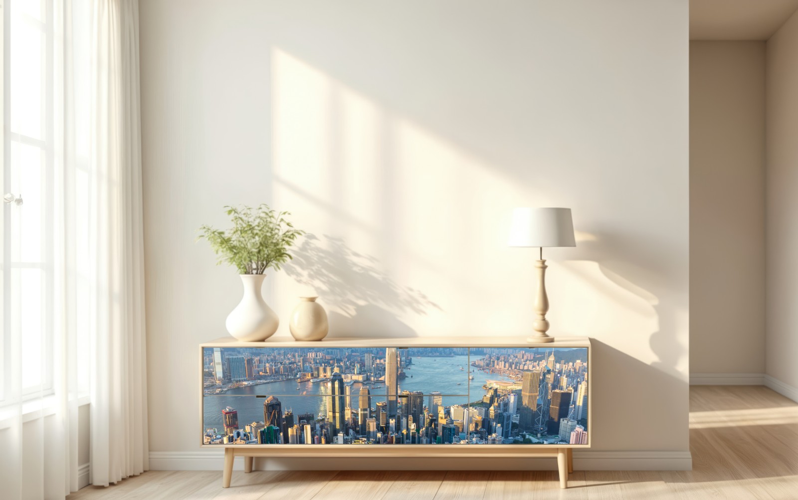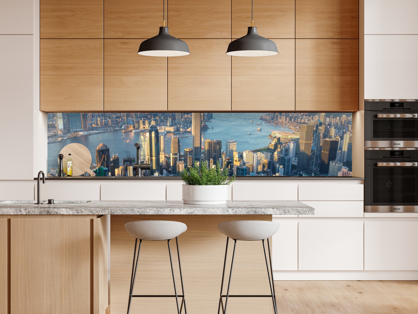 Atemberaubende Luftaufnahme der Skyline von Hongkong bei Sonnenuntergang, perfekt um jedem Raum urbanen Flair und moderne Eleganz zu verleihen.