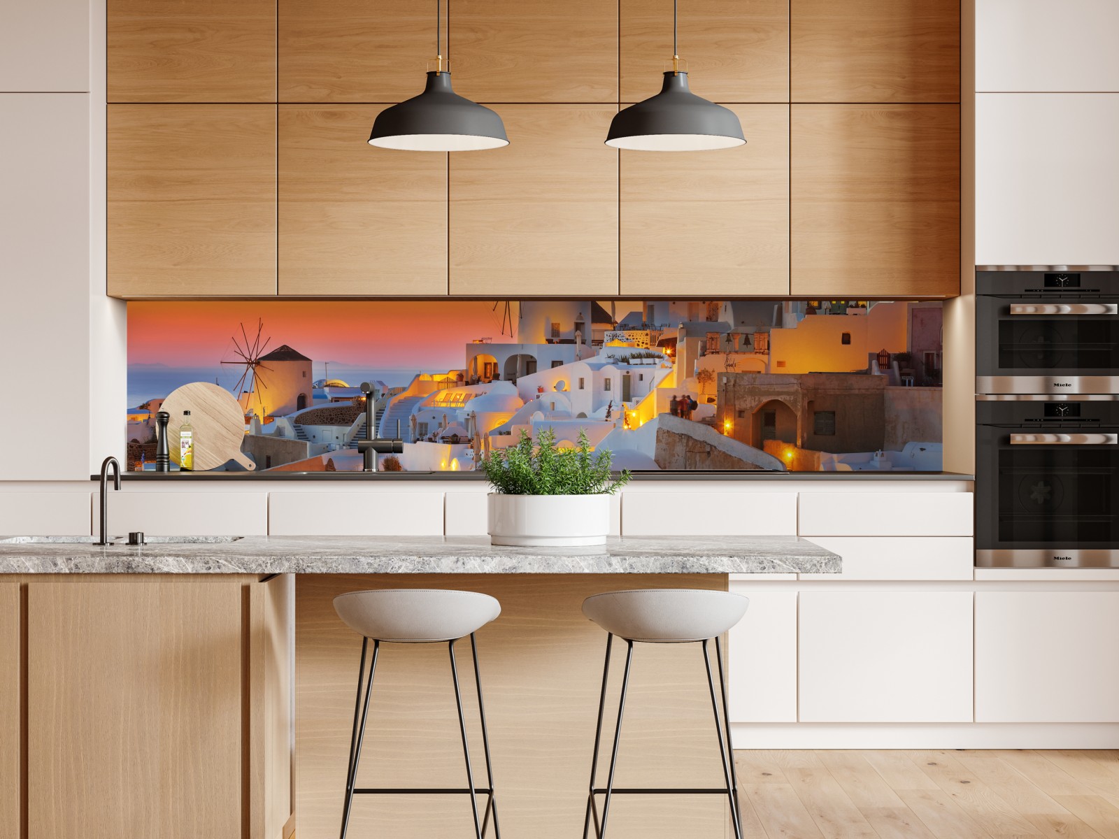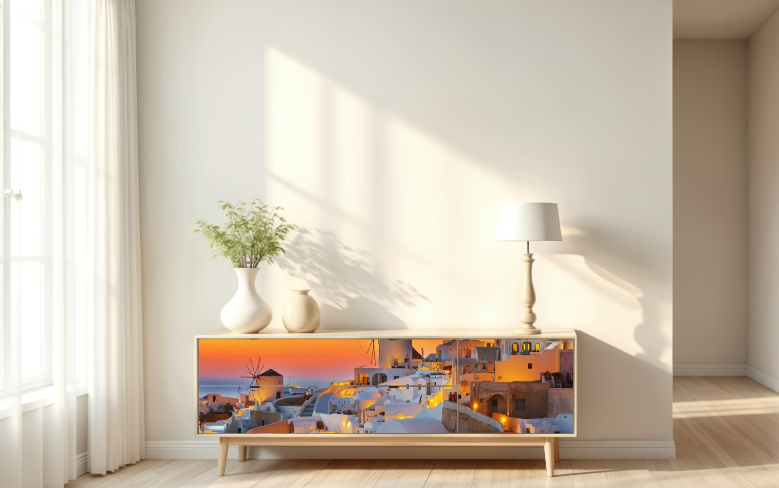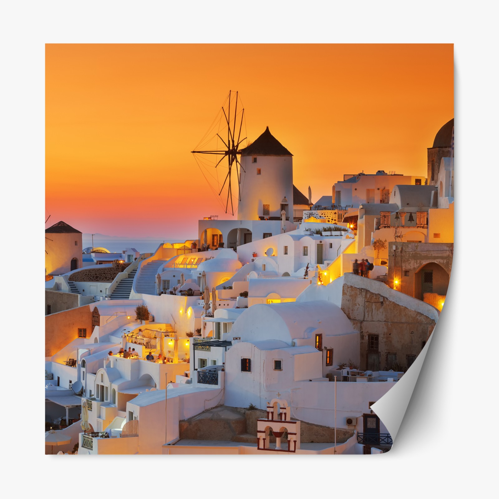 Ein warmer, goldener Sonnenuntergang taucht die ikonischen weißen Häuser und Windmühlen von Oia auf Santorini in ein ruhiges, mediterranes Licht und schafft eine perfekte Stimmung für jedes Wohnzimmer.