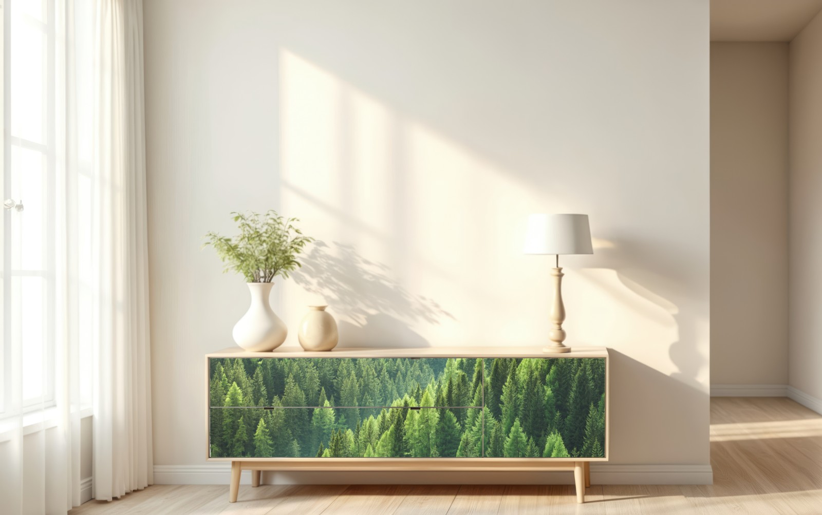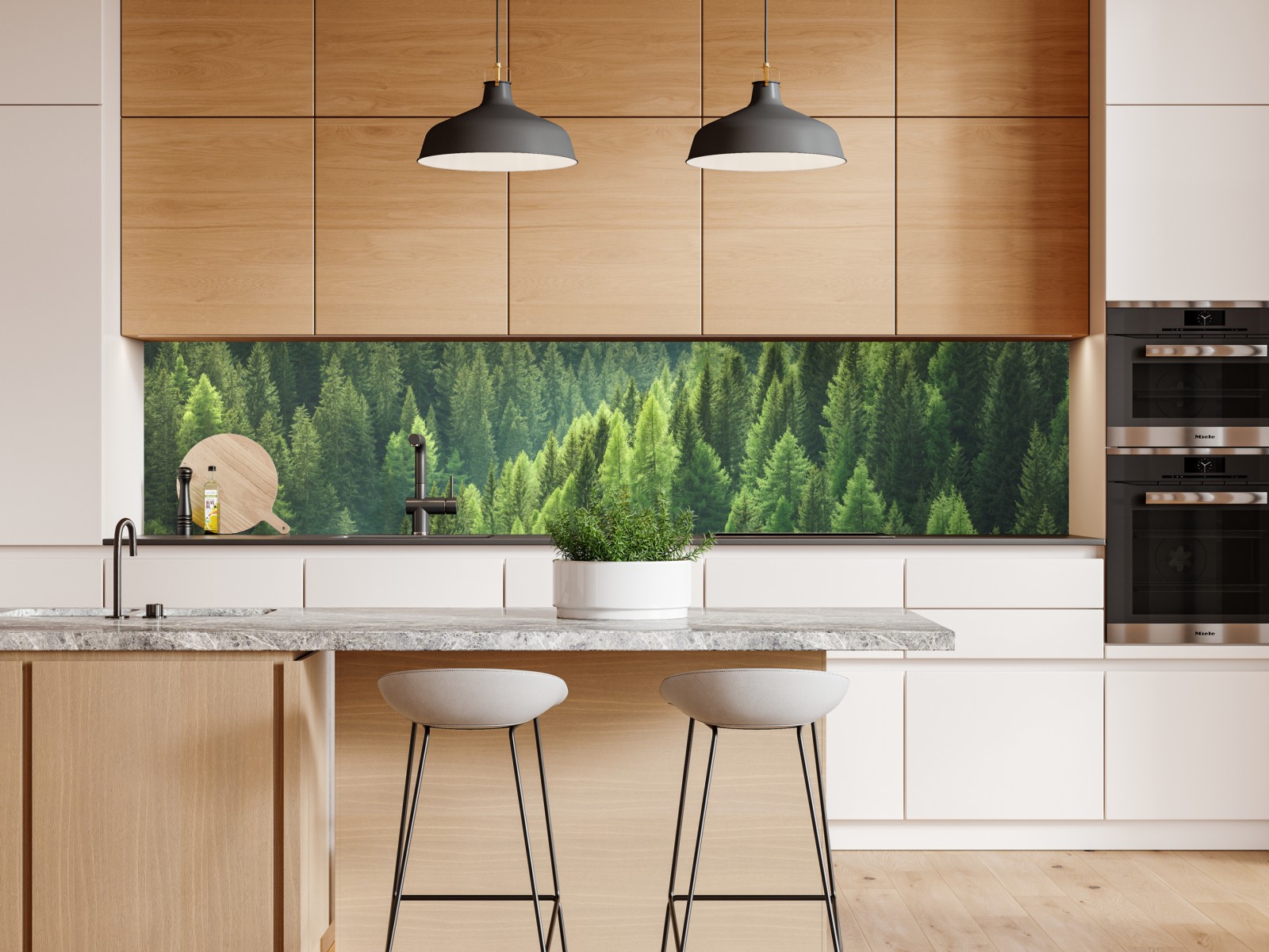 Eine beruhigende Luftaufnahme eines dichten immergrünen Waldes, die natürliche Ruhe und frische grüne Töne in jeden Raum bringt.