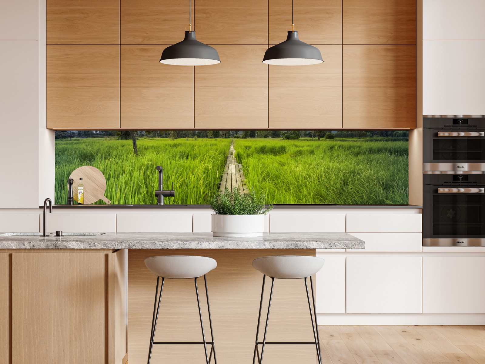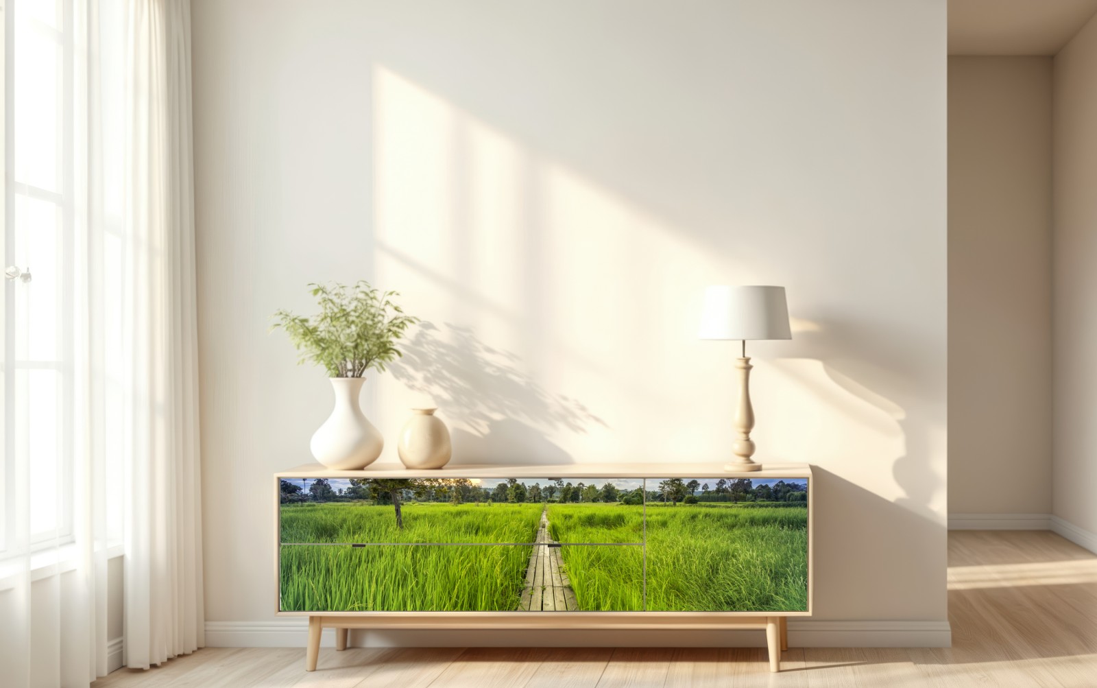 Ruhige Szenerie mit einer 100 Jahre alten hölzernen Brücke über smaragdgrünen Reisfeldern bei Sonnenuntergang in Khonburi, ideal zur Dekoration von Wohnräumen.
