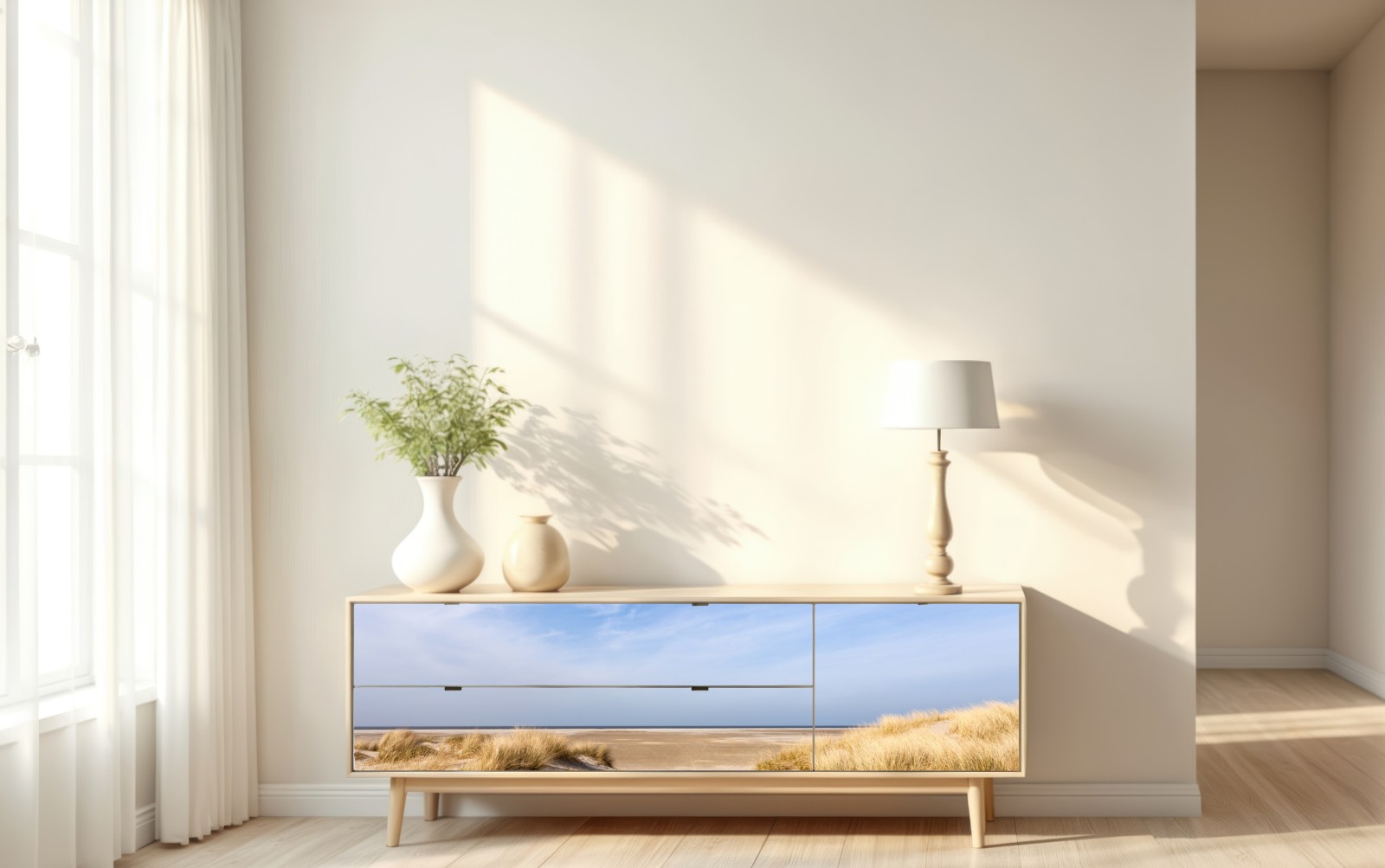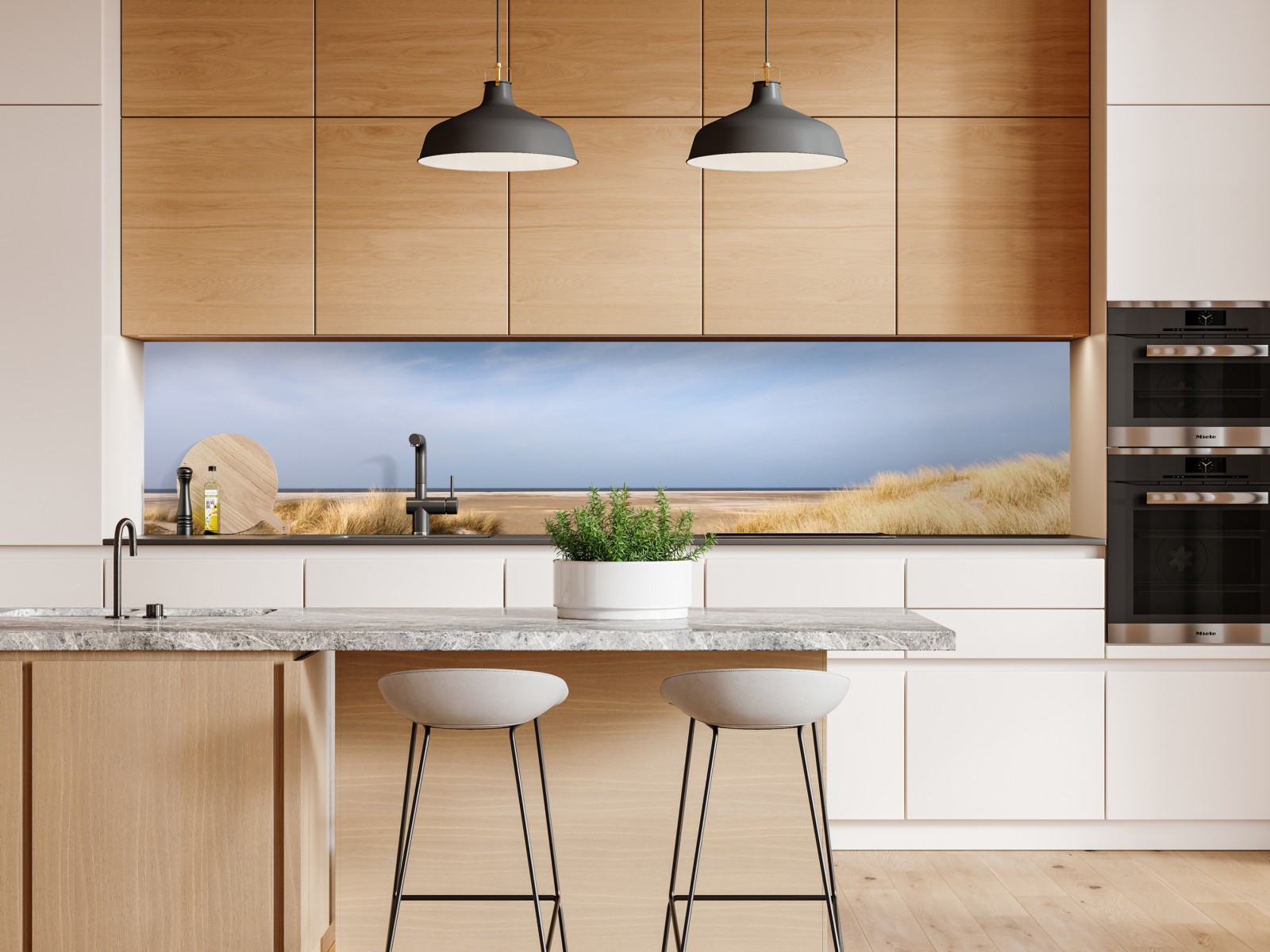 Eine ruhige Küstenszene mit Sanddünen und weitem Himmel, die Ruhe und Weite an Ihre Wände bringt.