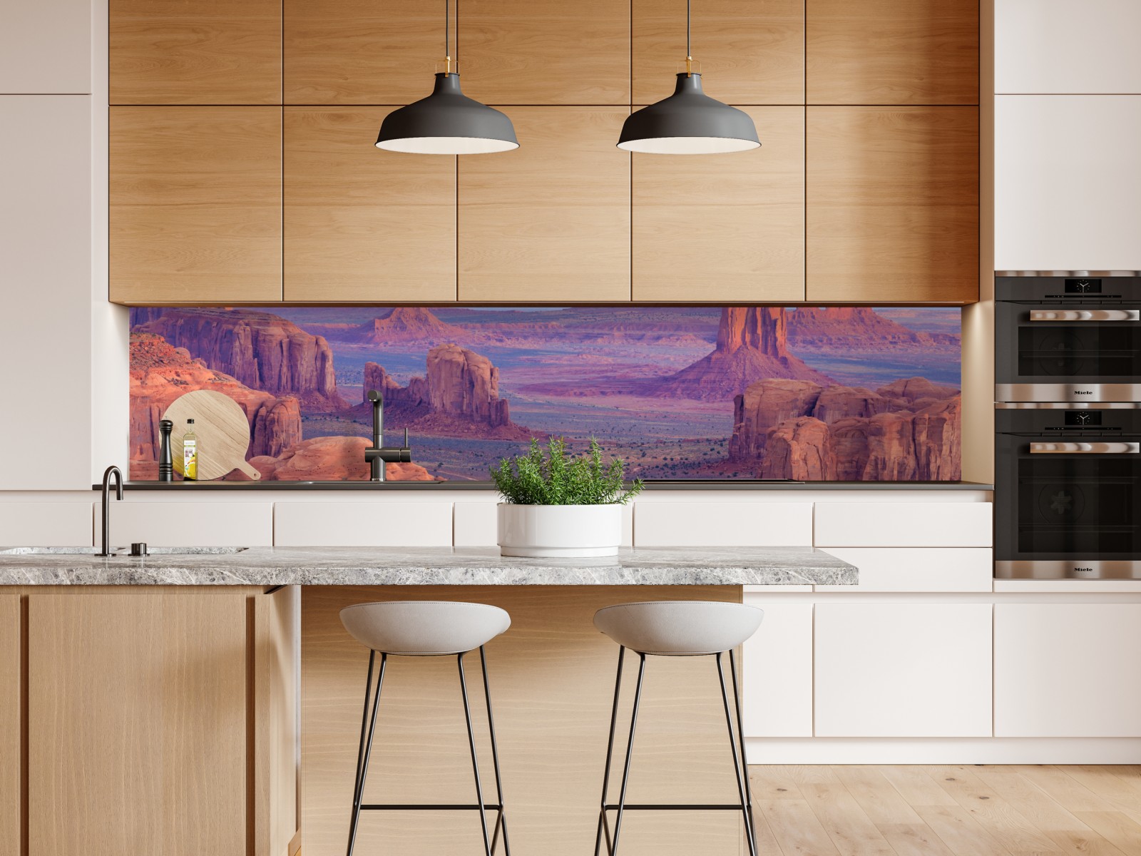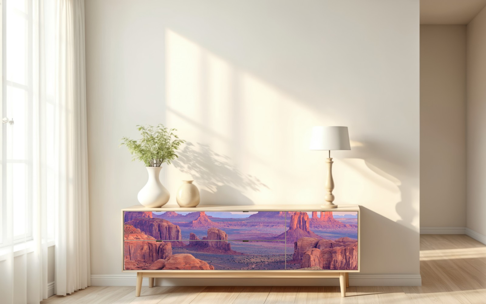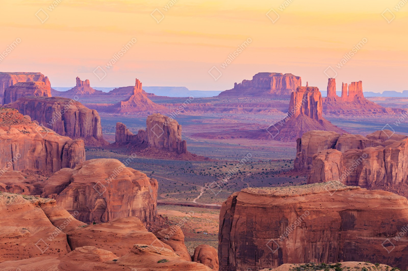 Atemberaubende Panoramaaufnahme von Monument Valley bei Sonnenuntergang, die ikonische Sandsteinformationen und warme Wüstentöne zeigt und Ihrem Raum natürliche Ruhe und Weite verleiht.