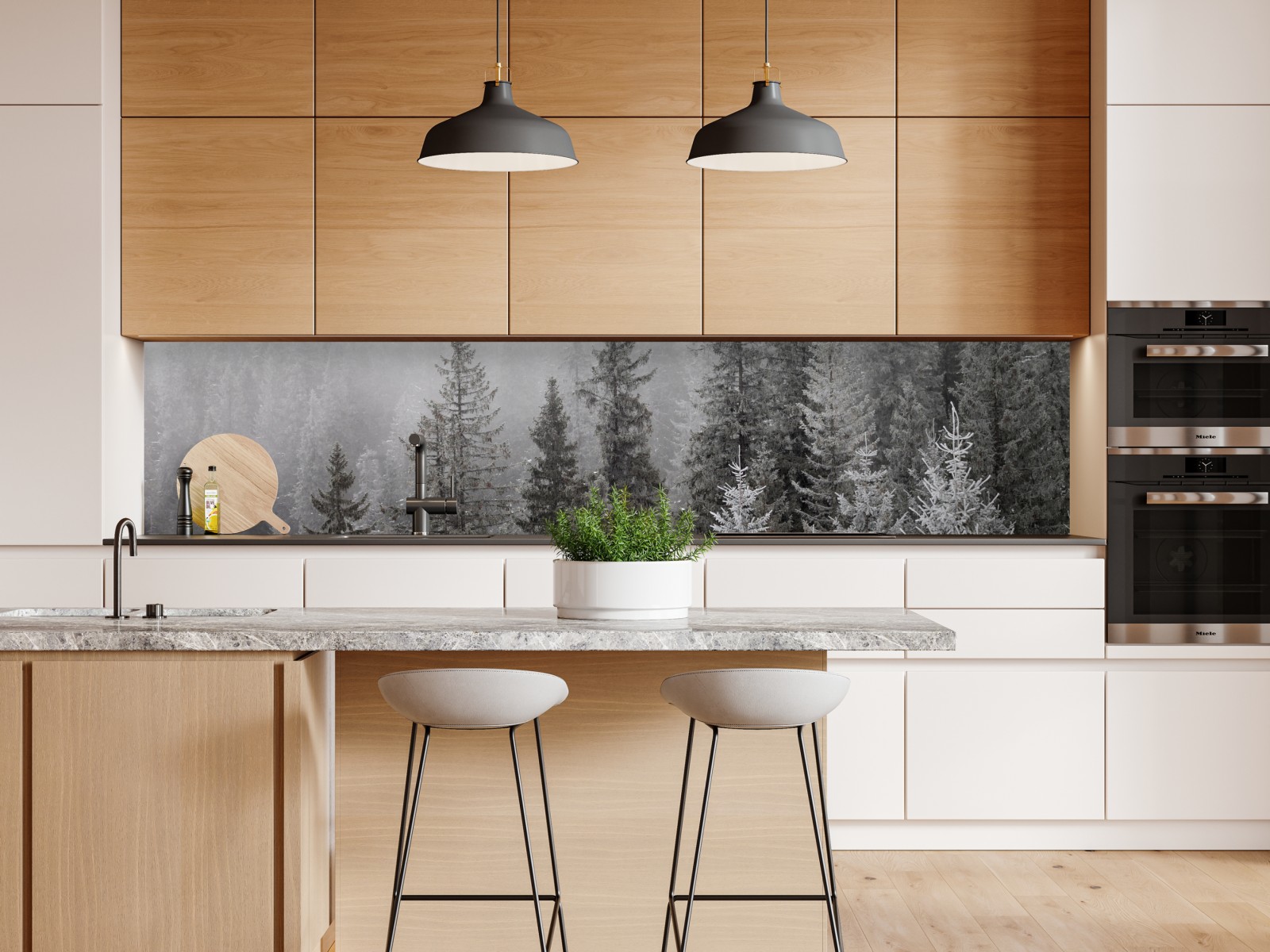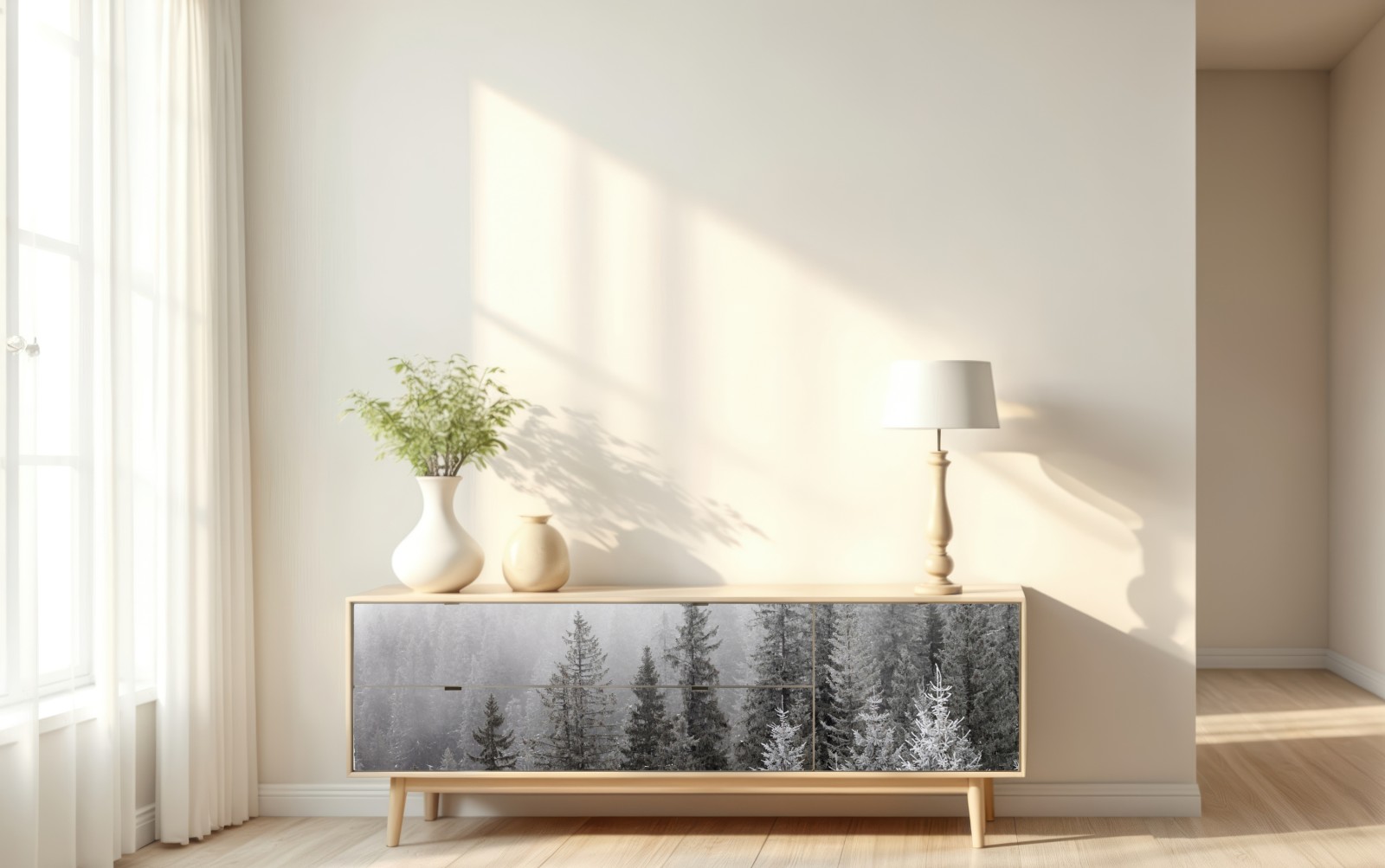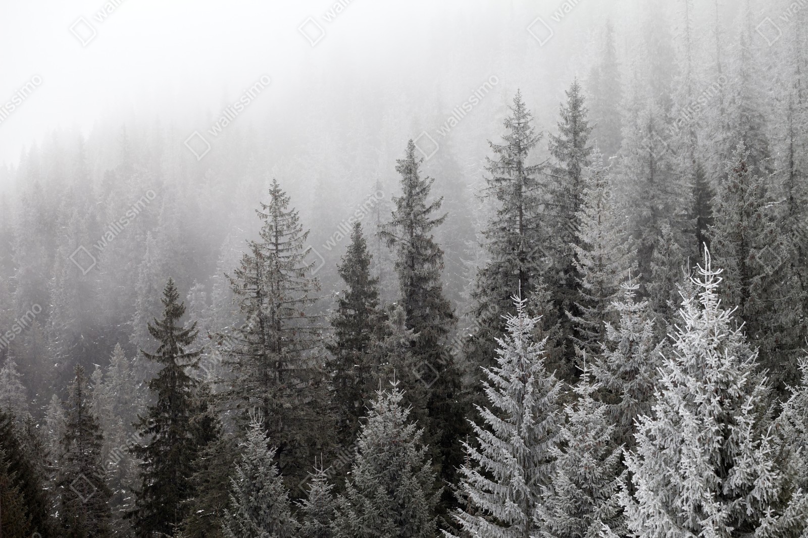 Eine ruhige, neblige Winterwaldszene aus den Karpaten bringt monochrome Schönheit und eine entspannte Atmosphäre an jede Wand.
