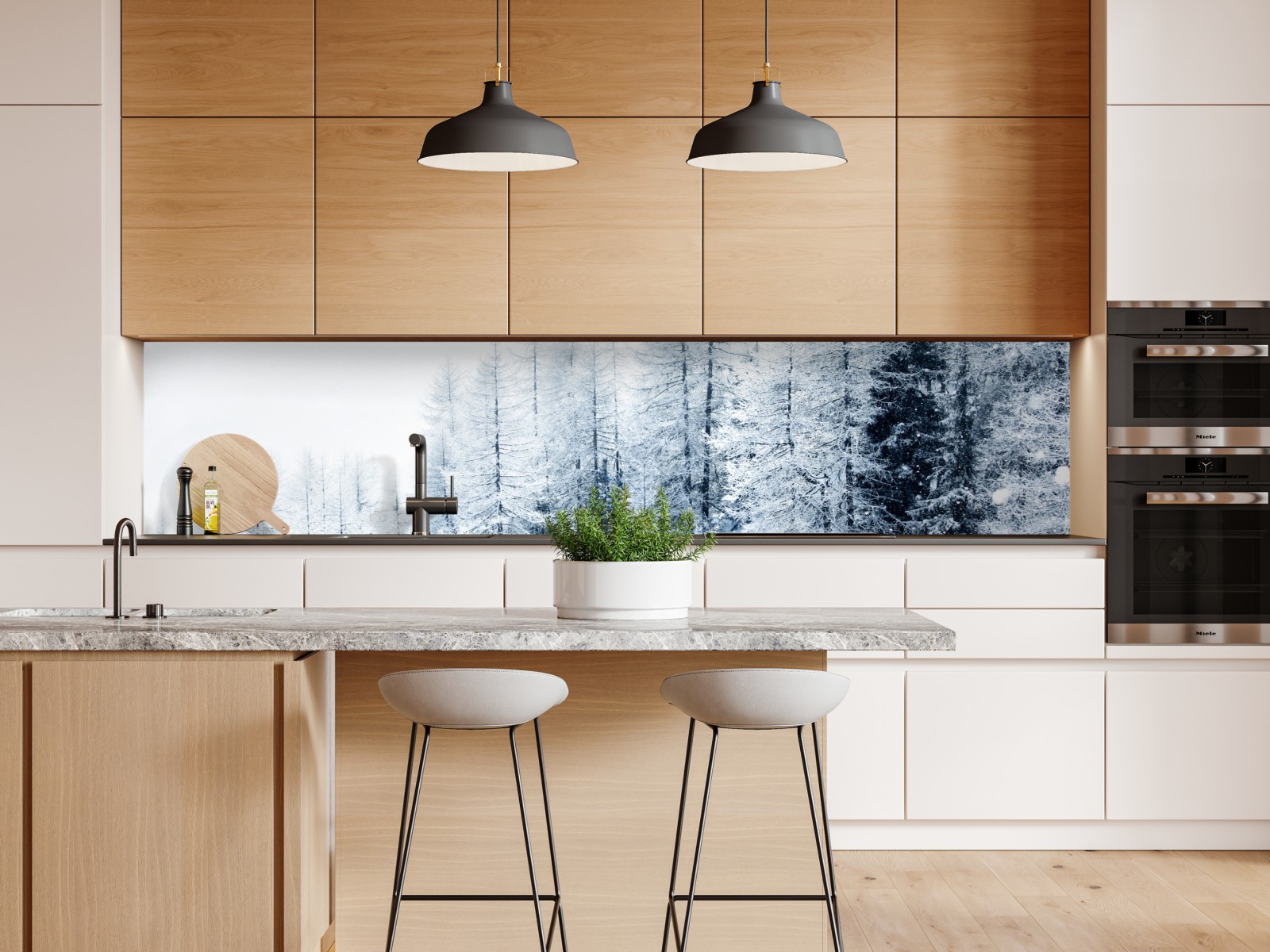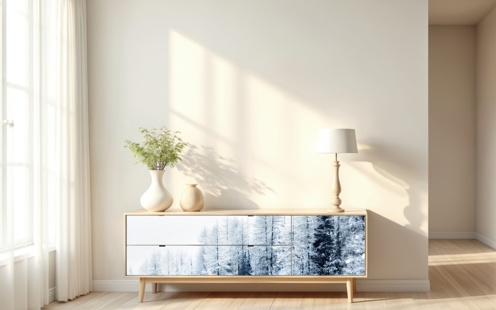Eine ruhige verschneite Waldlandschaft, die eine kühle, minimalistische Atmosphäre ins Zimmer bringt und gut zu skandinavischem Design passt.