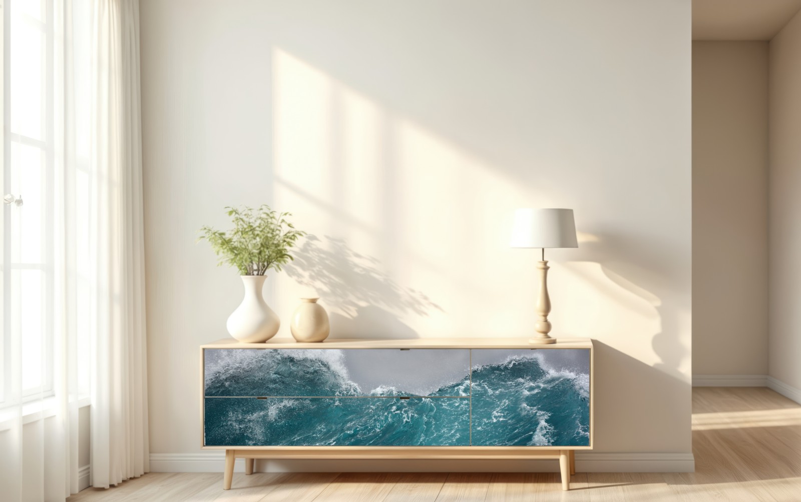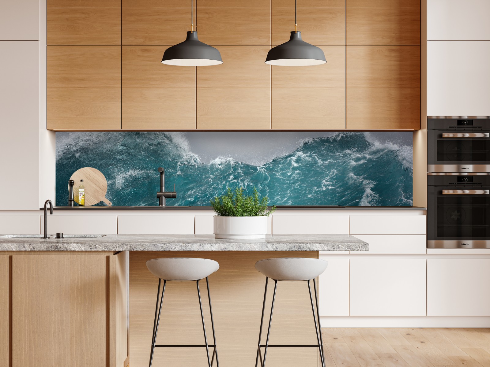 Dramatische Meeresaufnahme mit kraftvollen türkisfarbenen Wellen unter einem stürmischen Himmel. Ideal, um natürliche Dynamik und Ruhe in Ihr Interieur zu bringen.