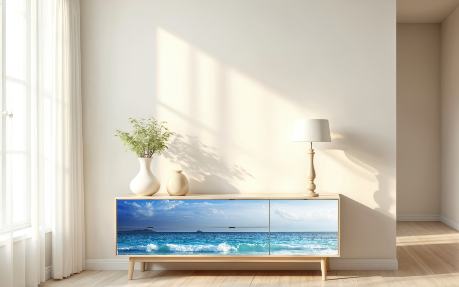 Bringen Sie die ruhige Schönheit eines tropischen Strandes in Ihr Zuhause, satte türkisfarbene Gewässer und sanfte Wellen schaffen eine entspannte Atmosphäre.