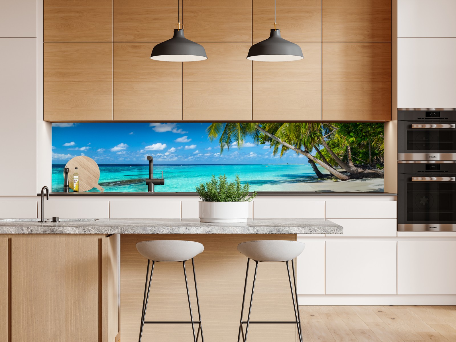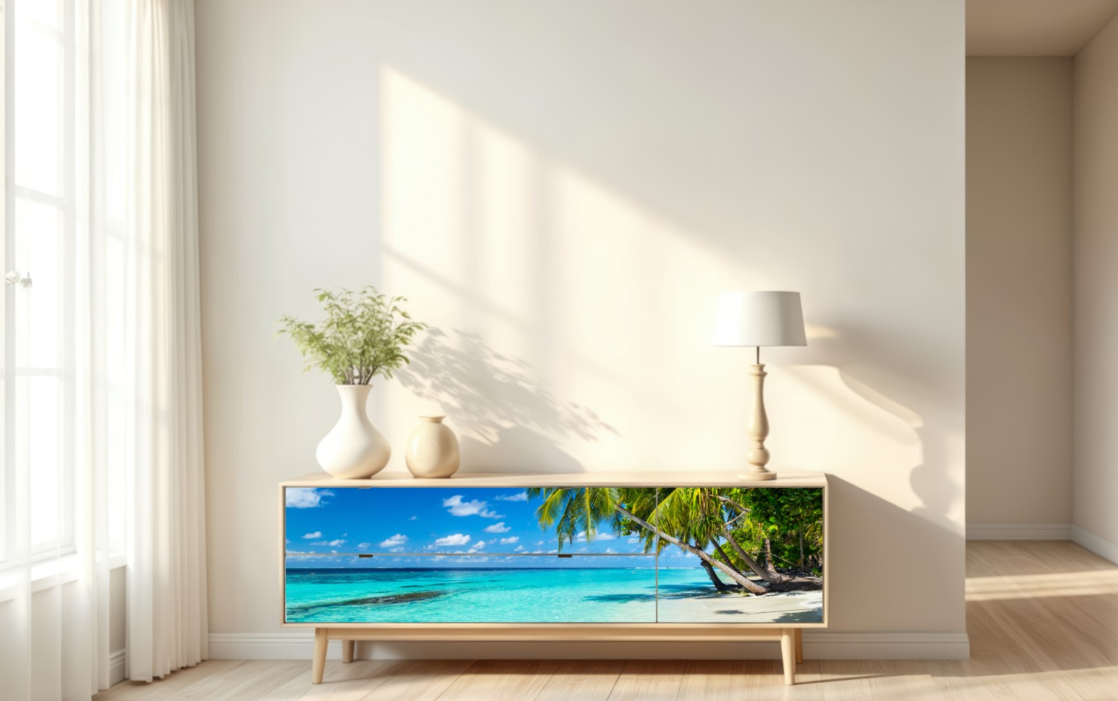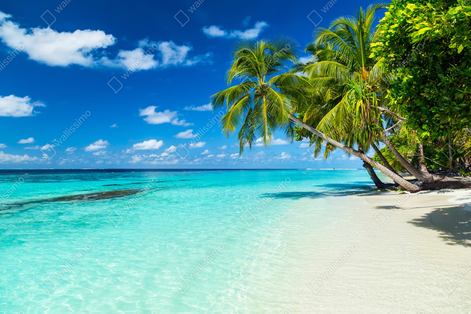 Bringen Sie Küstenruhe in Ihren Raum mit diesem lebendigen Foto eines türkisfarbenen tropischen Strandes und geneigten Palmen; ideal, um eine entspannende, sonnige Atmosphäre zu schaffen.