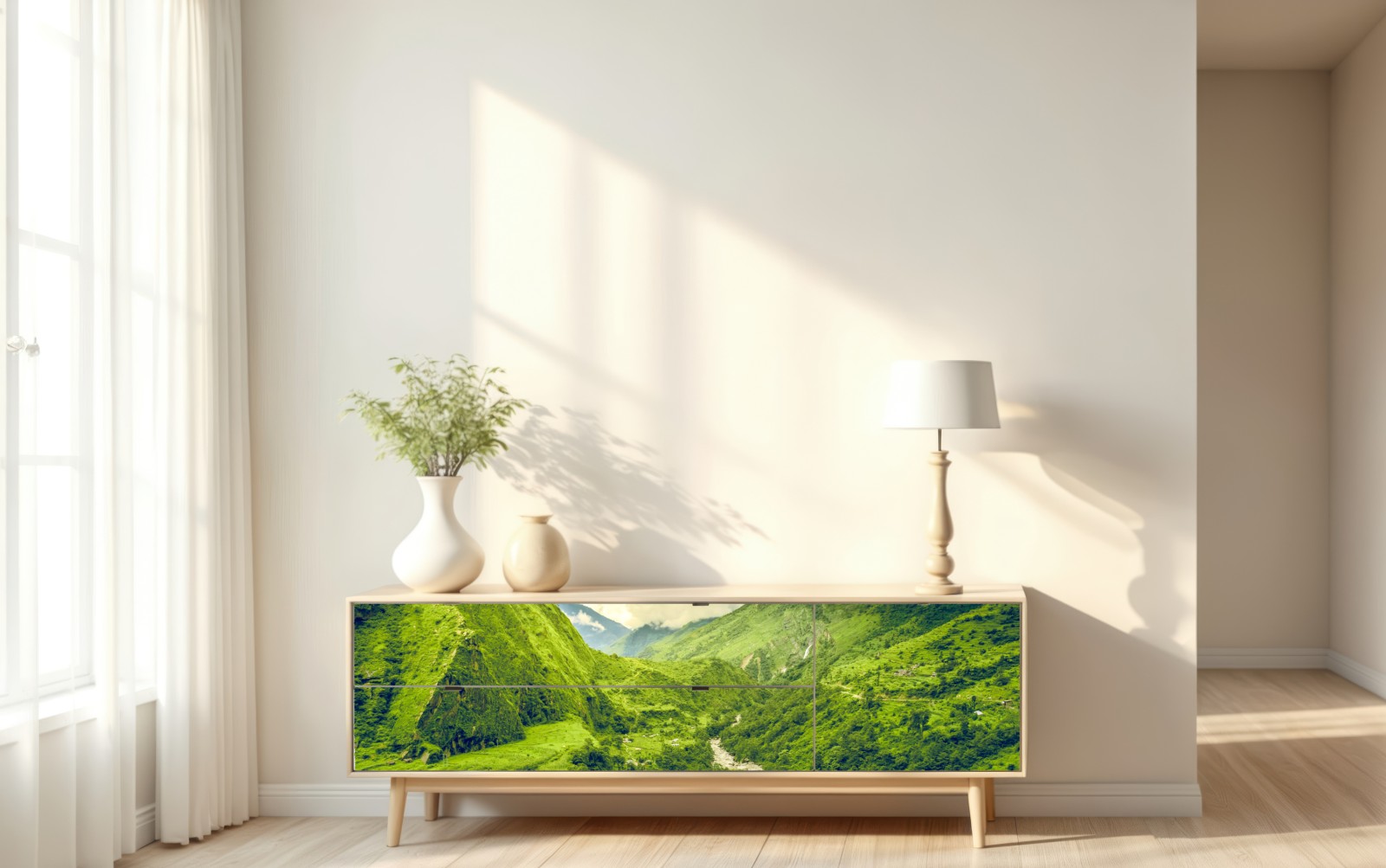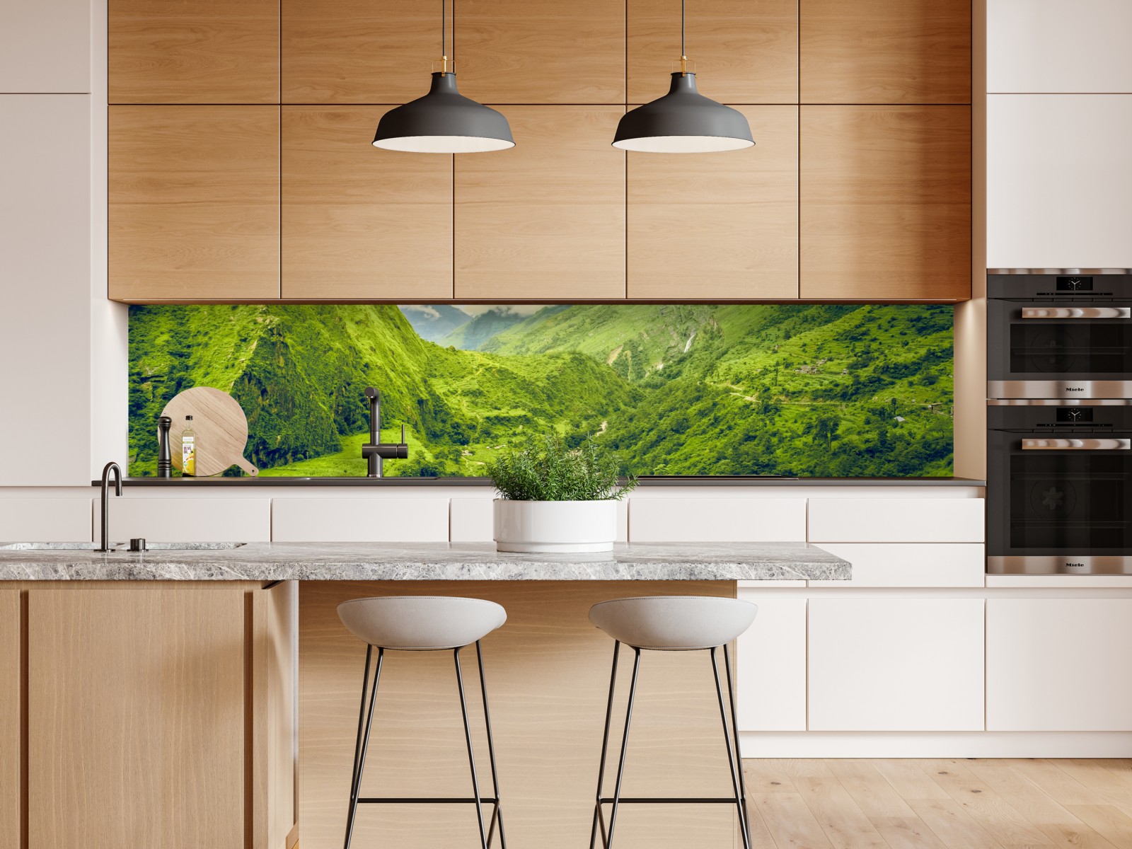 Ein lebendiger Panoramablick auf ein üppiges grünes Bergtal mit einem mäandrierenden Fluss und dramatischen Wolken, ideal zur Bereicherung von Innenräumen.