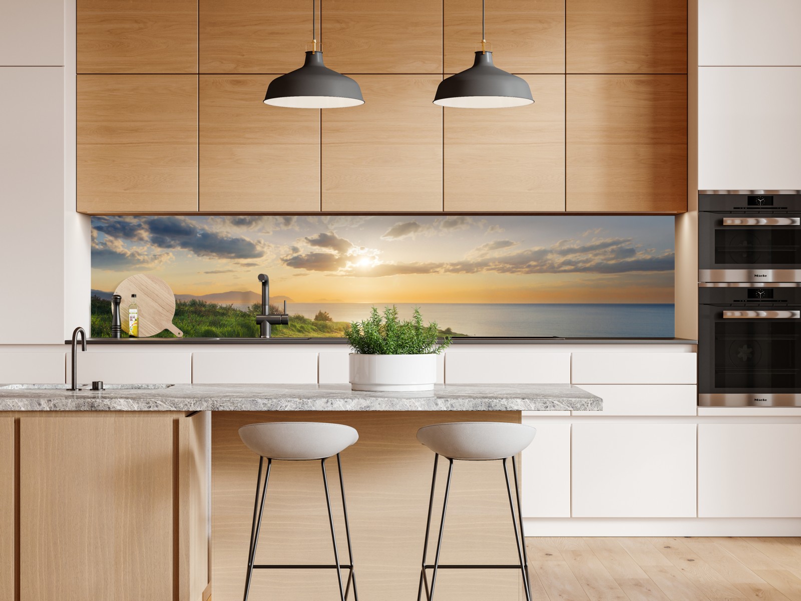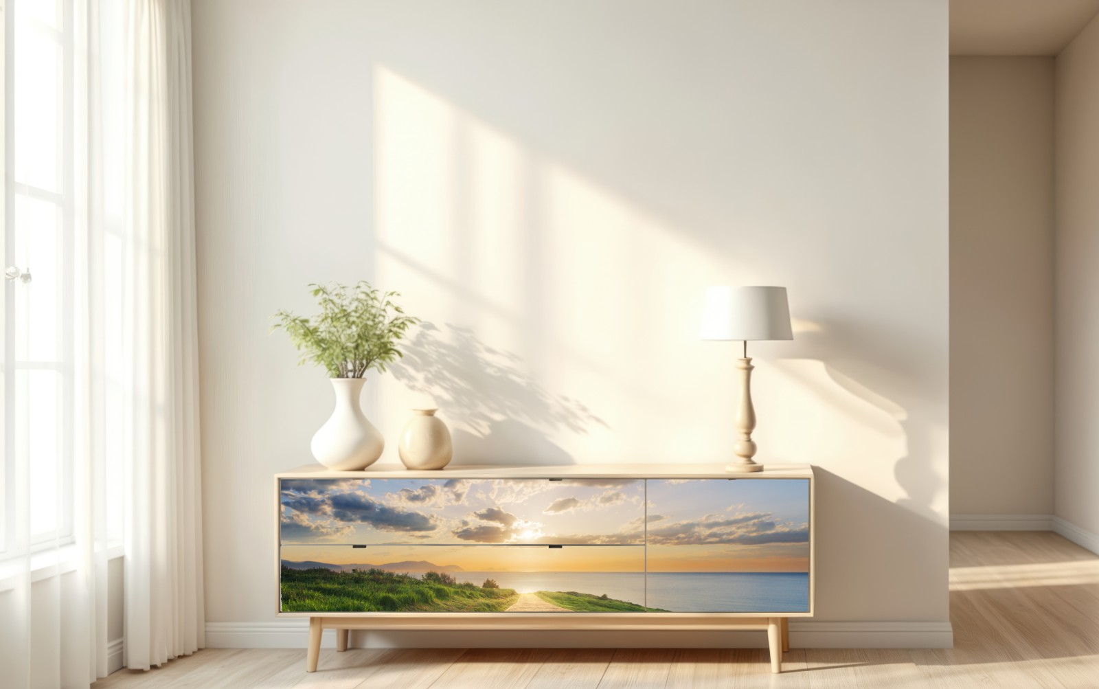 Ein ruhiger Küstenweg bei Sonnenaufgang, der Ihren Raum mit warmem Licht, ruhiger See und weitem Himmel erfüllt.