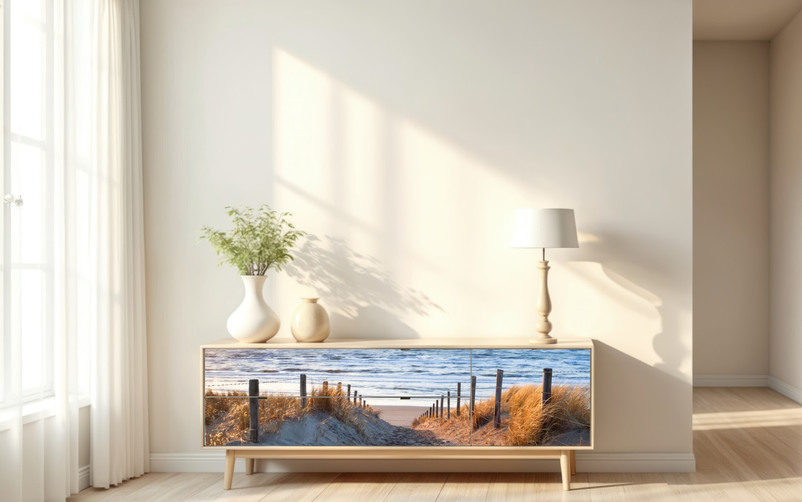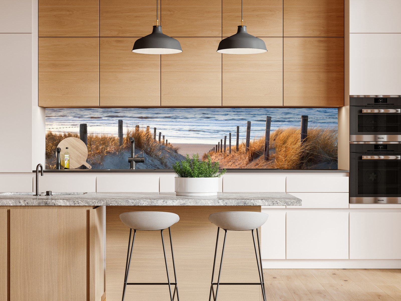Ein ruhiger Sonnenuntergang über einem sandigen Pfad zur Nordsee in Holland, ideal um eine maritime Atmosphäre ins Zuhause zu bringen.