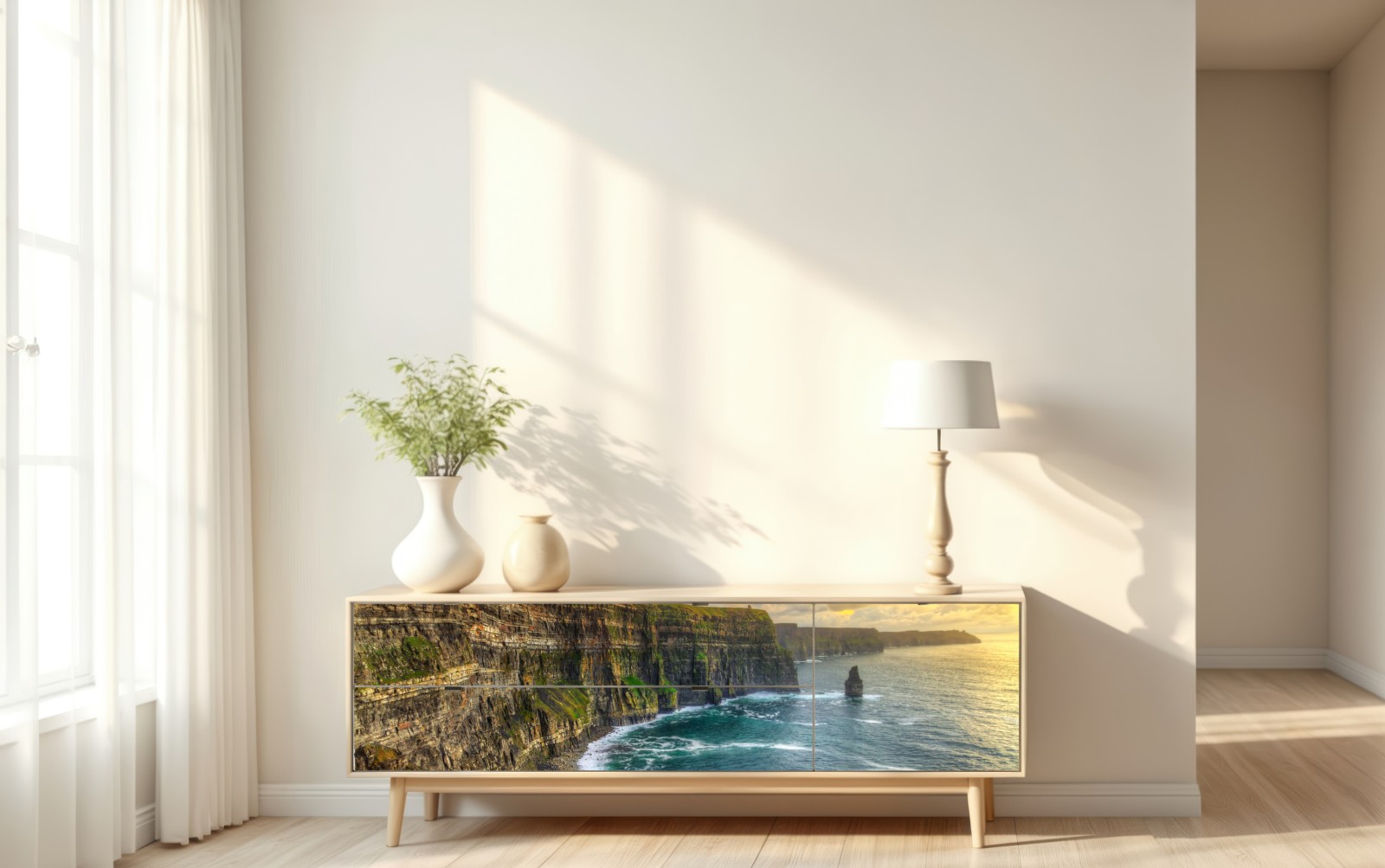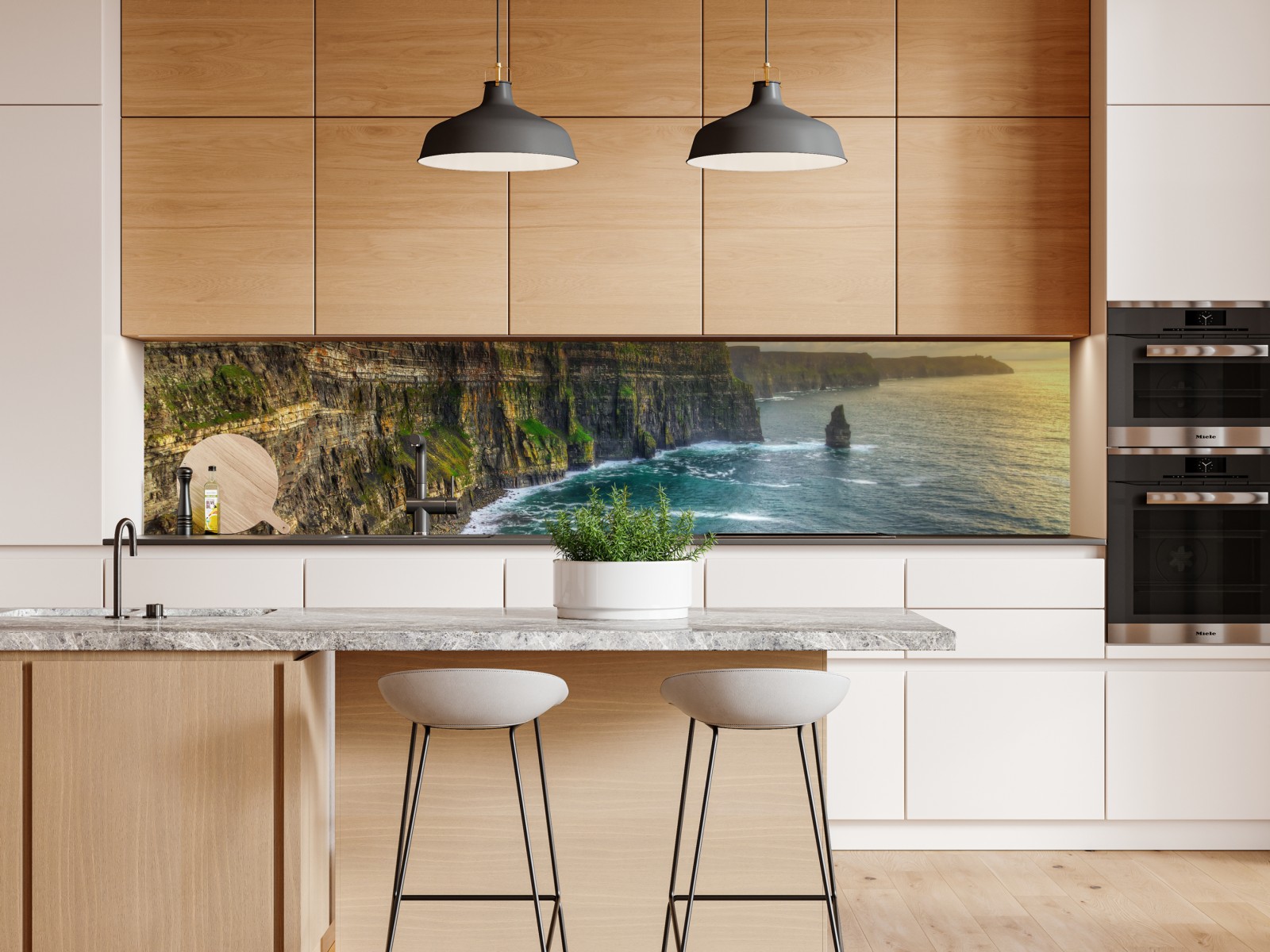 Dramatische Panoramaansicht rauer Küstenklippen und türkisfarbenem Meer bei goldenem Sonnenuntergang, ideal um natürliche Ruhe in Ihr Zuhause zu bringen.