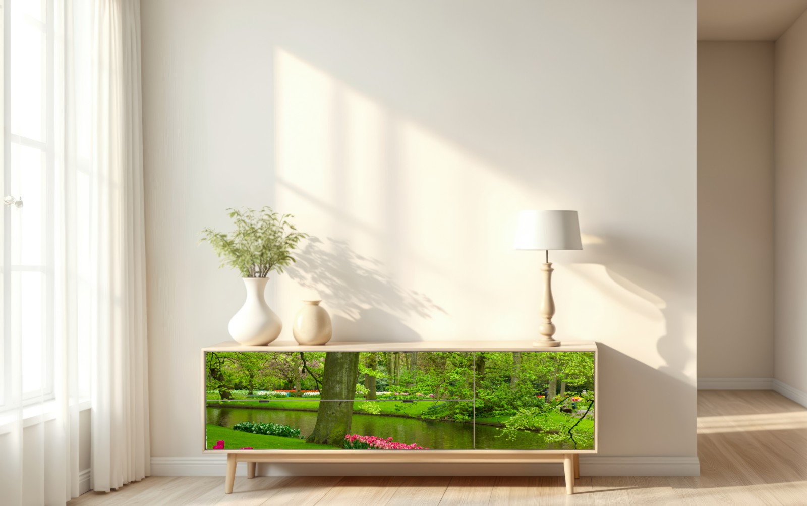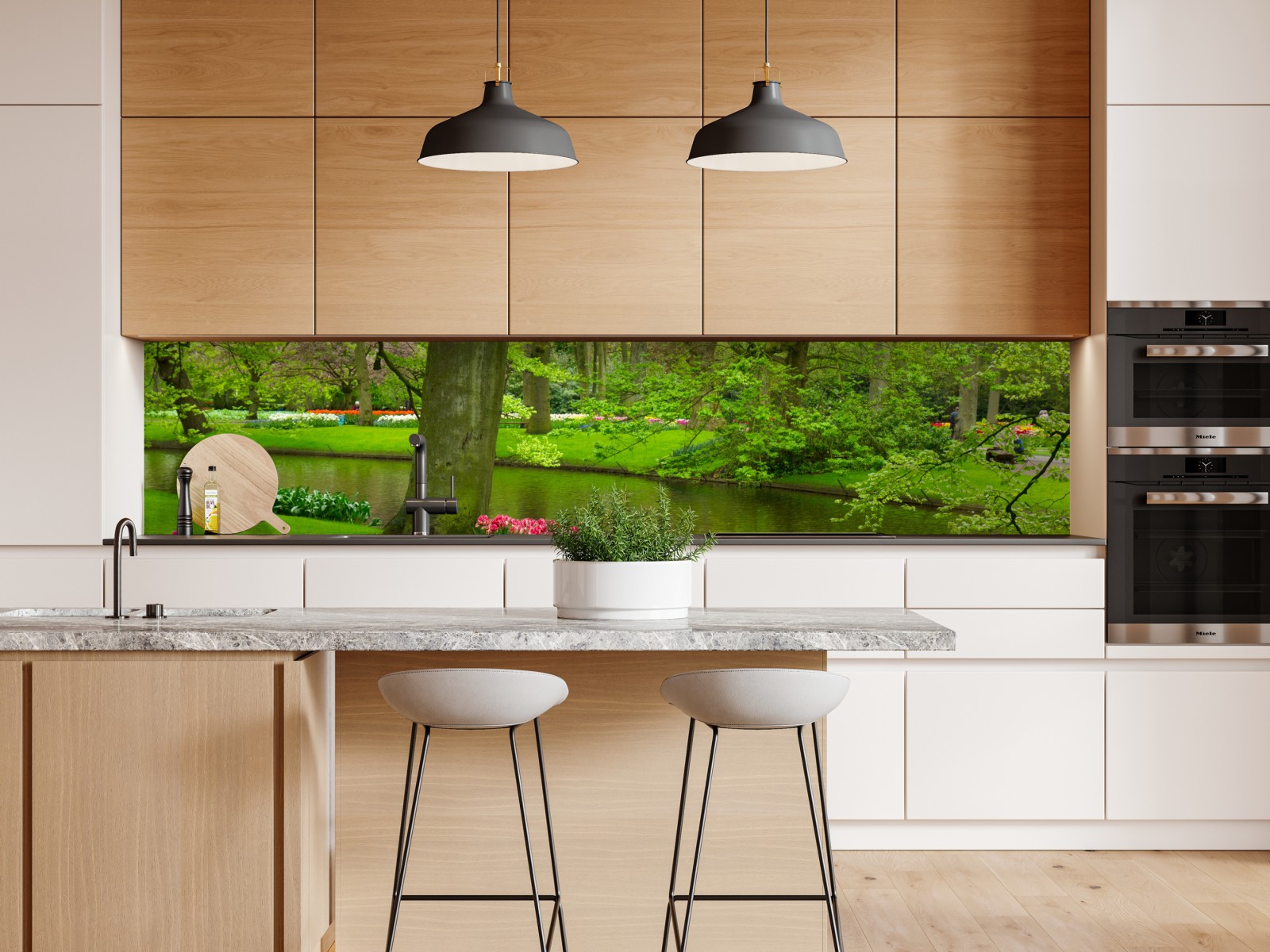 Leuchtend pinke Tulpen und üppig grüne Bäume säumen einen ruhigen Kanal und bringen frische Frühlingsstimmung in jeden Raum.