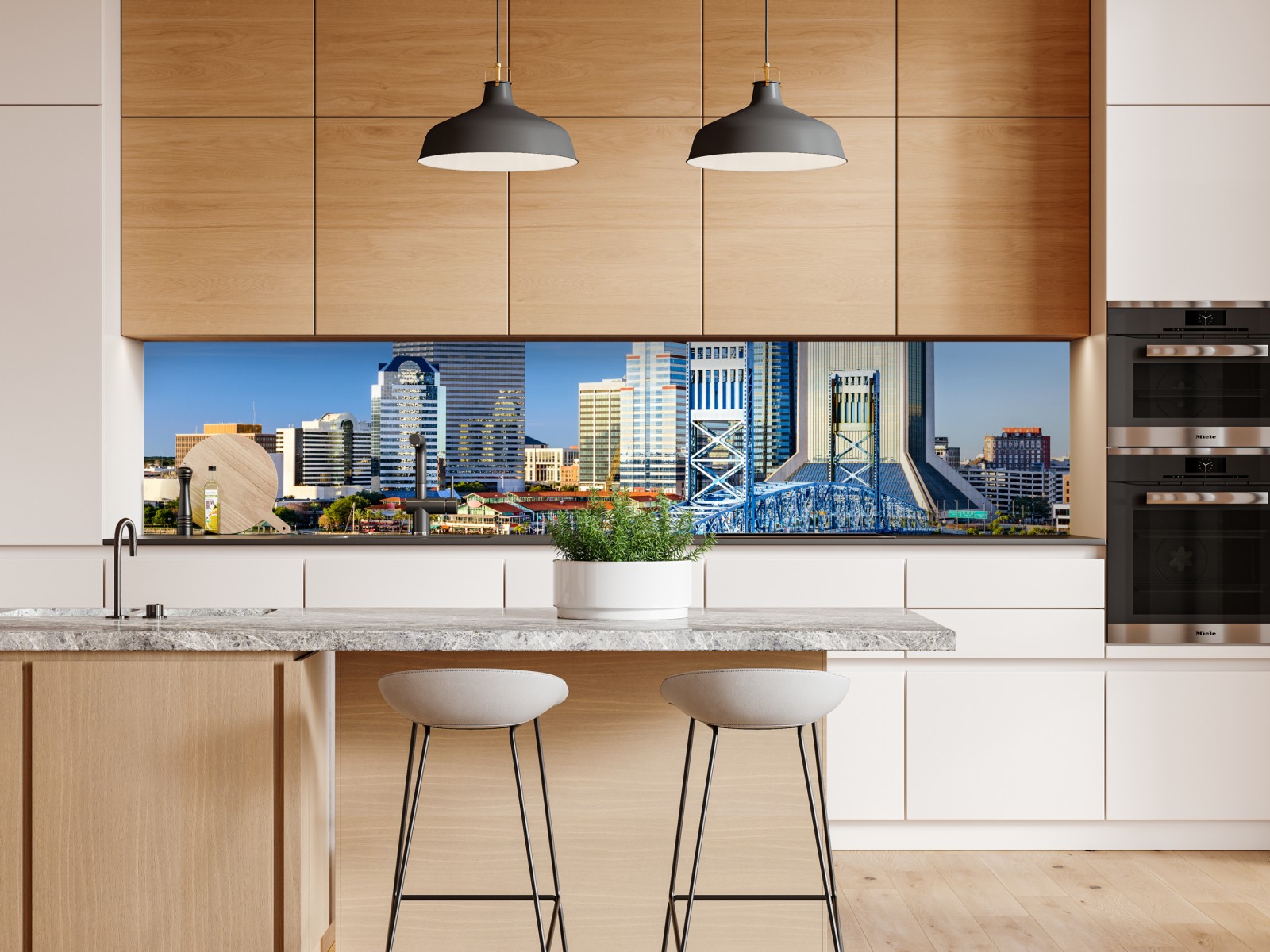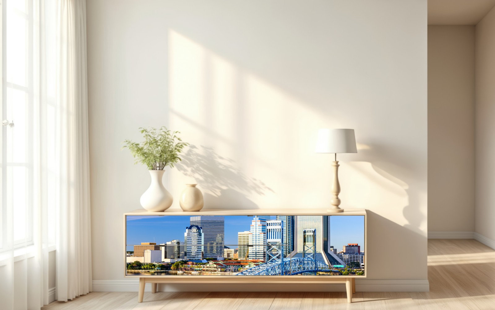 lebendige panoramaansicht der innenstadt von Jacksonville am St. Johns River, perfekt um urbanes flair in jeden raum zu bringen.