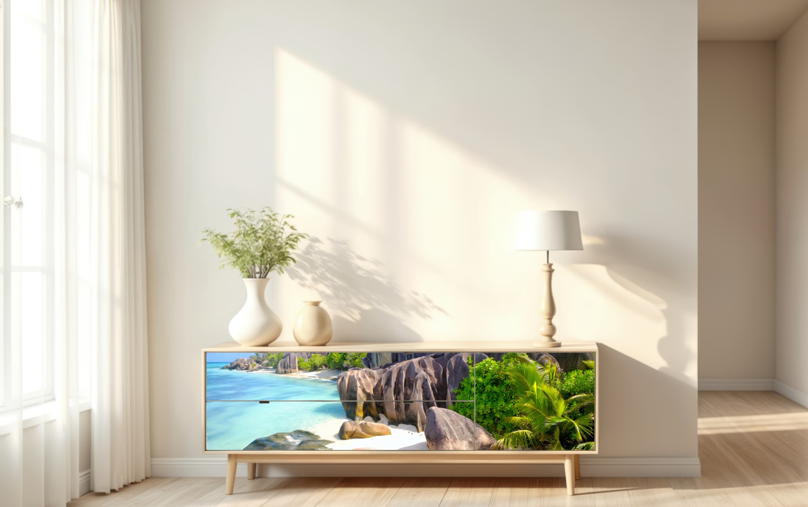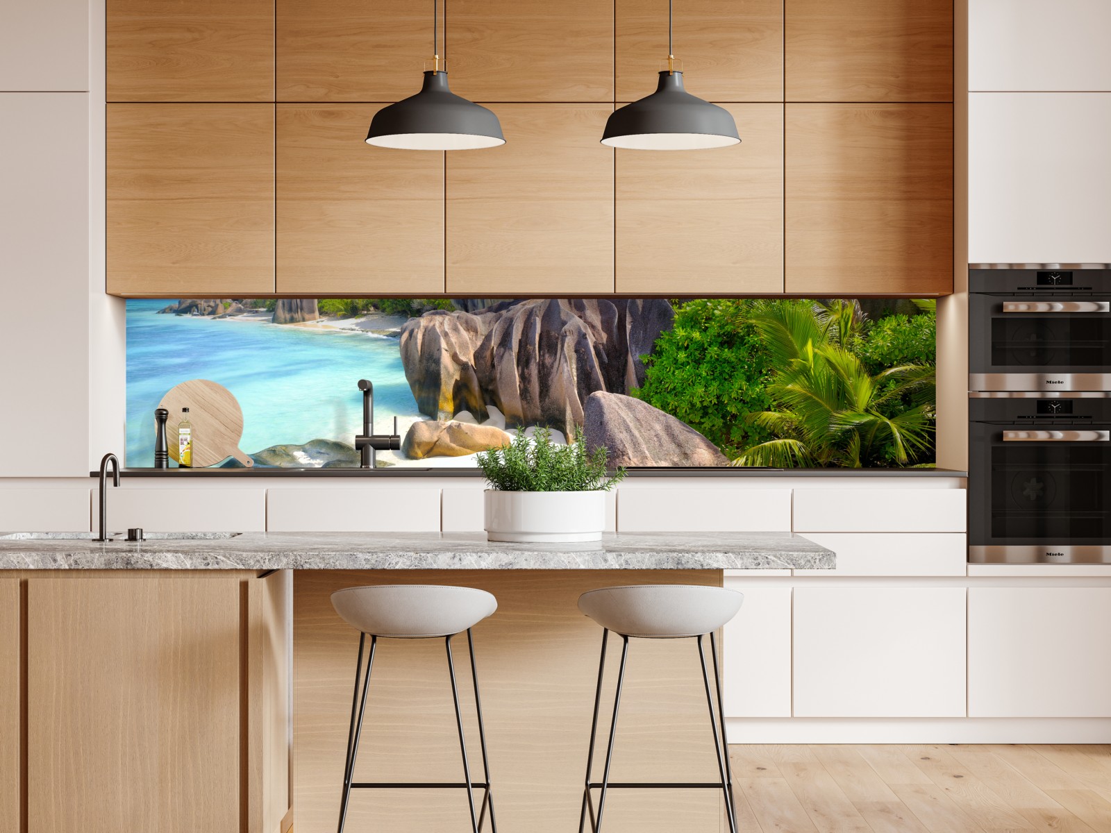 Bringen Sie die ruhige Schönheit von Anse Source d'Argent in Ihr Zuhause mit diesem lebendigen Bild, das türkisfarbenes Wasser, geformte Granitfelsen und üppige Palmen zeigt.