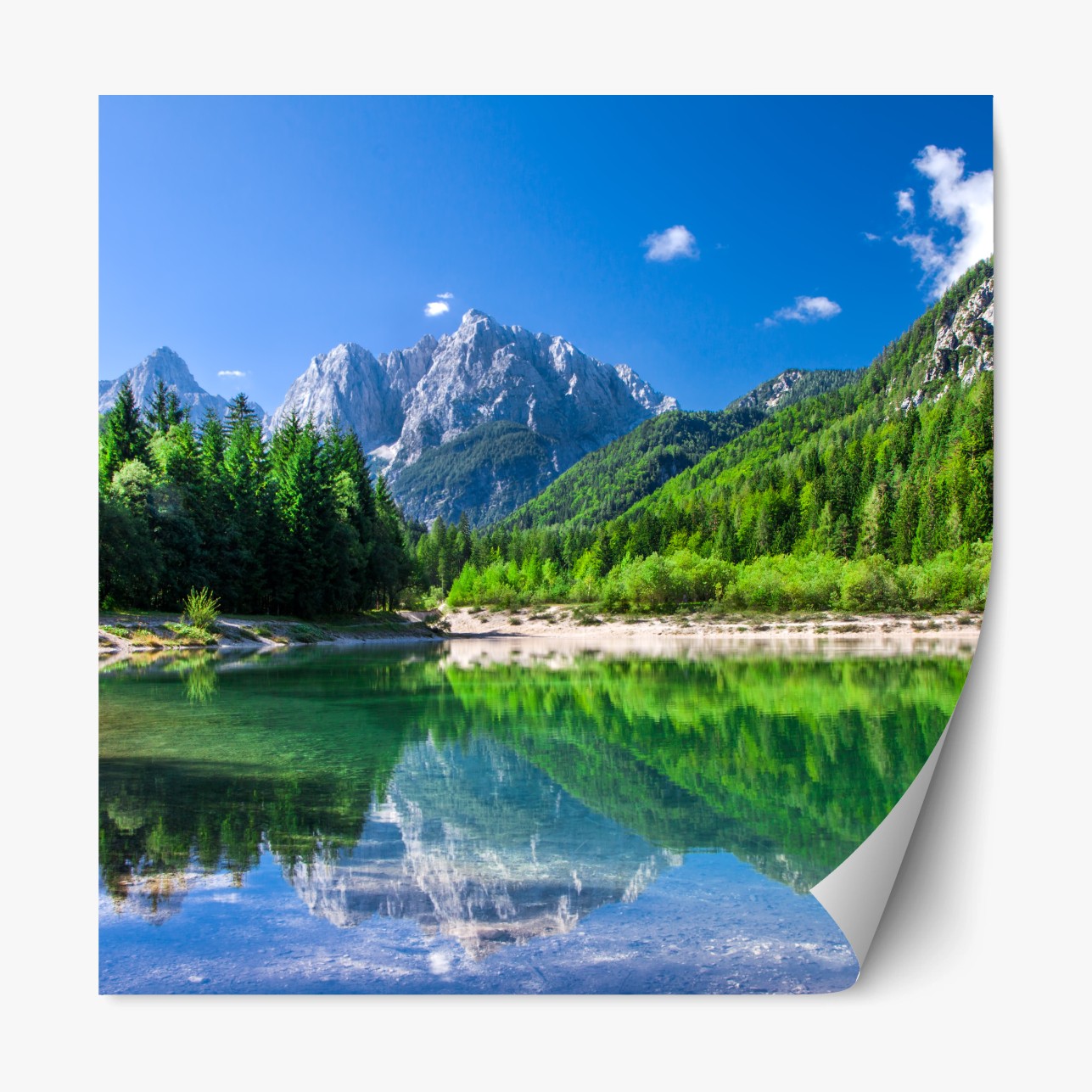 Repositionierbarer Aufkleber Alpiner see mit spiegelung in grünen bergen