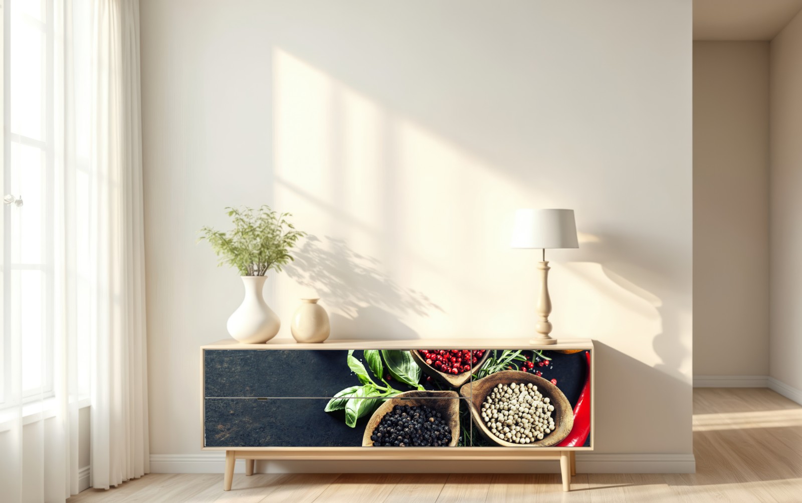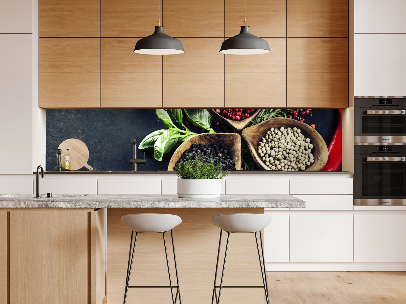 Bringen Sie den Duft der Küche an die Wand mit dieser lebendigen Anordnung aus Gewürzen und frischen Kräutern, ideal um Wärme und Geschmack ins Zuhause zu bringen.