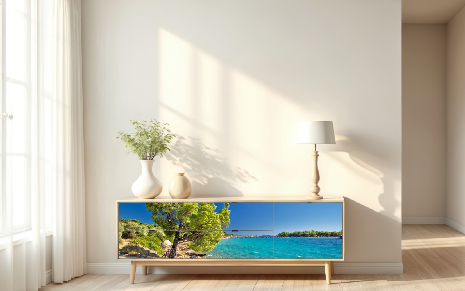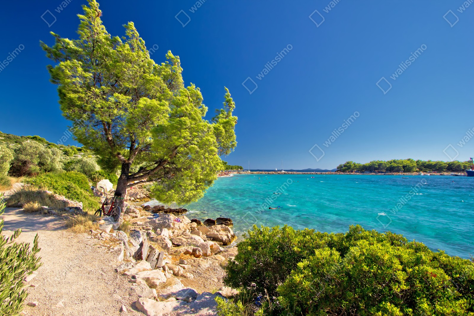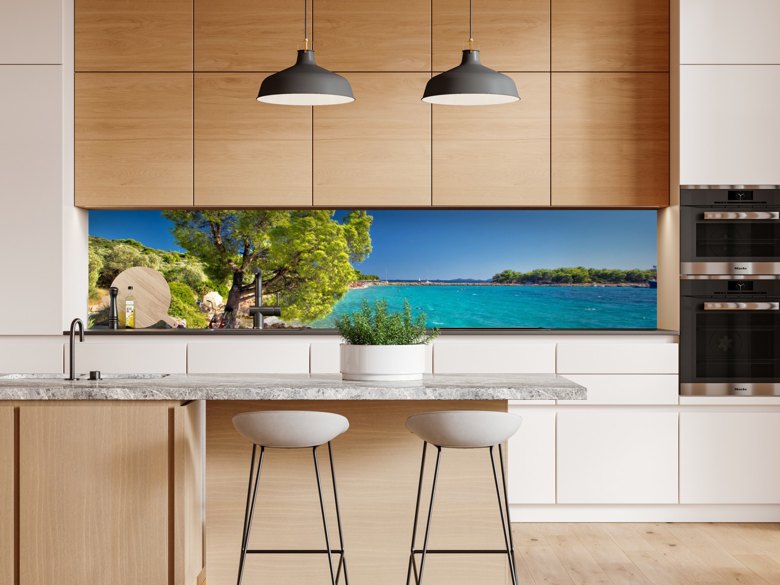 Bringen Sie die beruhigende Energie der Adria in Ihr Zuhause mit diesem lebendigen Foto der türkisfarbenen Gewässer und sonnenbeschienenen Küste von Murter, ideal zum Aufhellen jedes Raums.