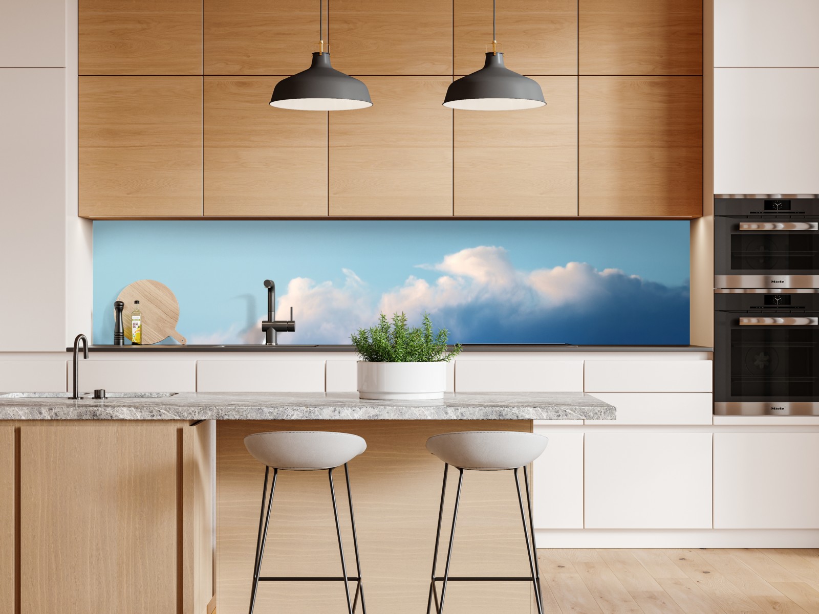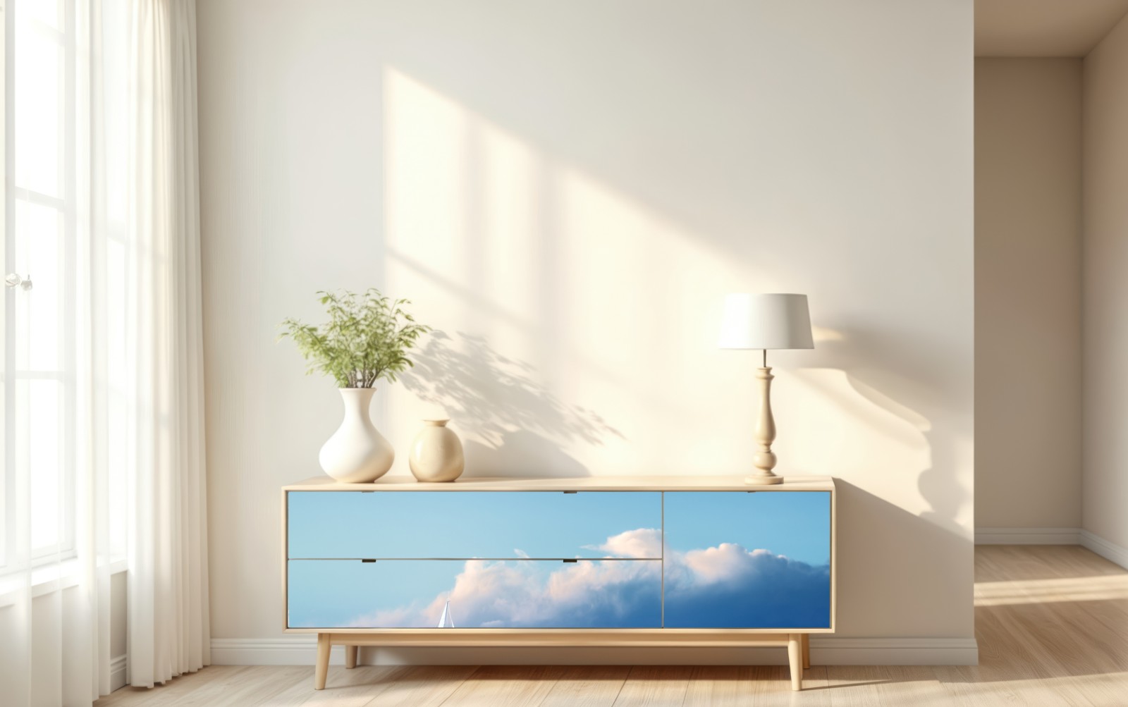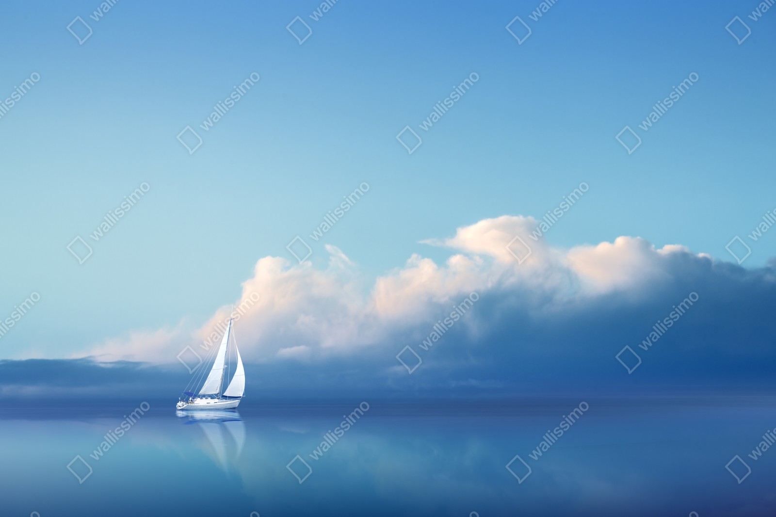 Ein ruhiges Segelboot gleitet über ein spiegelglattes blaues Meer unter weichen Wolken und schafft eine entspannte maritime Atmosphäre im Raum.