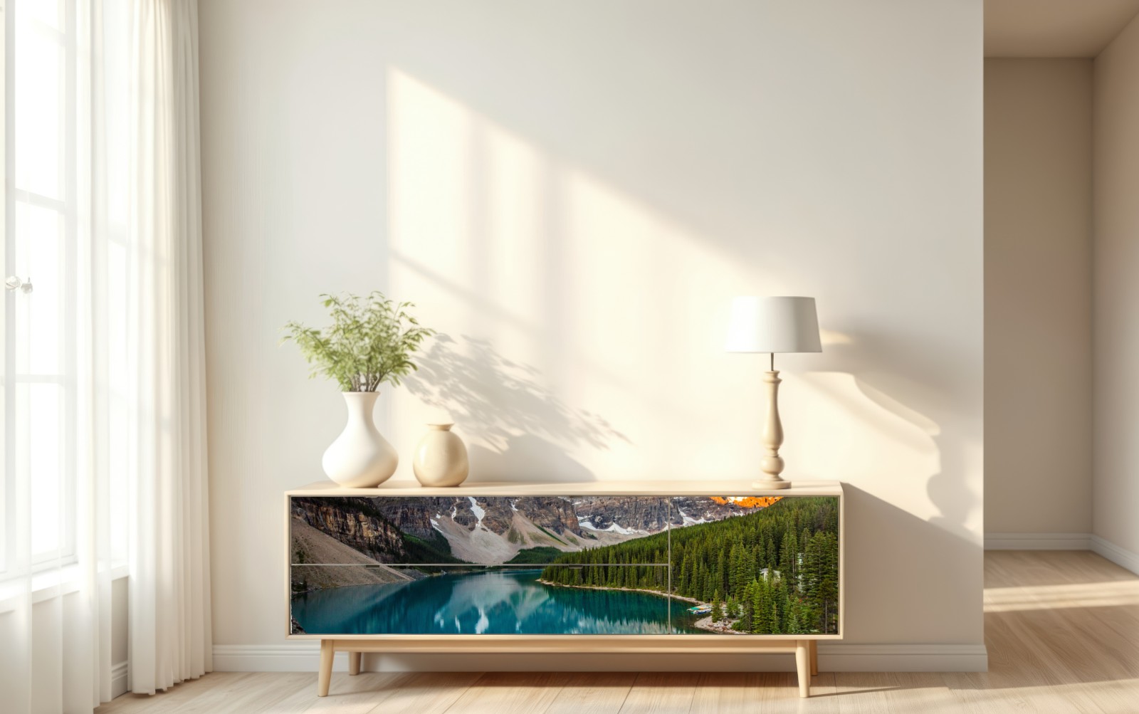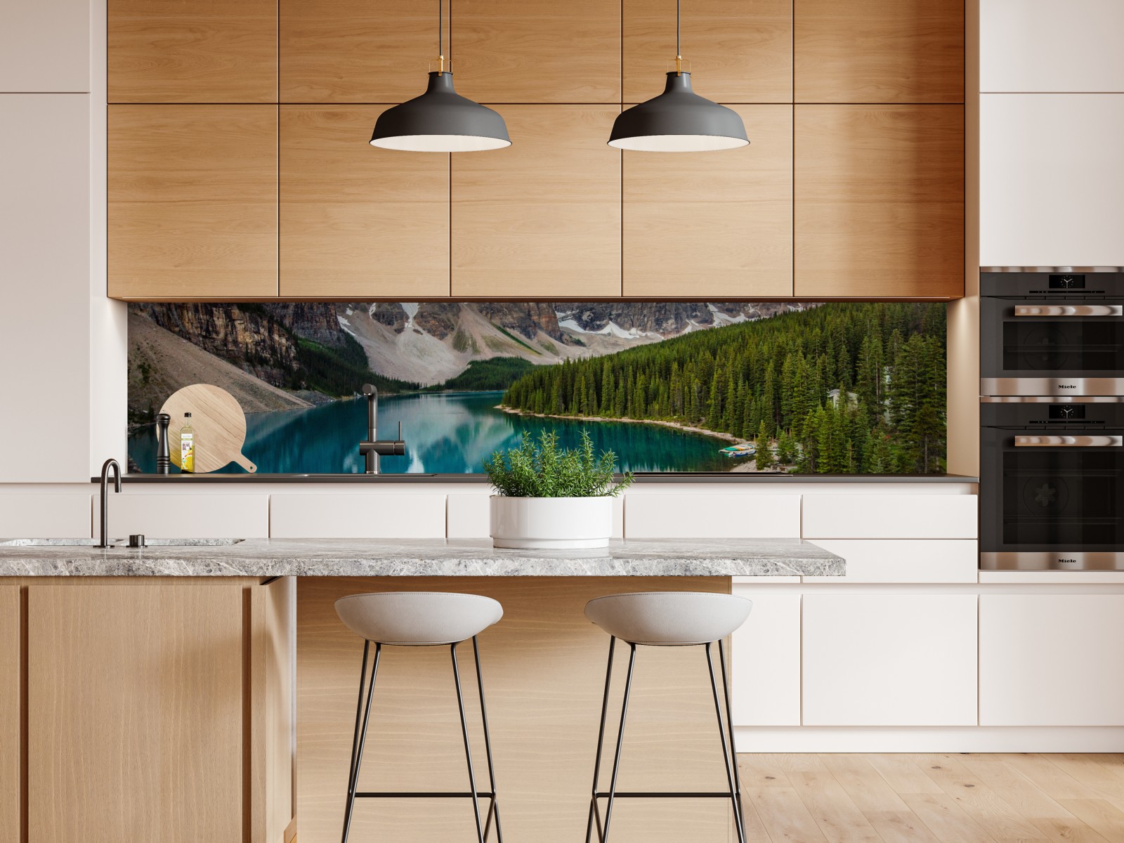 Atemberaubender Panoramablick auf einen Alpensee und schroffe Gipfel, die sich in klarem türkisfarbenem Wasser spiegeln und Ruhe sowie natürliche Schönheit in Ihren Raum bringen.