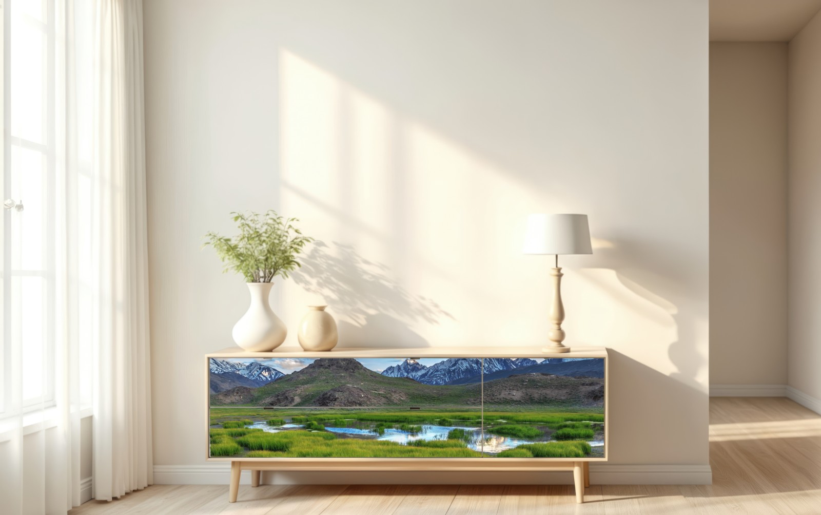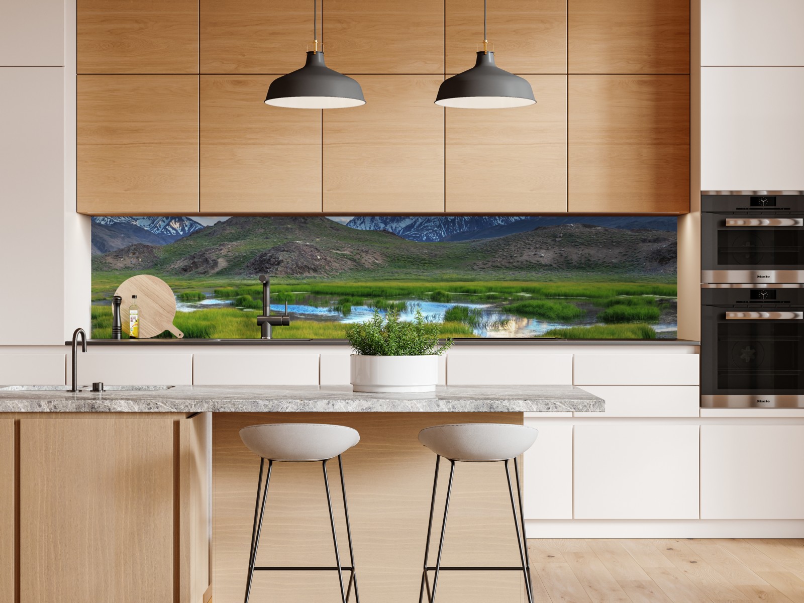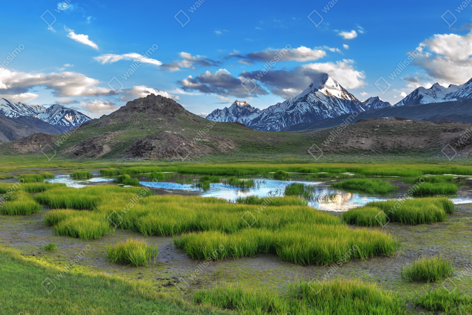 bringt ruhe ins zuhause mit einem stillen bergsee im Himalaya vor schneebedeckten gipfeln und grünen wiesen, ideal für naturnahe dekoration.