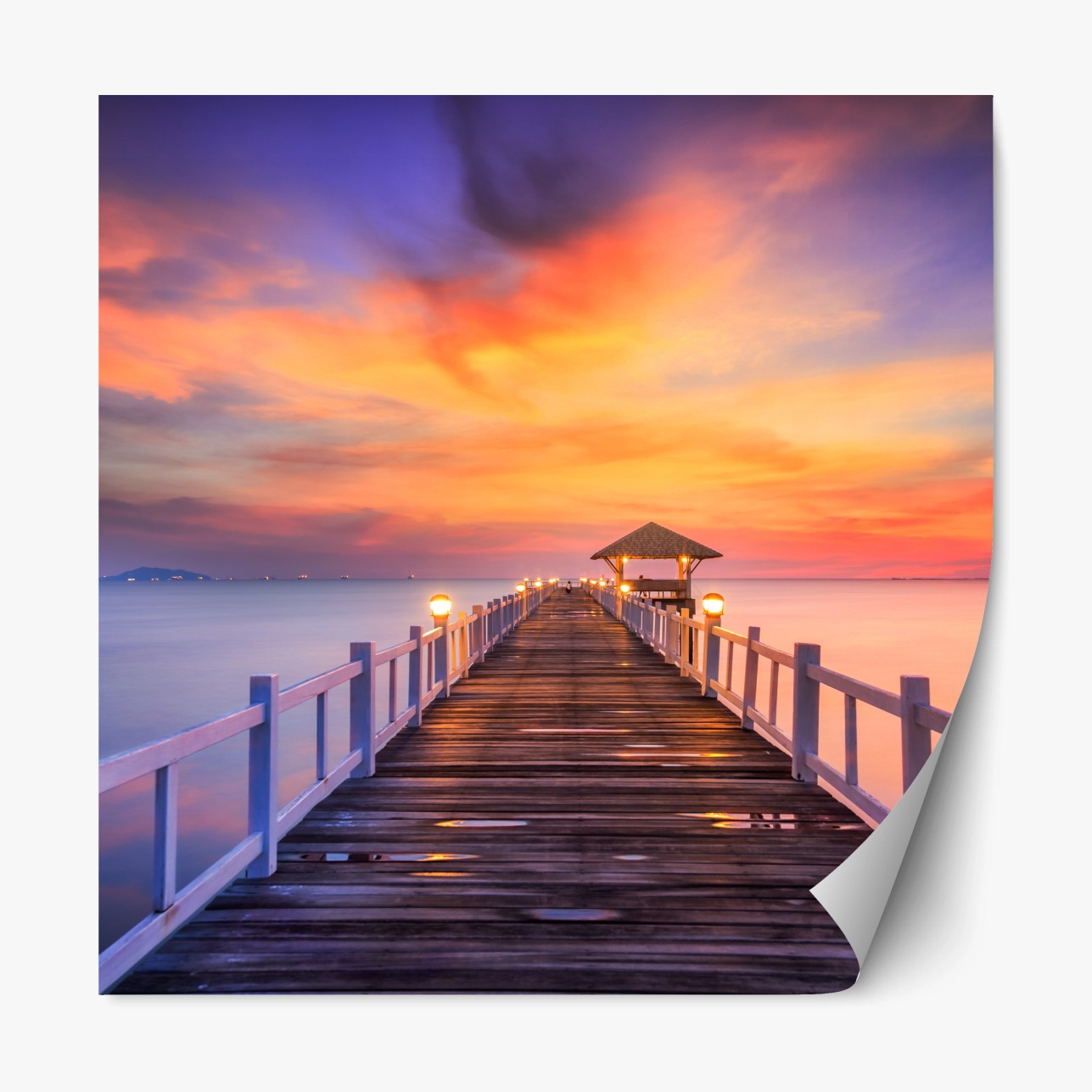 Repositionierbarer Aufkleber Holzsteg im sonnenaufgang