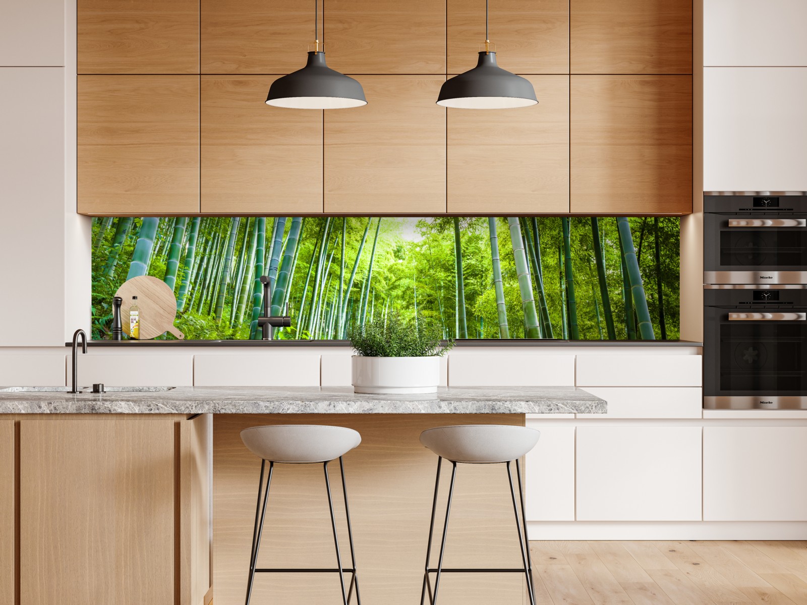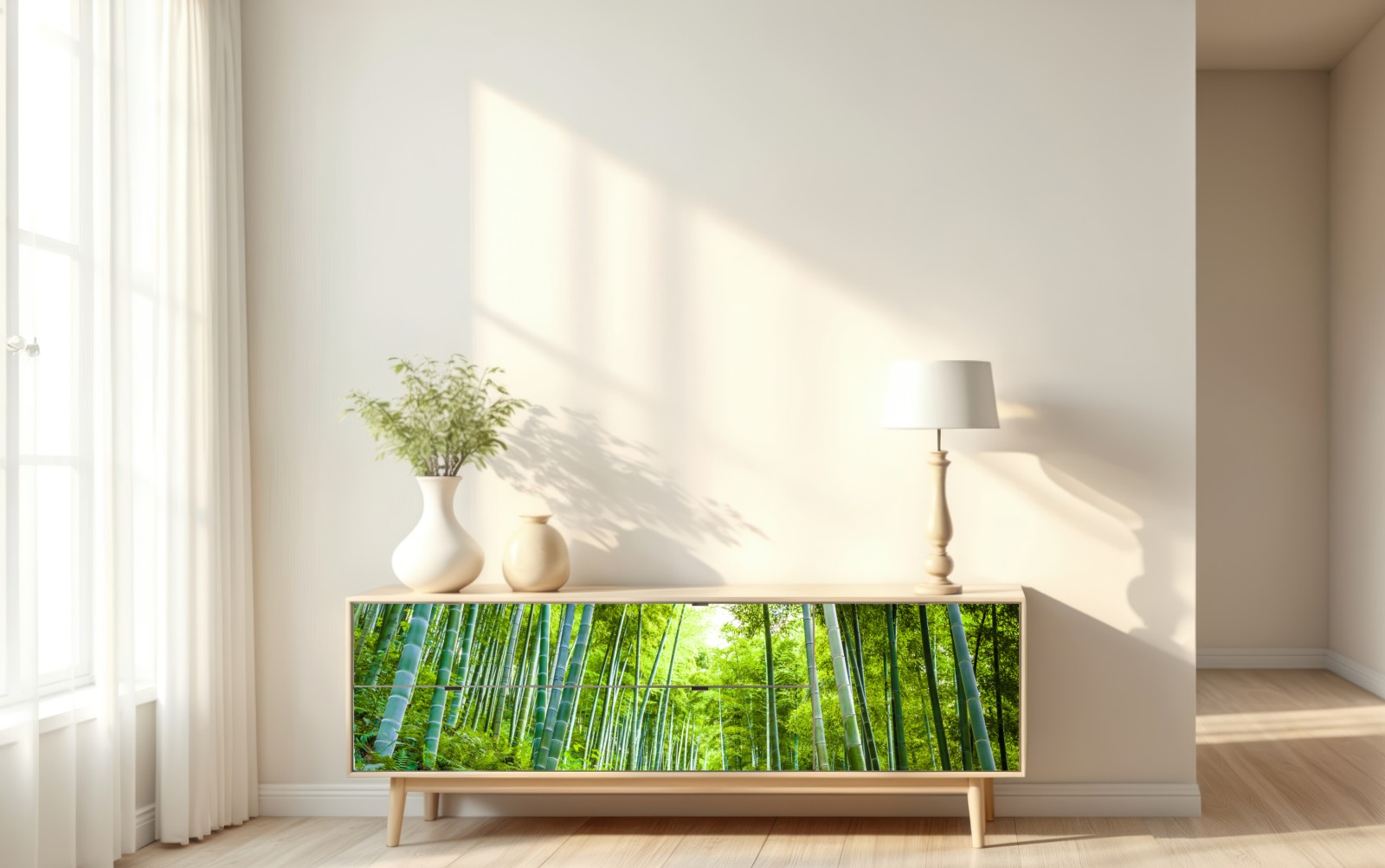 Ein ruhiger Bambuswaldweg bringt beruhigende Grüntöne und natürliche Tiefe in jeden Raum und eignet sich perfekt, um eine entspannende, biophile Atmosphäre zu schaffen.