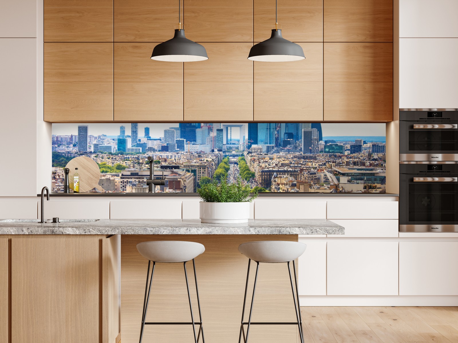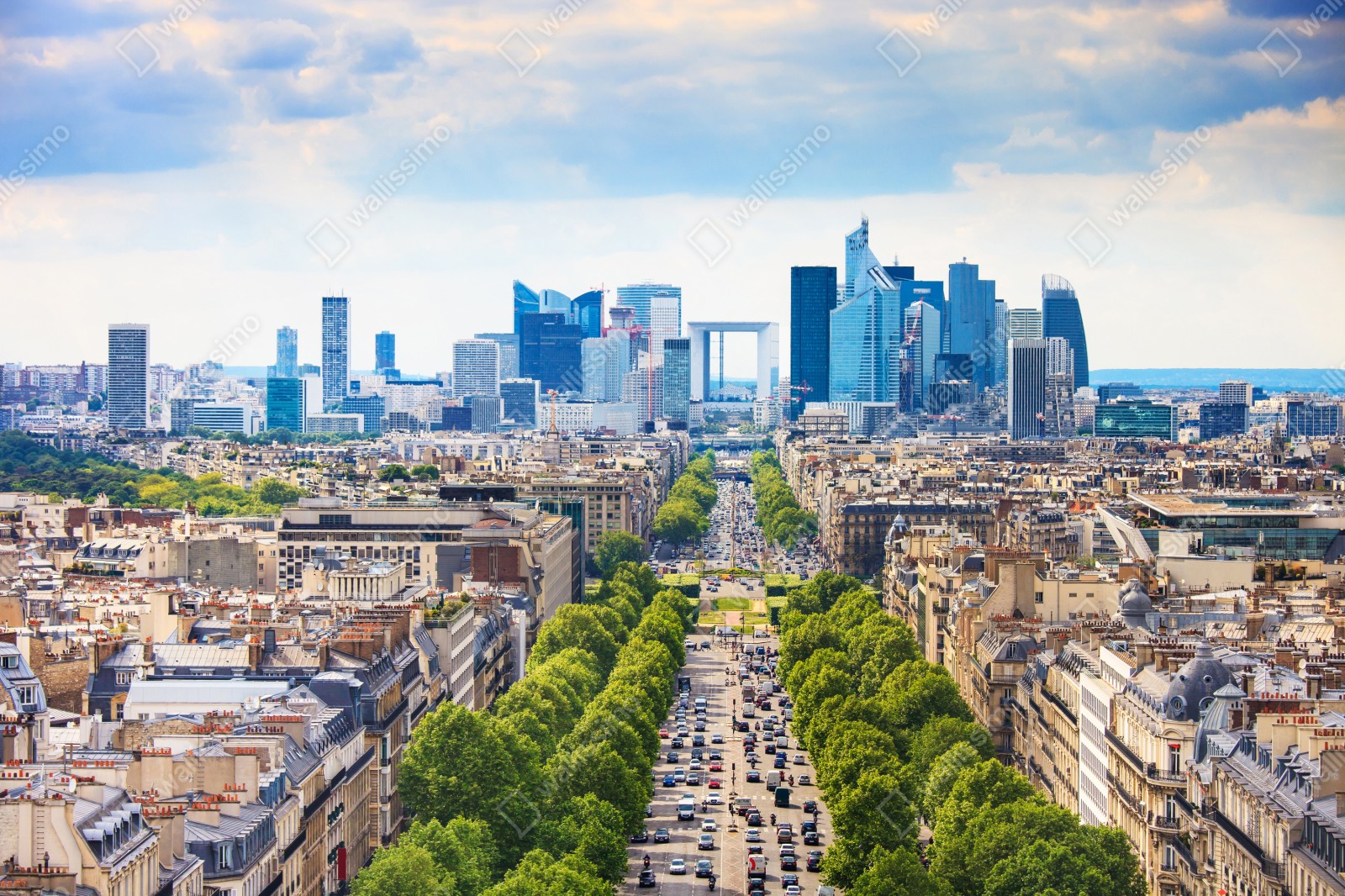 Atemberaubende Panoramaansicht von Paris mit einer baumgesäumten Allee, die zu modernen Wolkenkratzern führt, ideal für stilvolle Wanddekorationen.