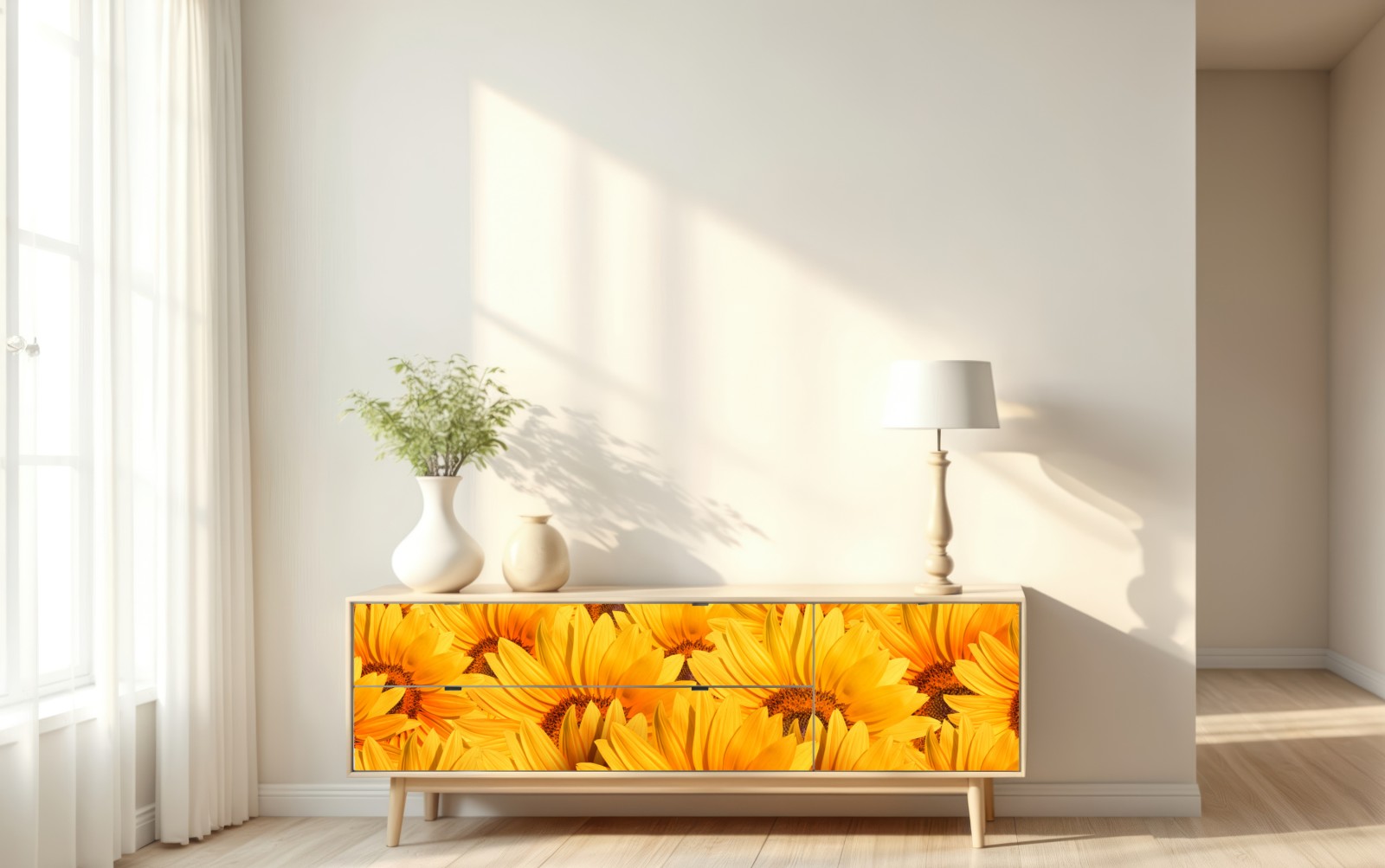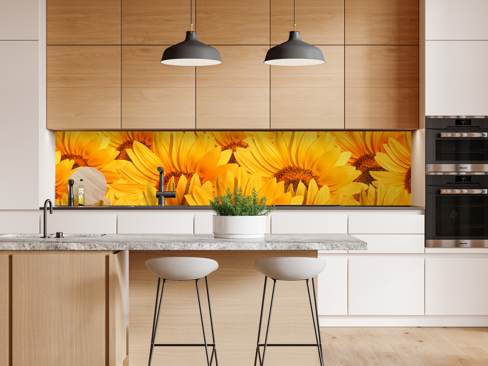 Helle goldene Sonnenblumen schaffen ein warmes, stimmungsaufhellendes Muster, das natürliche Energie in jeden Raum bringt.