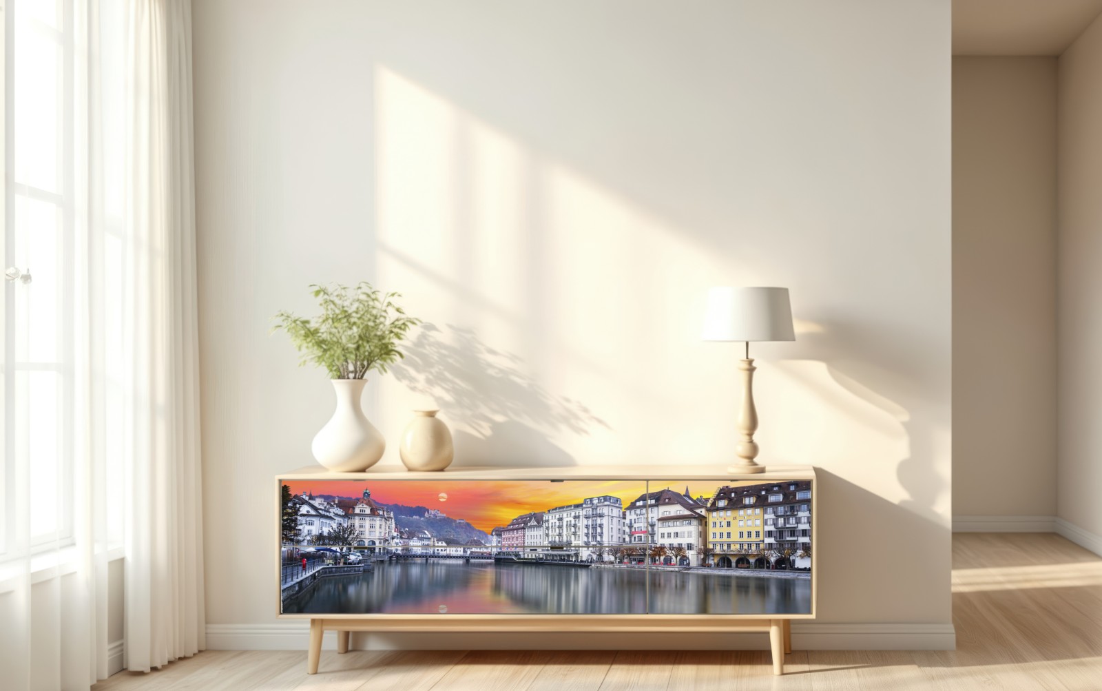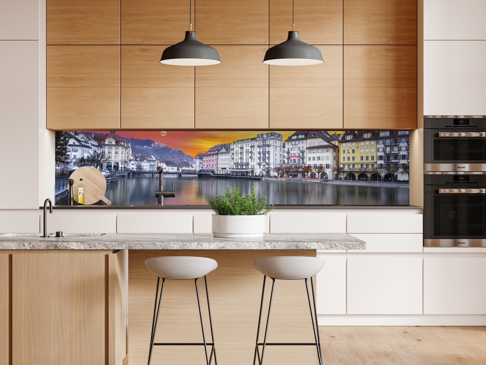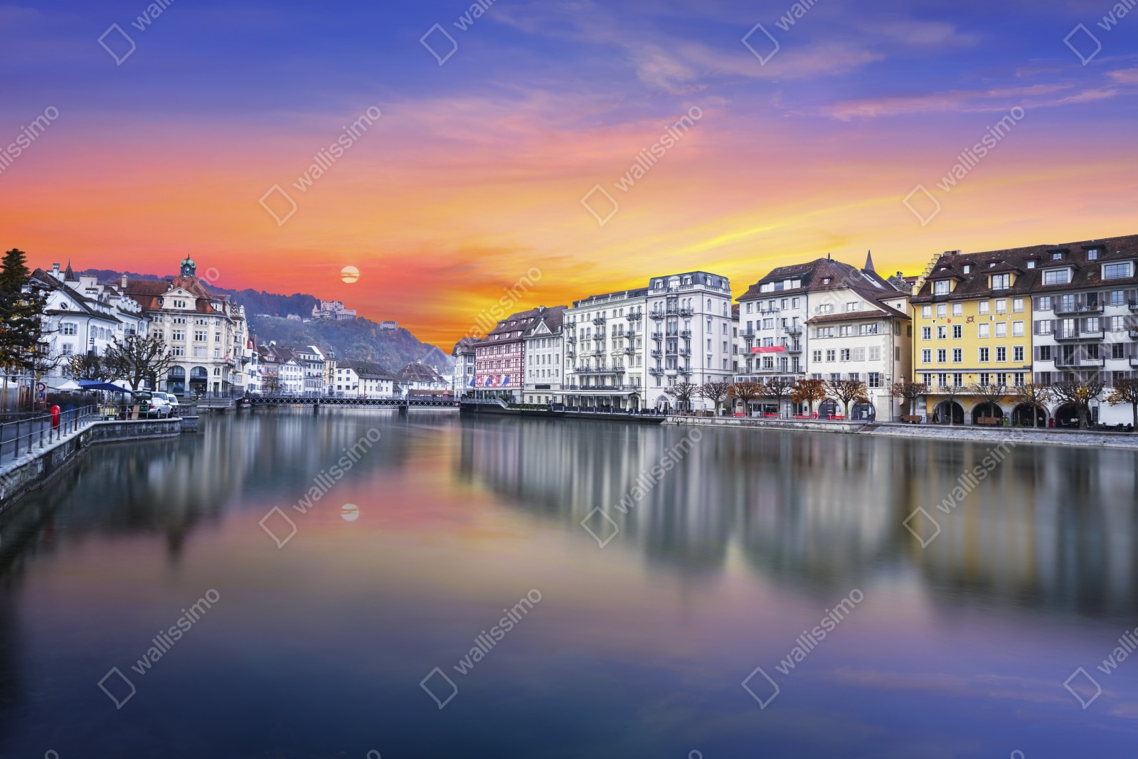 Panoramablick auf die Reuss in Luzern bei Sonnenuntergang mit lebendigen Reflexionen und historischer Uferarchitektur, ideal zur Verschönerung von Wohnräumen.