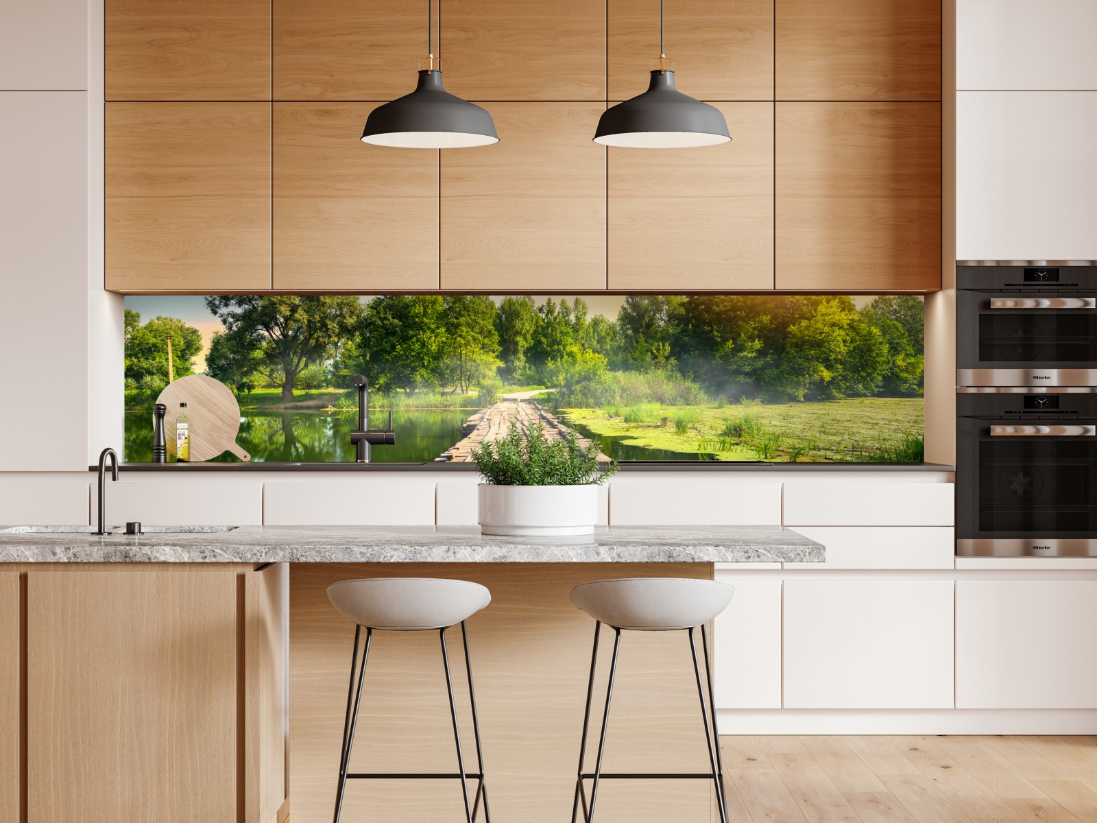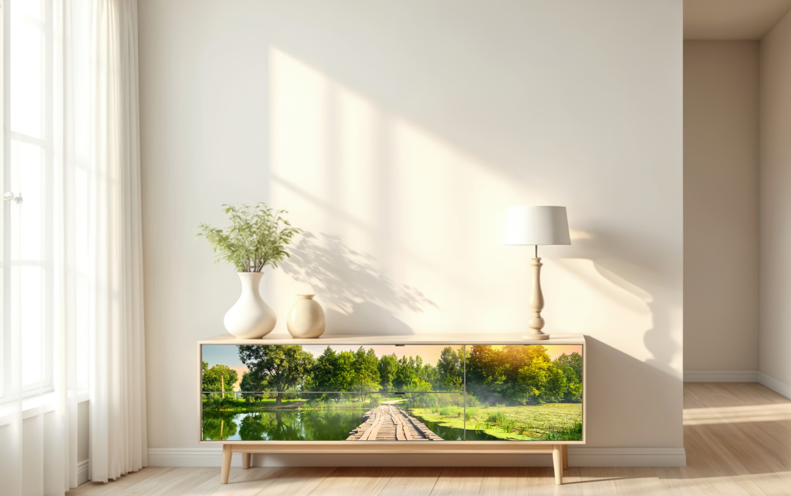 Eine ruhige Landschaft mit einer sonnenbeschienenen Holzbrücke über einem spiegelnden See bringt natürliche Gelassenheit und entspannende Atmosphäre in jeden Raum.