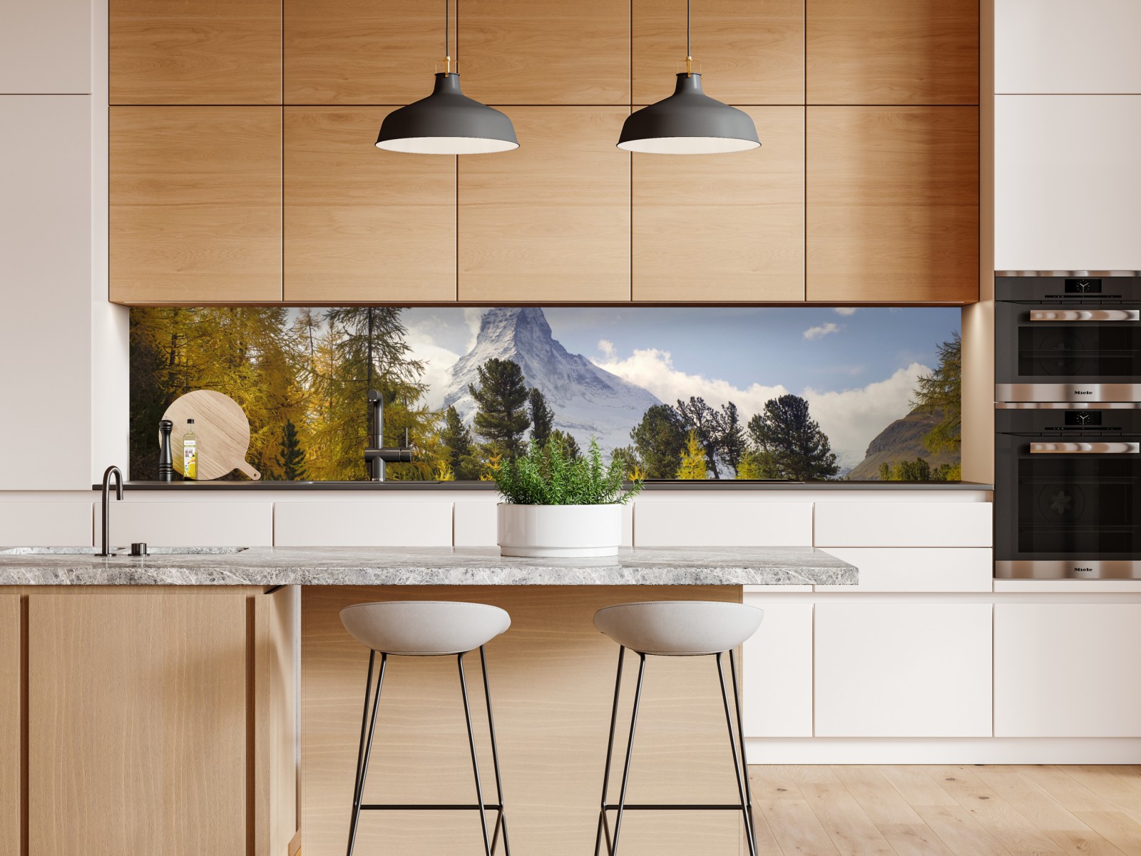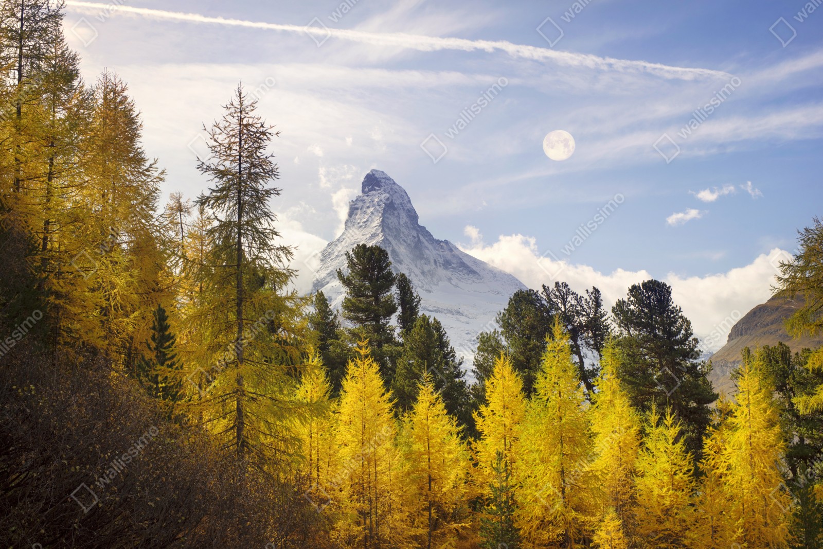Atemberaubende herbstliche Szenerie mit goldenen Lärchen, die den schneebedeckten Gipfel des Matterhorns einrahmen und alpenhafte Ruhe in Ihren Raum bringen.