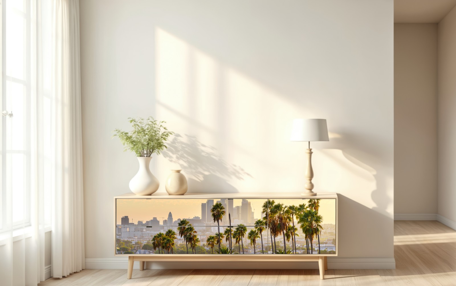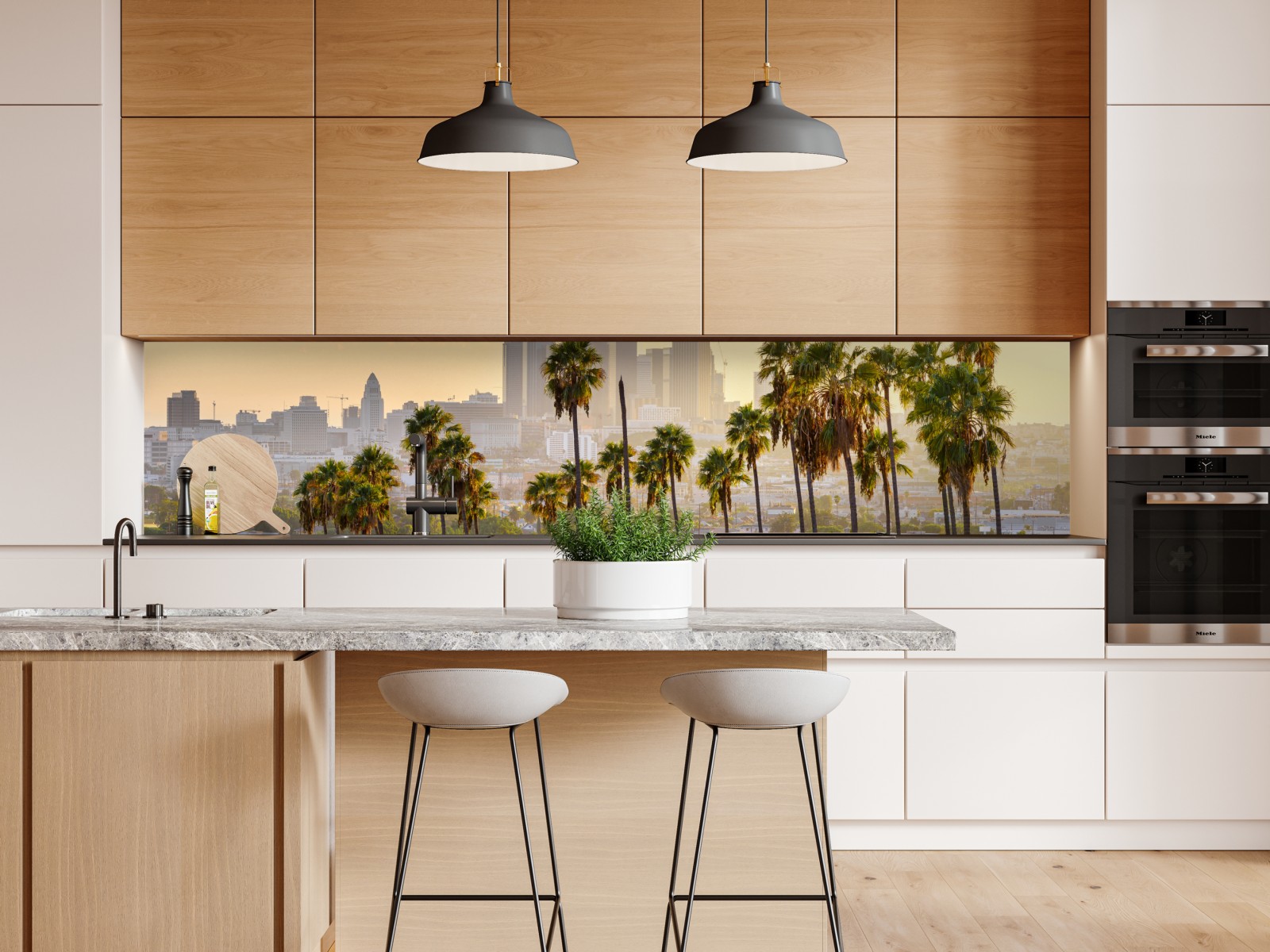 Warme goldene Stunde über der Skyline von Los Angeles, eingerahmt von hohen Palmen, die urbanen Flair und entspannte Küstenstimmung an jede Wand bringt.